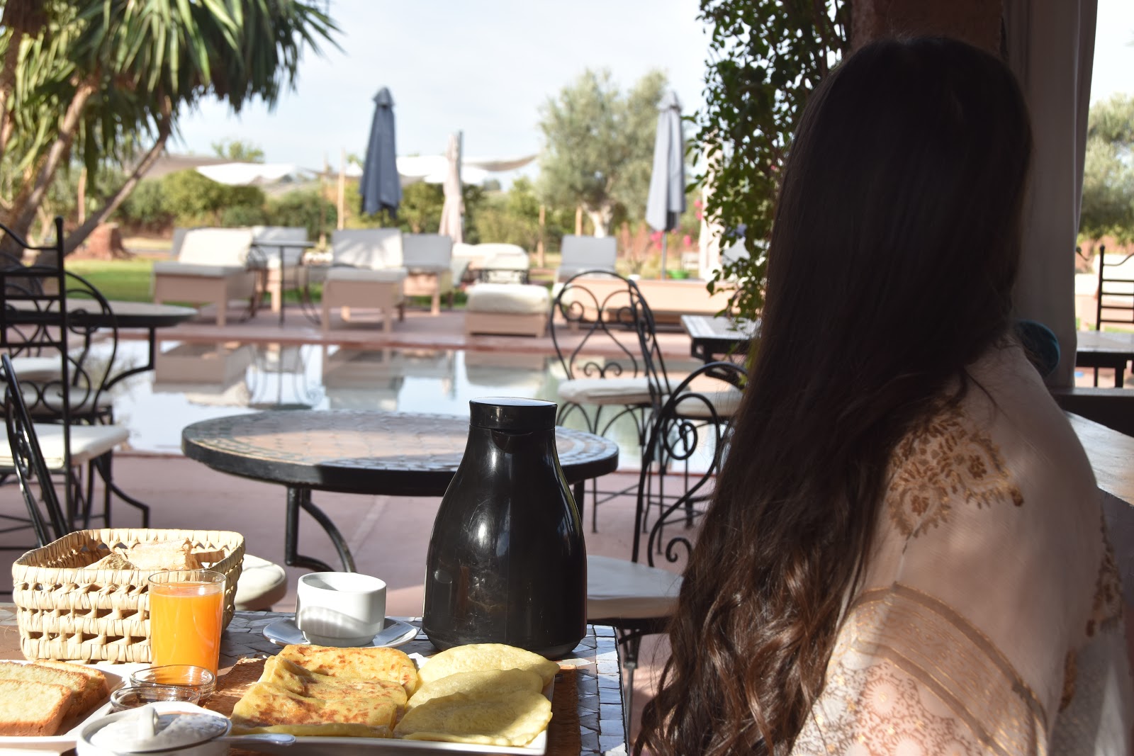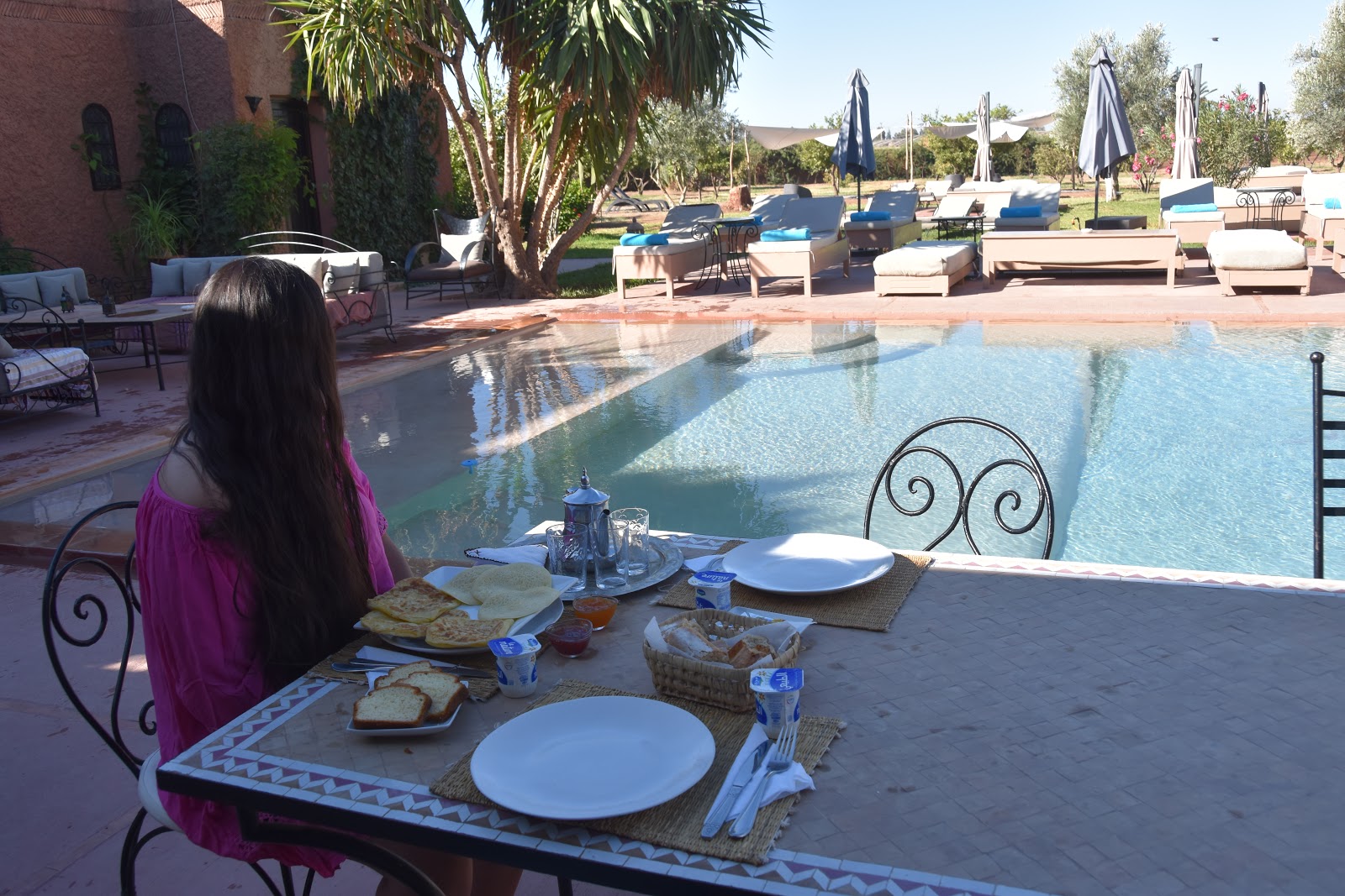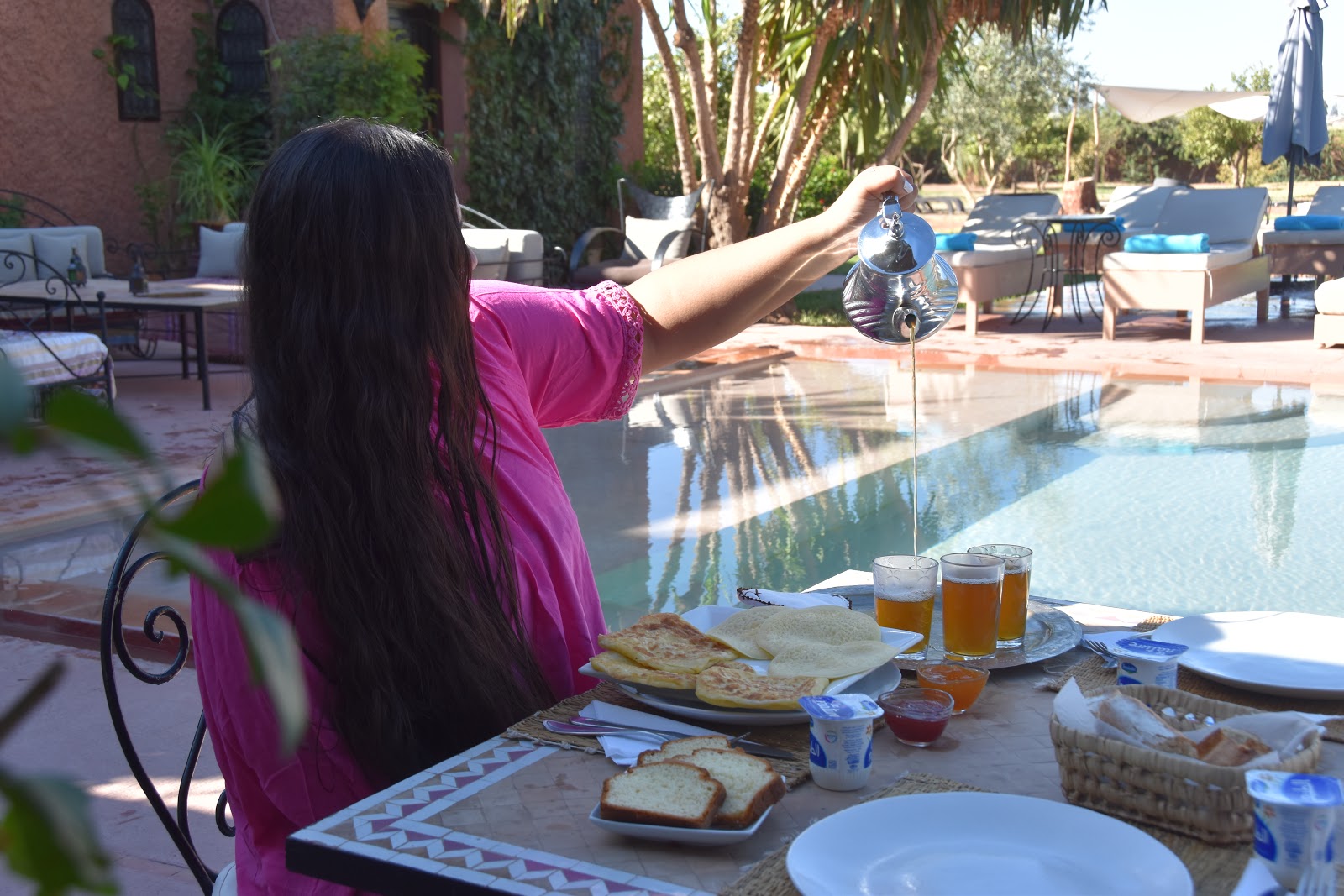 Petit-déjeuner à la Marocaine, la Villa KOSY propose un petit-déjeuner marocain composé de Msemen, de Beghrir, de pain chaud, accompagné de confiture, de miel, du beurre. Tout est frais et fait maison et ca se ressent dès les premières bouchées, on se régale ! Pour les amateurs de jus, vous serez ravies de découvrir le jus d’orange préssée. Il y a aussi des yaourts et du fromage pour les gourmets au réveil ! Ce petit-déjeuner marocain se déguste au bord de la sublime piscine de la Villa KOSY, c’est tout simplement parfait pour débuter une belle journée après une bonne nuit de sommeil. De plus, le chant des oiseaux vous accompagneront lors de votre petit-déjeuner !