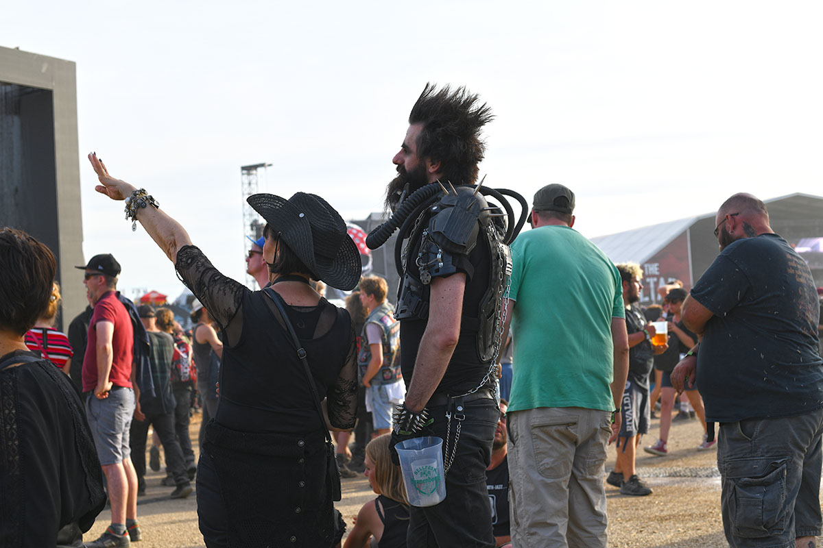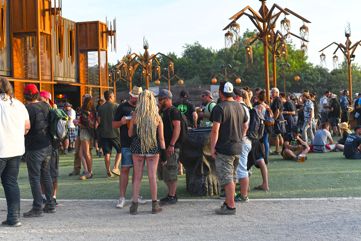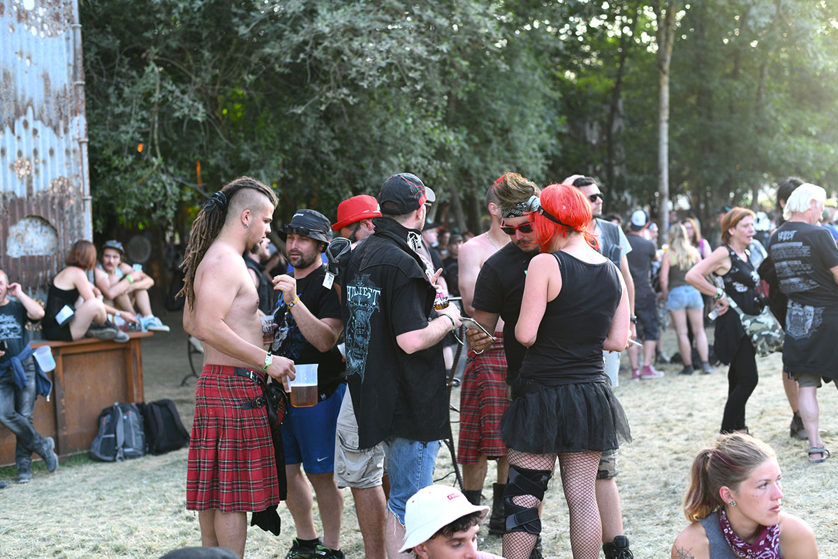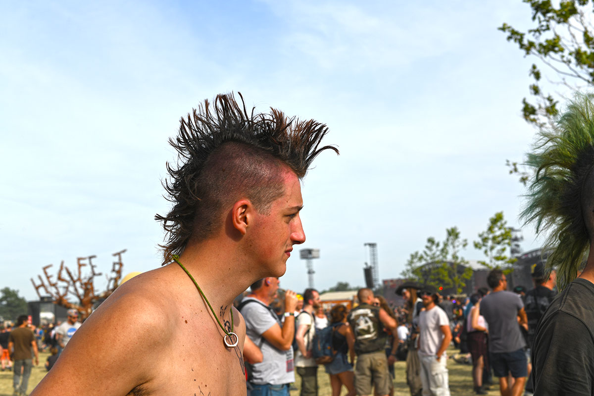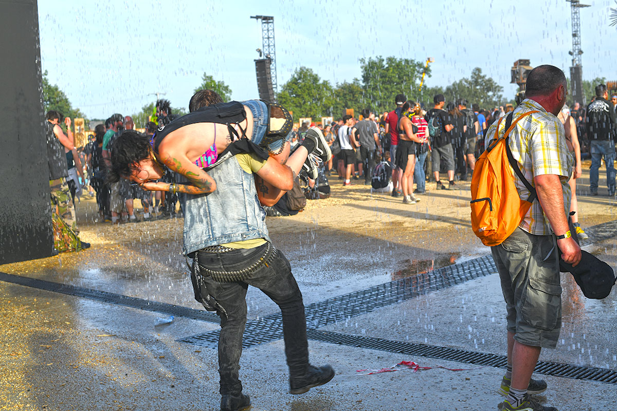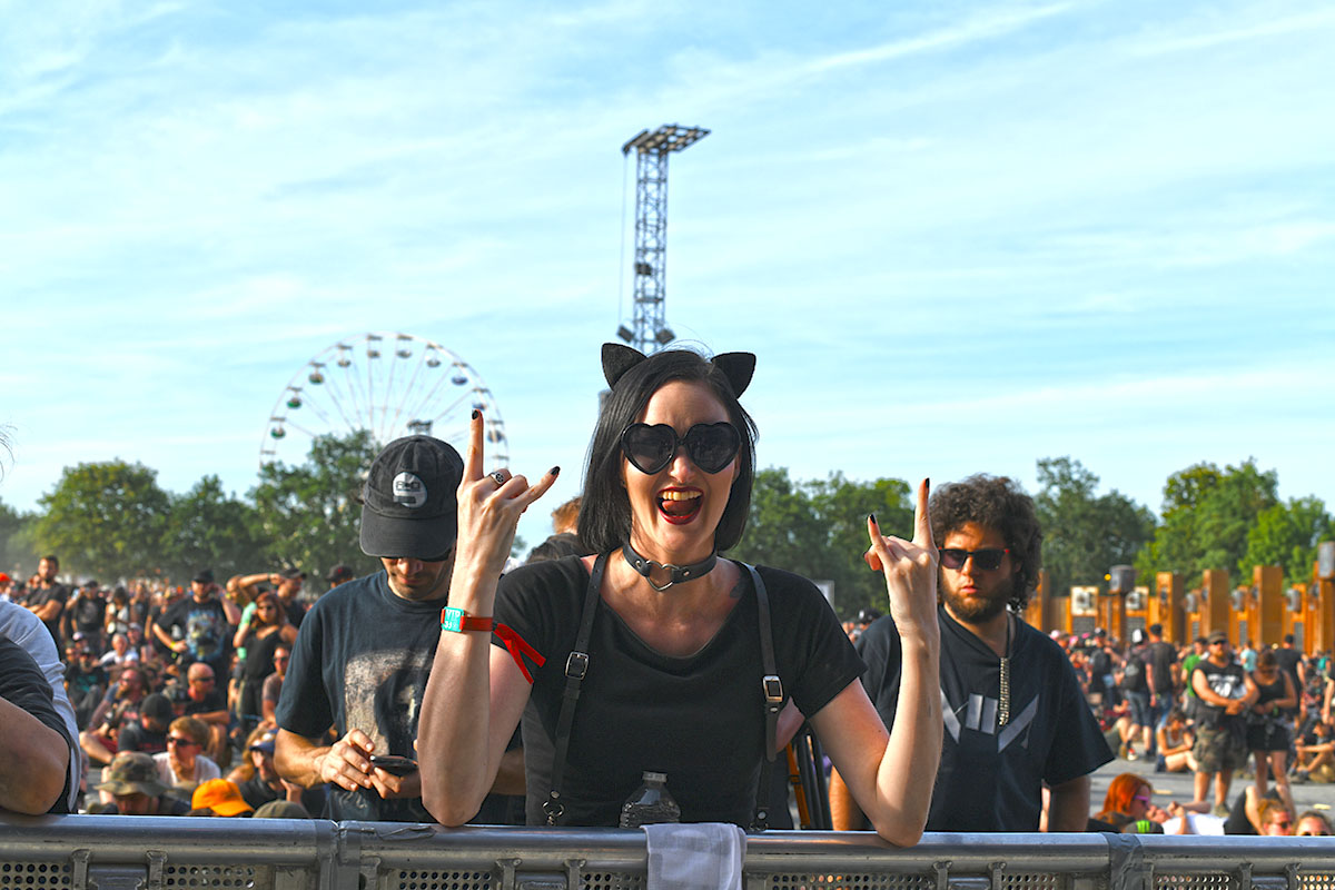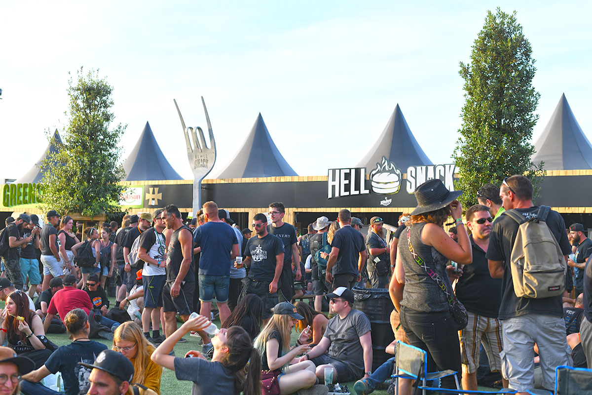 Des dizaines de milliers de métalleux et d’amateurs de musiques extrêmes se sont retrouvés vendredi en « pèlerinage annuel » à Clisson, (Loire-Atlantique). C’est un très grand show, plus que de la musique c’est un vrai spectacle vivant qui s’enchaîne pendant tout le week-end : pyrotechnie, en plus d’un décor digne des plus grands parcs d’attractions. Containers servant de bars, guitare à l’entrée, croix et sculptures géantes, tout est en métal, à l’exception de quelques bancs en forme d’os et de poubelles têtes de morts en pierre.  Les festivaliers en prennent pleins les oreilles mais aussi pleins les yeux pendant ces 3 jours de rêve. Ils sont aussi acteur de ce festival, des jeunes, des moins jeunes, habillés en noir, déguisés, maquillés vêtu des traditionnels tee-shirts noirs à l’effigie de gloires du metal aux cornes à bière accrochées à la ceinture.