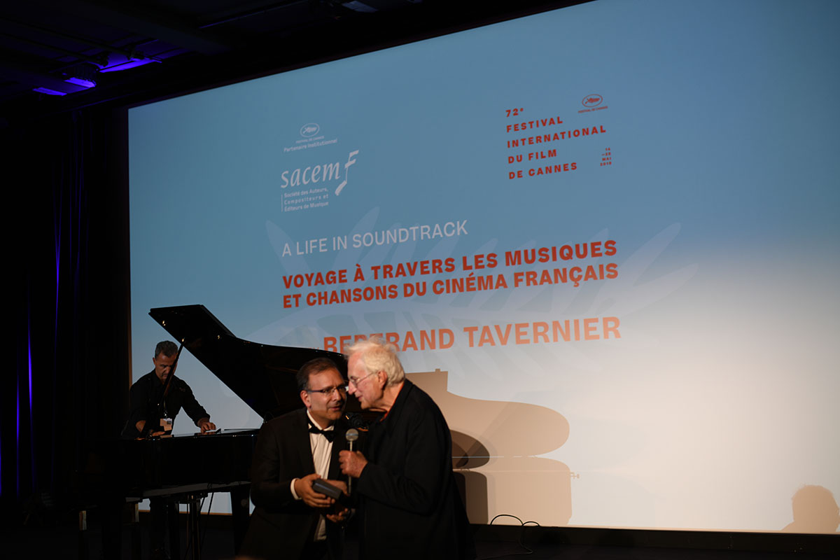 Cette année, la Sacem et le Festival de Cannes distinguent une personnalité, documentariste, cinéaste, journaliste, directeur d’institution ou encore directeur de collection phonographique pour son engagement pour la musique de film et les compositeurs. Le réalisateur Bertrand Tavernier a reçu avec émotion le prix de la Sacem et du Festival de Cannes ce lundi. Ce prix félicite son engagement et son travail de metteur en scène de plus de 30 longs-métrages. Bertrand Tavernier a présenté en avant-première un nouvel épisode de son « Voyage à travers le cinéma français » consacré aux musiques et chansons du cinéma français, un chef d’œuvre très enrichissant qui met en lumière les compositeurs de musique de film. Cette projection inédite s’est suivie d’un mini-concert de Bruno Fontaine et Isabelle Georges. Par ces réalisations, le cinéaste historien du cinéma salue la composition musicale ancienne et à venir avec une œuvre très intéressante, à découvrir absolument.