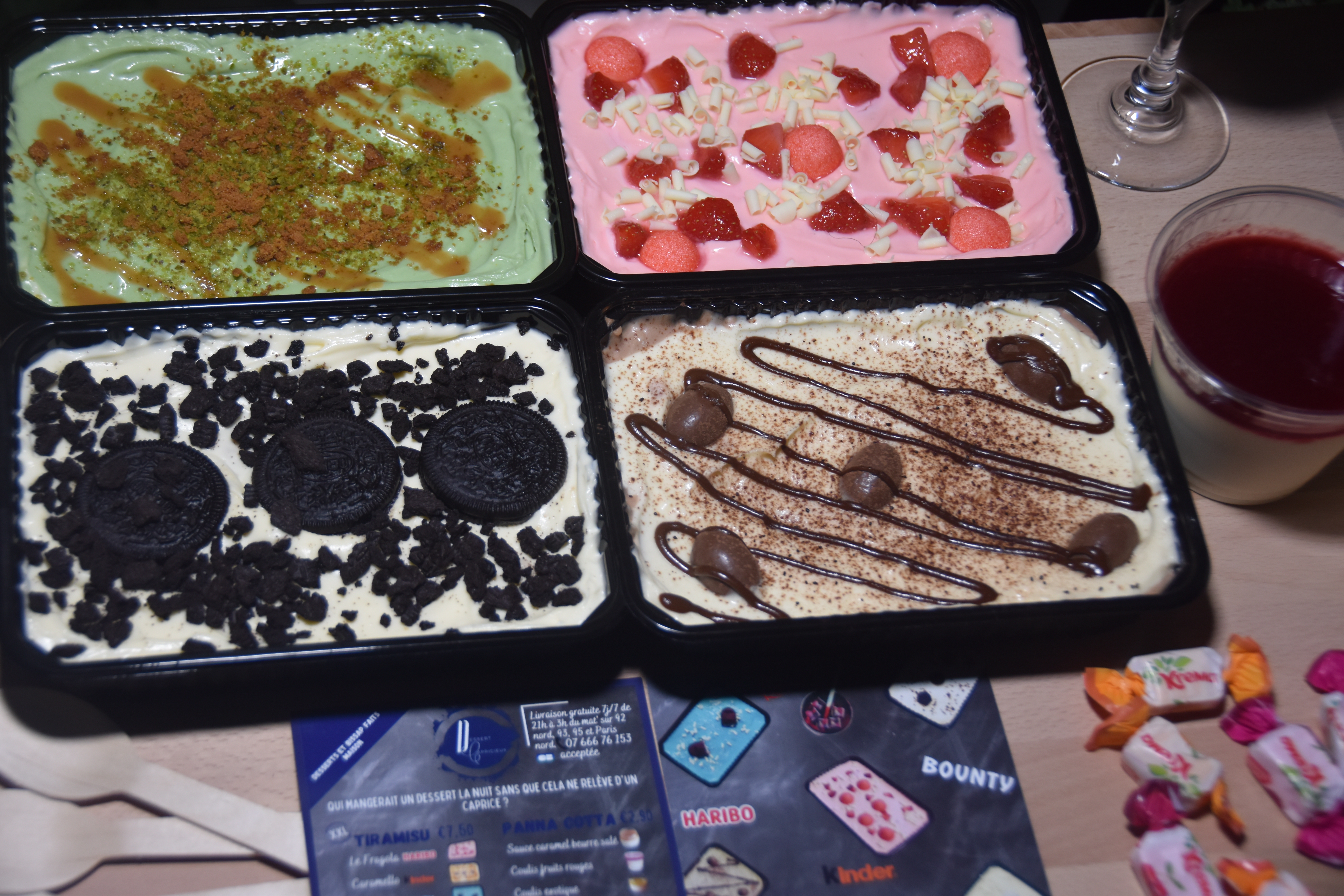 Éblouissez vos papilles avec des tiramisus avec dessertcapricieux ! Du choix, des goûts originaux, des gourmandises à consommer sans modération. Ces desserts uniques fait avec passion et amour pour éblouir vos papilles de bonheur ! dessertcapricieux livre de 21h à 3h du matin pour vos fringales nocturnes ou vos envies de gourmandises dans le 92, 93 et le 95. Chez dessertcapricieux, la devise est simple : ne vous prenez plus la tête, ils s’occupent de votre dessert ! Ces tiramisus XXL pour les gourmands sont tout simplement délicieux. Mention spéciale pour le tiramisu ultra-gourmand Le fragada. Pour les amateurs de fraises, vous allez être ravis, c’est un nuage de fraise à déguster ! J’ai beaucoup appréciée le pallina, chocolaté à souhait qui ravira les palais des plus petits et des plus grands. Mon coup de cœur le pistachio, une saveur bien originale que j’ai adoré ! Il était excellent et c’était la première fois que je goûtais un tiramisu à la pistache, c’est un délice sans fin. Le Signore’o va faire fondre les plus gourmands, il était délicieux. La panna cotta coulis fruits rouges était excellente, à la fois rafraîchissante et gourmande. En conclusion, dessertcapricieux vous régale avec des gourmandises à déguster sans modération : tiramisus ! Panna cottas ! Crumbles…