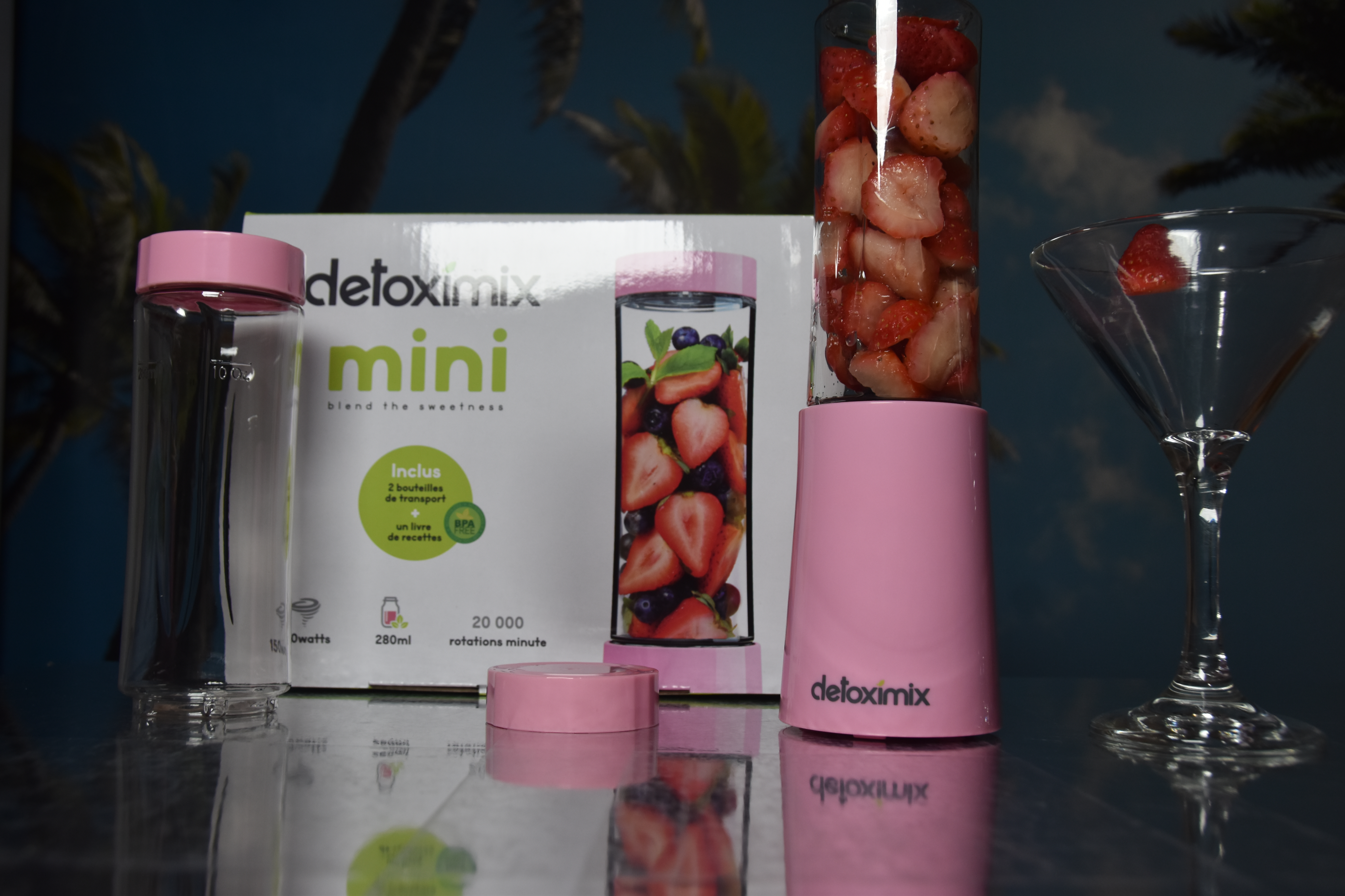 Il est livré avec 2 mugs de 280ml qui vous accompagneront partout. Facile à nettoyer et à ranger un mini livre de recettes vous guidera pour vos premières réalisations. Il n’est pas du tout encombrant puisqu’il ne prend pas plus de place qu’une bouteille d’eau et il est également très facile à transporter. Que ce soit pour le petit-déjeuner, le goûter ou en simple rafraîchissement, le Mini Blender Detoximix est ce qu’il vous faut pour éblouir vos papilles !