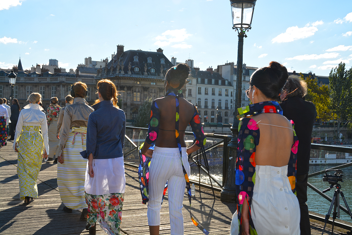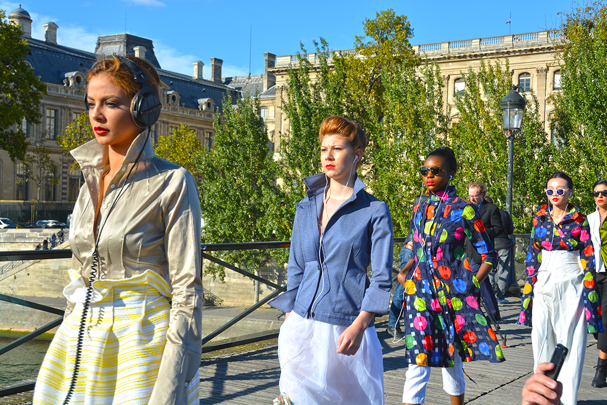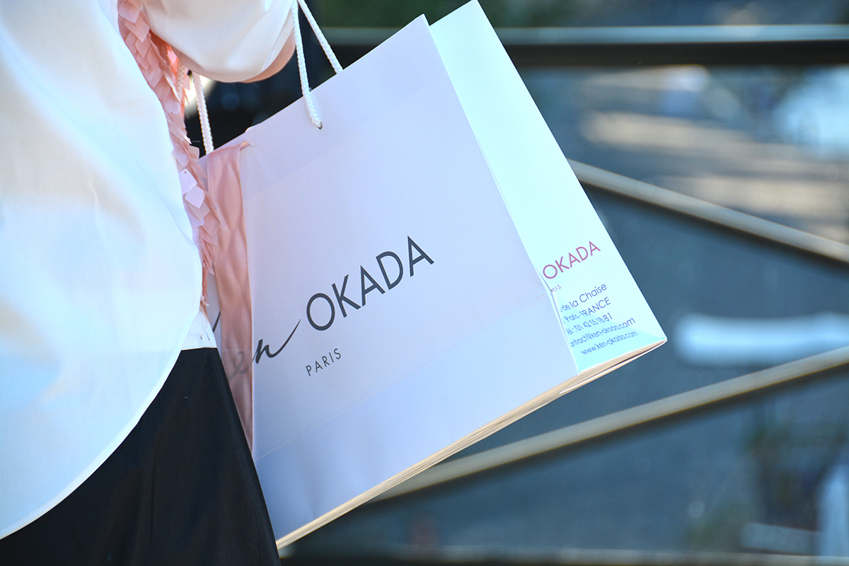 Ken Okada, créatrice japonaise diplômée du célèbre Bunka Fashion College à Tokyo est spécialisée dans la chemise chic et féminine nous donne sa vision de l’élégance parisienne avec cette nouvelle collection. Elle a fondé sa marque éponyme en 2001 et propose une vraie mode parisienne qui s’inspire des charmes de l’Asie. Elle casse les codes des défilés traditionnels en réalisant un Flash Mob sur le Pont des arts à Paris en pleine après-midi ensoleillée.
