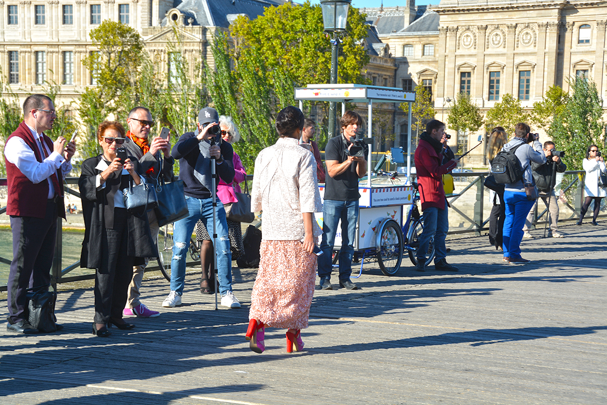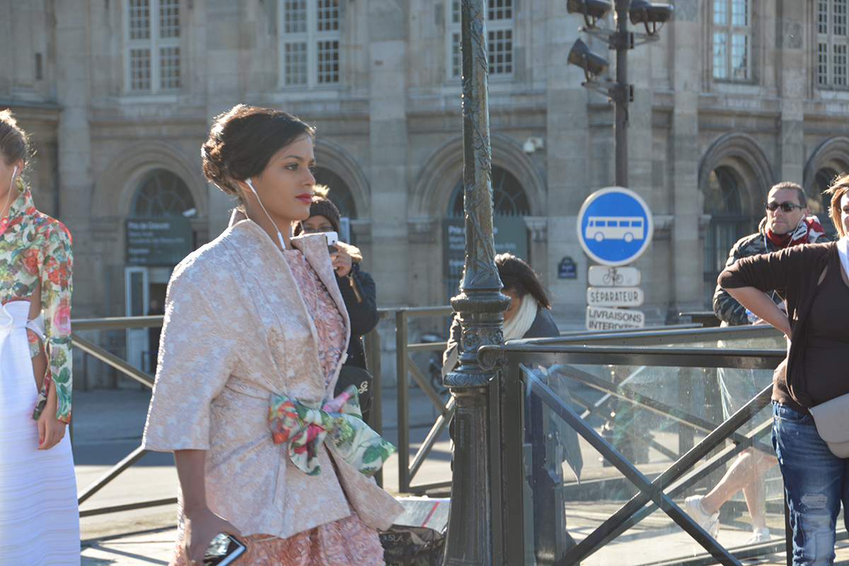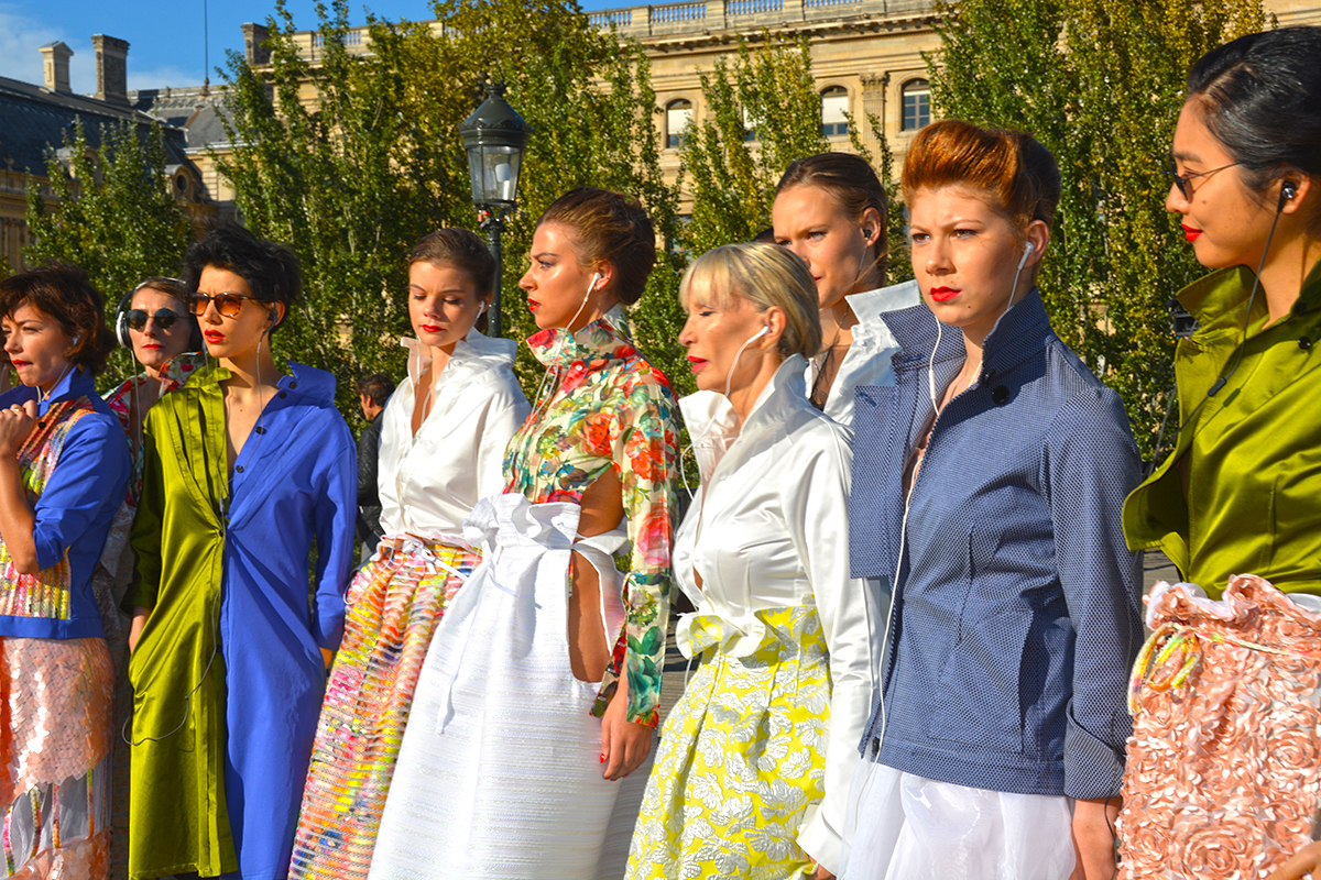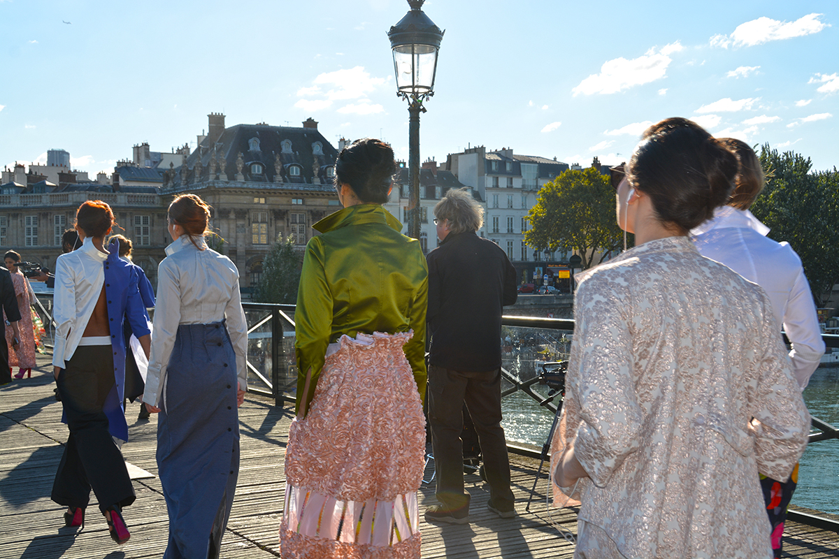Ken Okada, créatrice japonaise diplômée du célèbre Bunka Fashion College à Tokyo est spécialisée dans la chemise chic et féminine nous donne sa vision de l’élégance parisienne avec cette nouvelle collection. Elle a fondé sa marque éponyme en 2001 et propose une vraie mode parisienne qui s’inspire des charmes de l’Asie. Elle casse les codes des défilés traditionnels en réalisant un Flash Mob sur le Pont des arts à Paris en pleine après-midi ensoleillée.