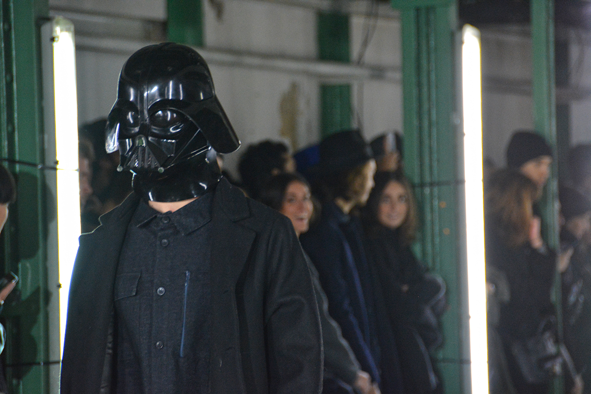 C’est l’ouverture de la Fashion Week, un moment magique… C’était un défilé incroyable de la marque Avoc, très original, le décor industriel … L’ouverture de la Fashion Week Homme de Paris était vraiment sublime, avec l’idée des masques, c’était complètement décaler ! le Dark Vador, c’est vraiment une idée incroyable ces masques…