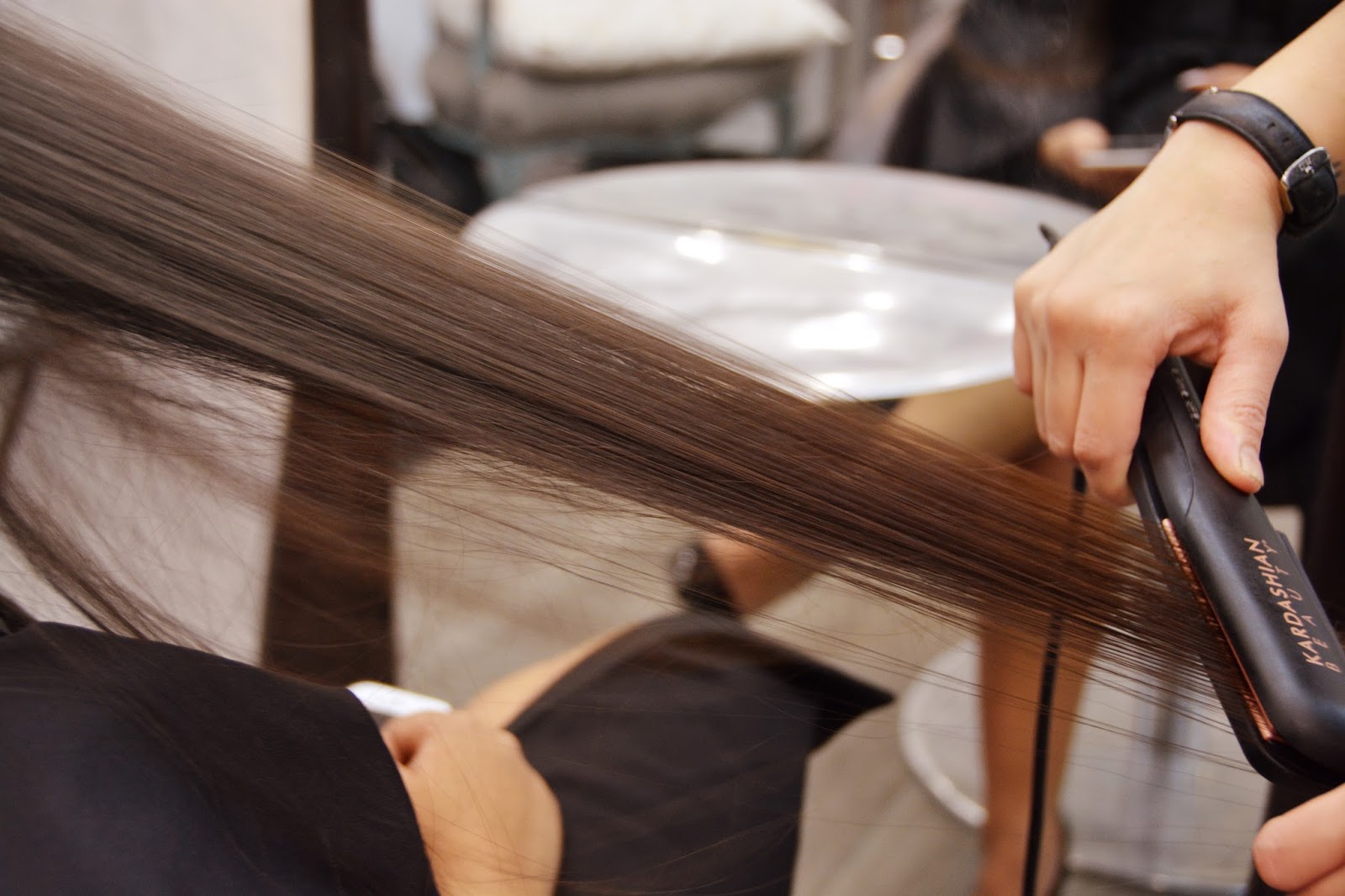 La phase 5 c’est la pulvérisation d’un spray qui au passage sent très bon et permet de refermer les cuticules du cheveu et de les protéger complètement. Au fur et à mesure des soins, on ressent que ces cheveux sont tout doux, léger et quand on s’aperçoit dans le miroir, on voit un réel changement, c’est dingue comment ils sont brillants, lisses, souples. Le résultat est juste dingue. L’avantage primordial de ce soin c’est que mes cheveux sont doux, fort, brillants de la racine jusqu’aux pointes. Le soin rend les cheveux uniformes de la racine à la pointe et les nourrit en profondeur. Le second avantage principal c’est la durée du soin, 3 à 6 semaines ou même plus si l’on entretient correctement le cheveu. Alors, pour les tarifs, cela dépend de la longueur de votre chevelure, pour les cheveux courts c’est 85 euros, mi-long, c’est 100 euros, pour les cheveux longs c’est 115 euros et pour les cheveux très longs et/ou épais, c’est 130 euros ce qui est très raisonnable car vous aurez à la fin de ce soin une chevelure de rêve grâce à Magalie et son équipe ! Dans le salon de Magalie vous retrouvez les produits Tokyo ainsi que les produits Kardashian… On peut aussi se faire une manucure, les couleurs des vernis sont incroyables. Le soin TOKIO INKARAMI exalte la brillance naturelle du cheveu. Vraiment, je suis dingue de mes cheveux qui sont devenues tout doux, soyeux et surtout brillant !