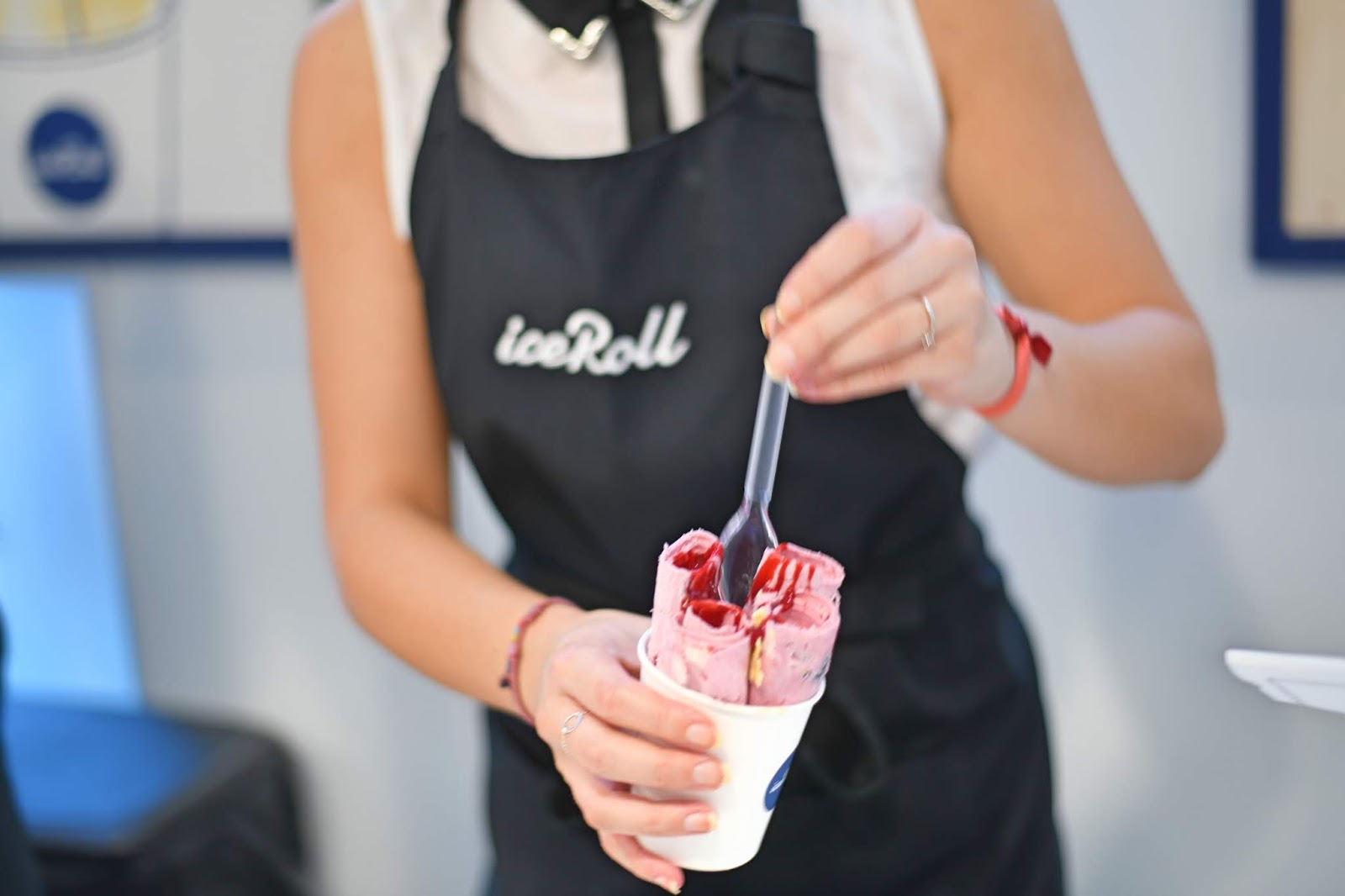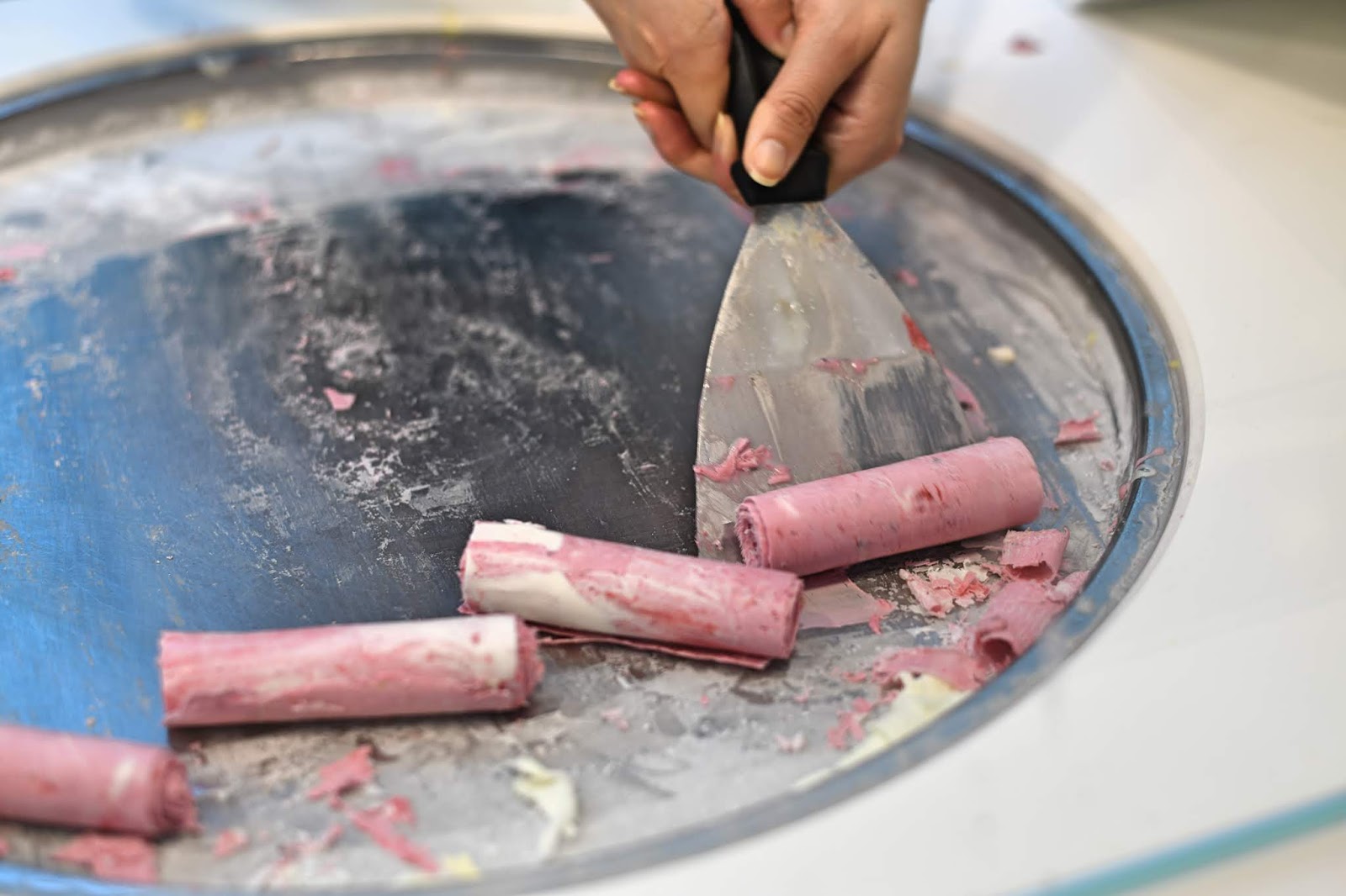 On choisit le parfum que l’on souhaite, fruits rouges, mangues, fruit de la passion… Ensuite, sur une plaque à -30°, est versé le mélange à glace à base de lait, de crème et de sucre, préparé le matin. Par-dessus, on verse le coulis de fruits avant de tout mélanger à la spatule, d’étaler puis de former les rouleaux. À vous ensuite de l’agrémenter de fruits frais, de biscuits ou même d’alcool et bonne nouvelle, vous avez jusqu’à la fin de l’été pour les découvrir. En ce qui concerne le goût, c’est vraiment délicieux, c’est extrêmement frais et cela se déguste sans fin ! La texture est étonnante, il faut absolument que vous goûtiez !