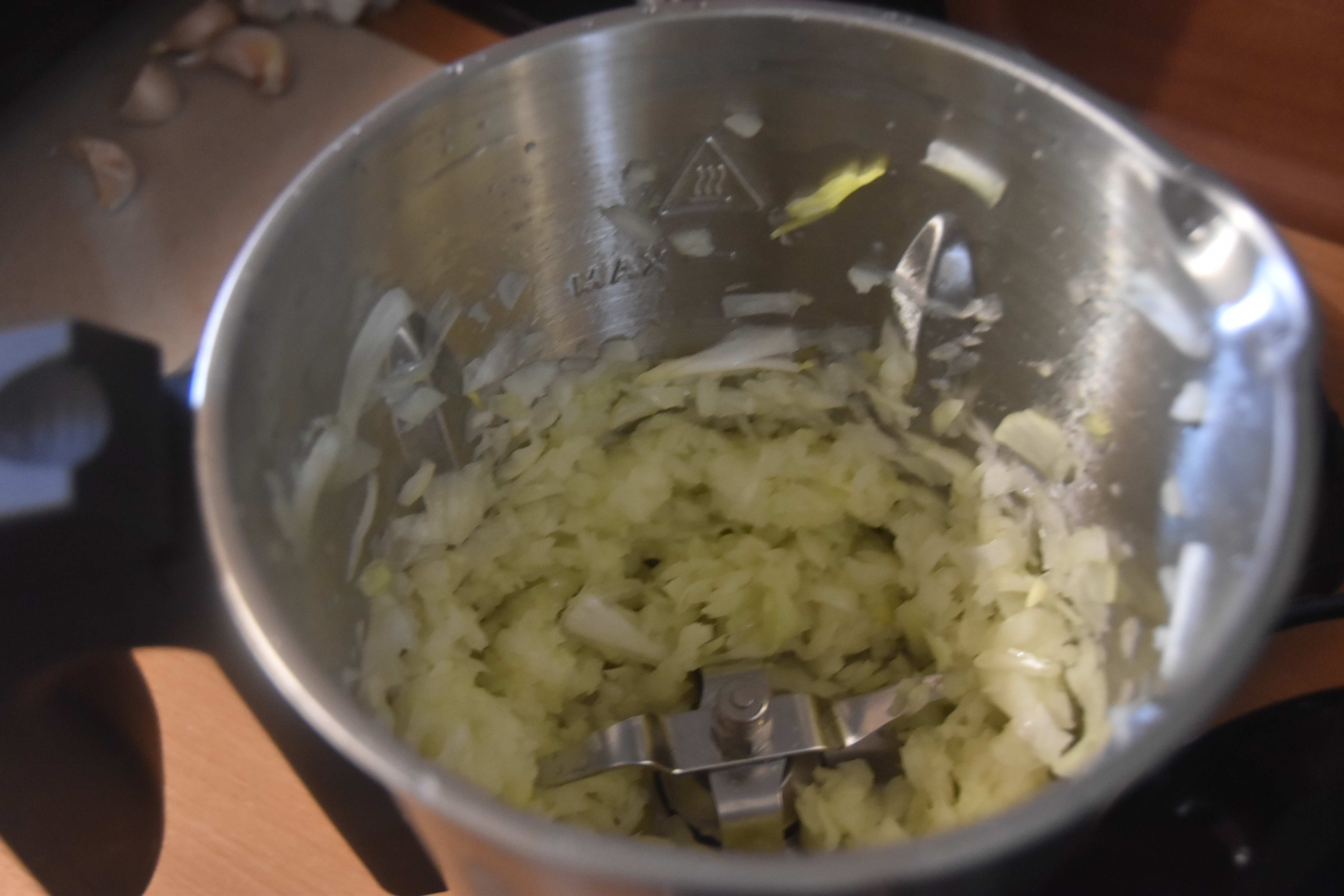 Mettre dans le bol un oignon et mixer 5 secondes vitesse 5. Ajouter les légumes (épluchés et coupés en morceaux) avec l’huile dans le bol et cuire 5 minutes 100° vitesse 1. Ajouter enfin l’eau et le bouillon et cuire 20 min 100° vitesse 1. À la sonnerie mixer 1 min vitesse 10.