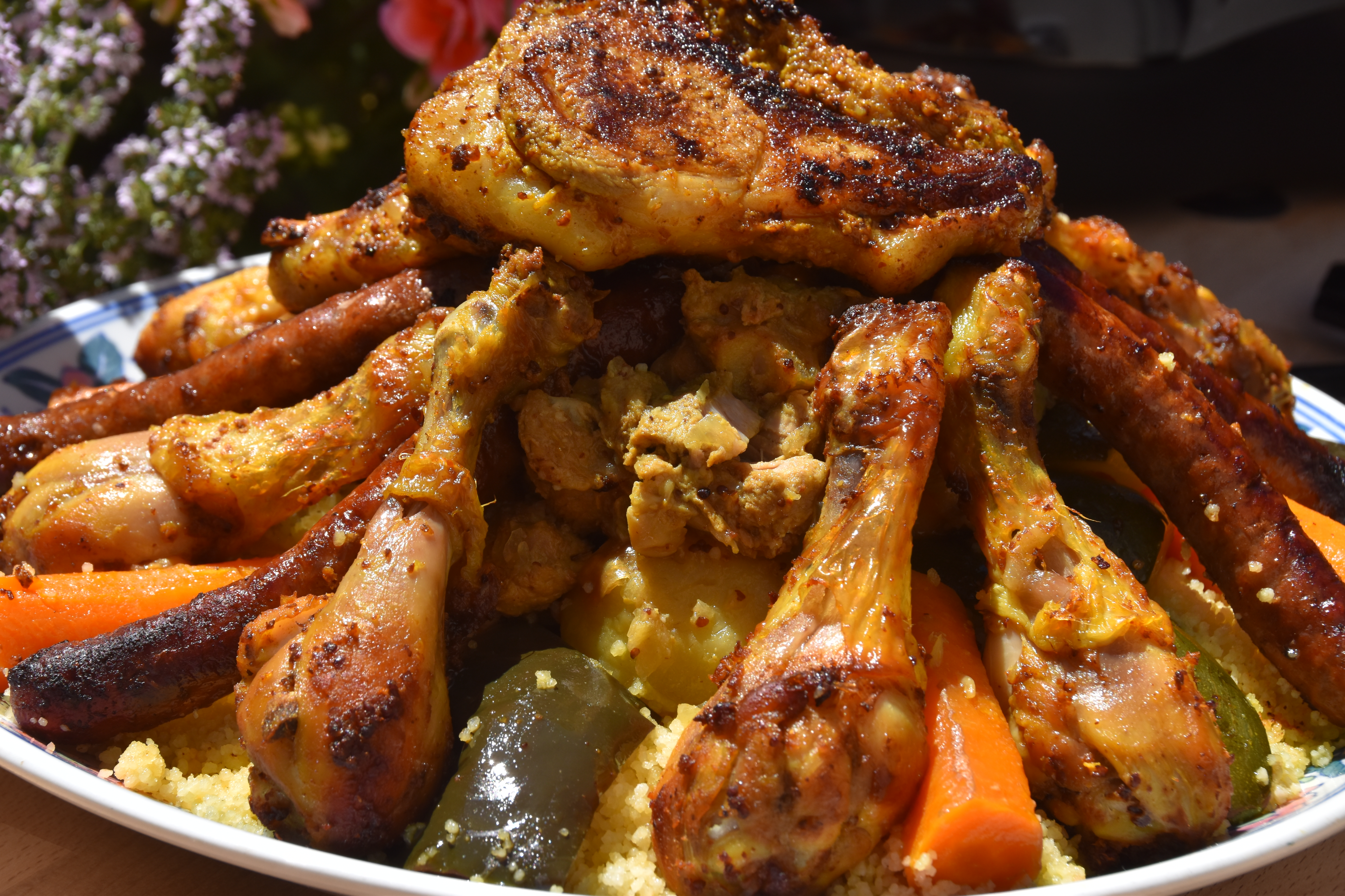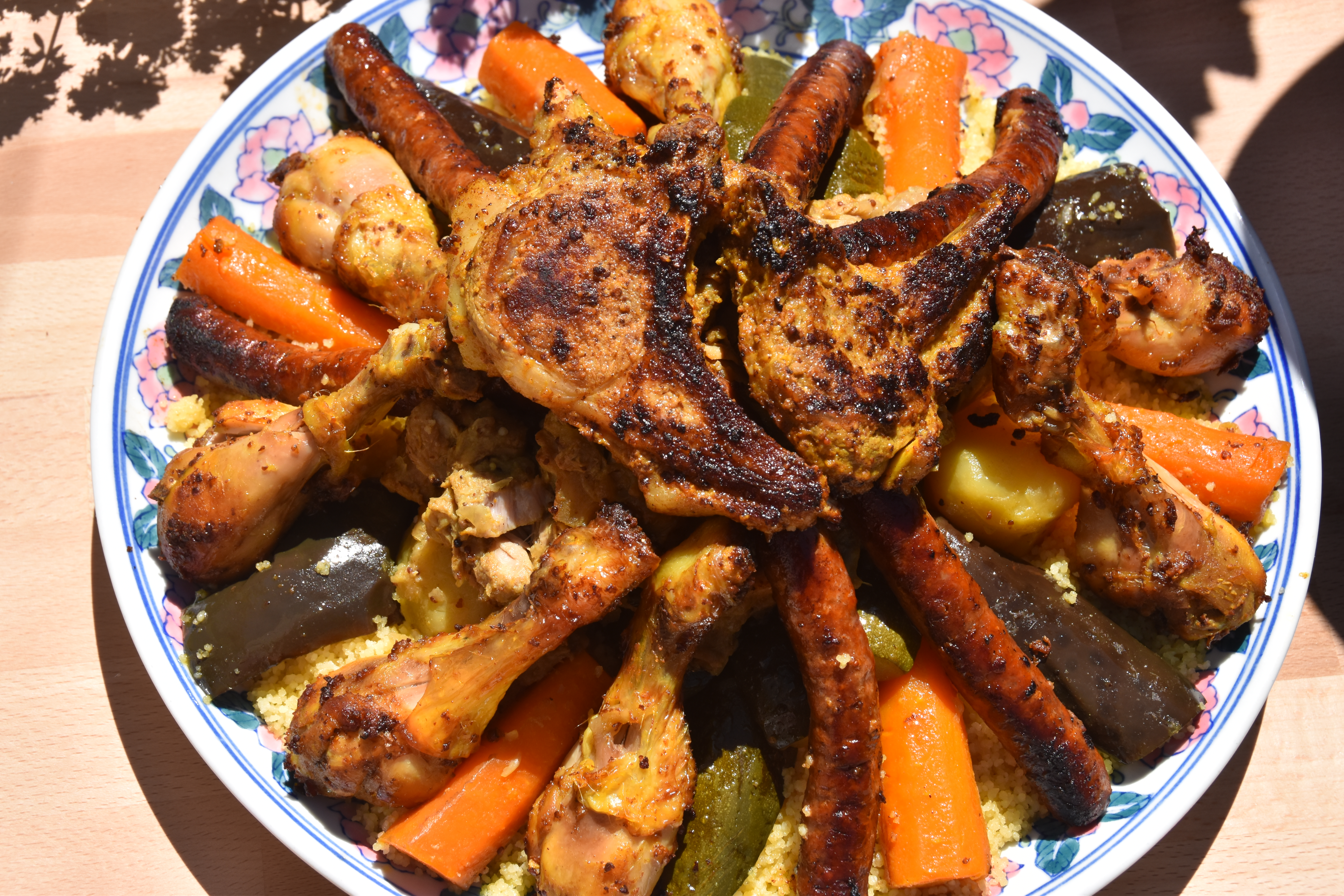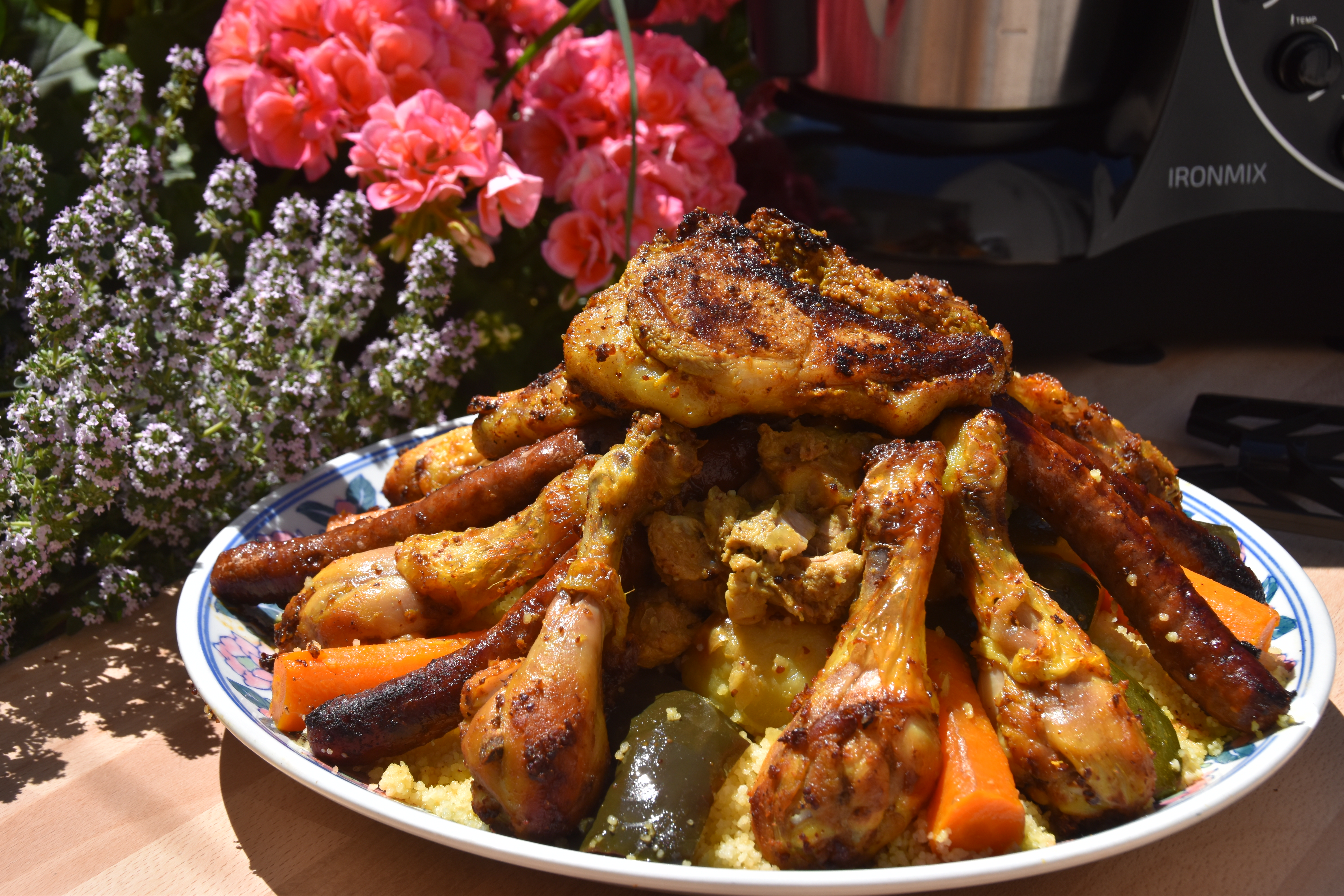 Épluchez et coupez-en 2 l’oignon, lavez et coupez en morceaux les courgettes. Ensuite, épluchez et couper en morceaux l’aubergine et les carottes et couper en morceaux l’agneau. Dans le bol, mettez l’oignon et mixez 5 secondes en vitesse 5. Raclez les bords du bol à l’aide d’une spatule. Ajoutez ensuite l’huile d’olive, l’agneau puis programmez 20 min en fonction sens inverse à 100°C en vitesse 1. Les tomates, l’eau, les carottes, salez, poivrez. Mettez les courgettes, l’aubergine, le poulet, les merguez, puis programmez 20 min en fonction sens inverse, cuisson en vitesse 1. Faites gonfler la semoule dans 1 fois et demi son volume d’eau. Égrainez-la avec le beurre coupé en morceaux. Faites griller les merguez à sec dans une poêle. En suite faire griller les côtelettes. Servez le couscous accompagné de semoule, de viande et de merguez, de légumes et de bouillon.