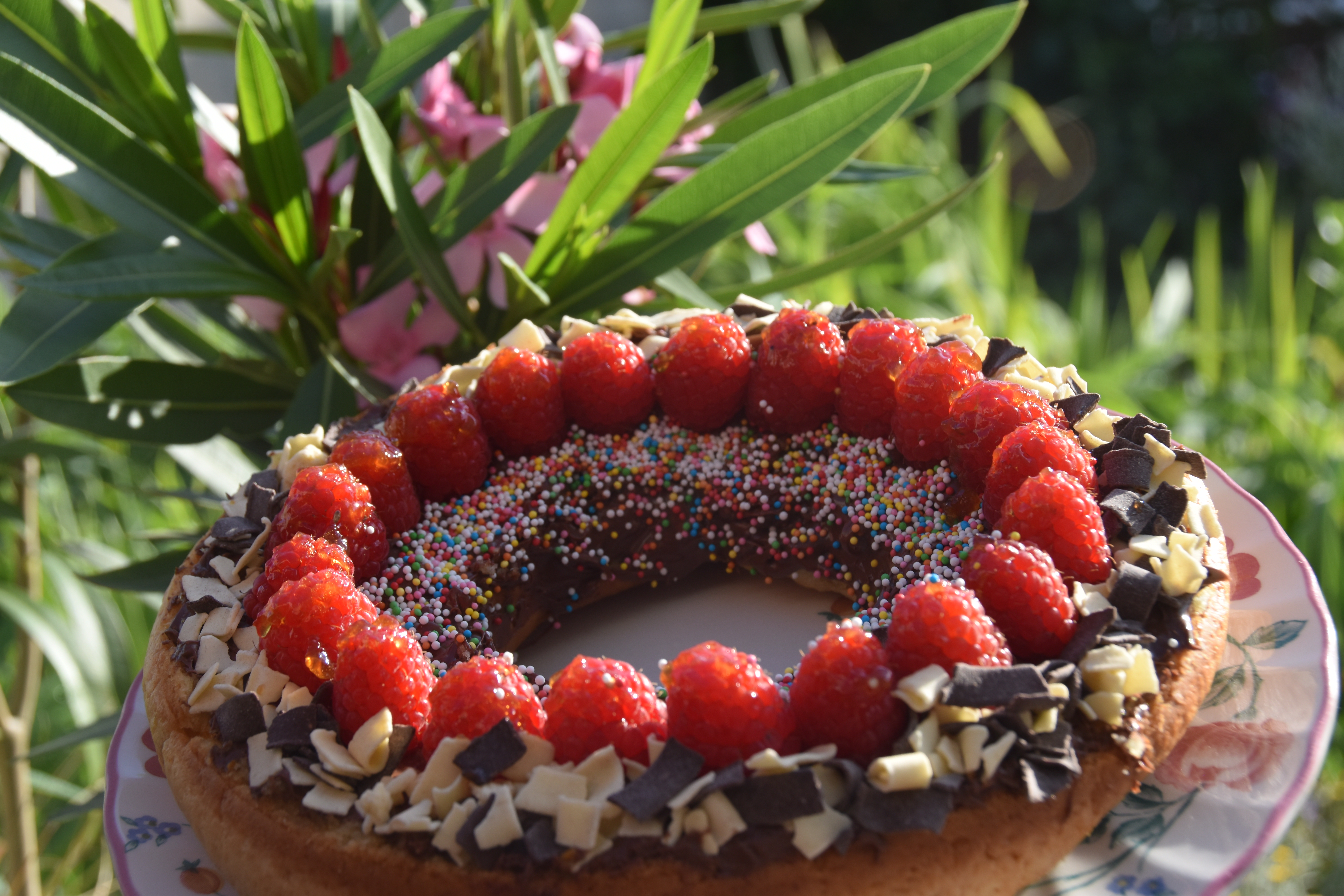Mélanger tous les ingrédients, allumer le four à 200° mettre la pâte obtenue dans un moule de votre choix et enfourner. Sortir du four, démouler attendre que cela refroidît puis décorer avec les copeaux de chocolat et mettre les framboises au-dessus.