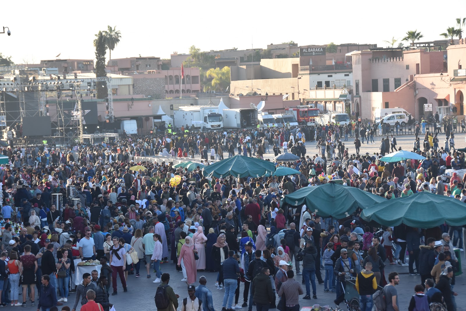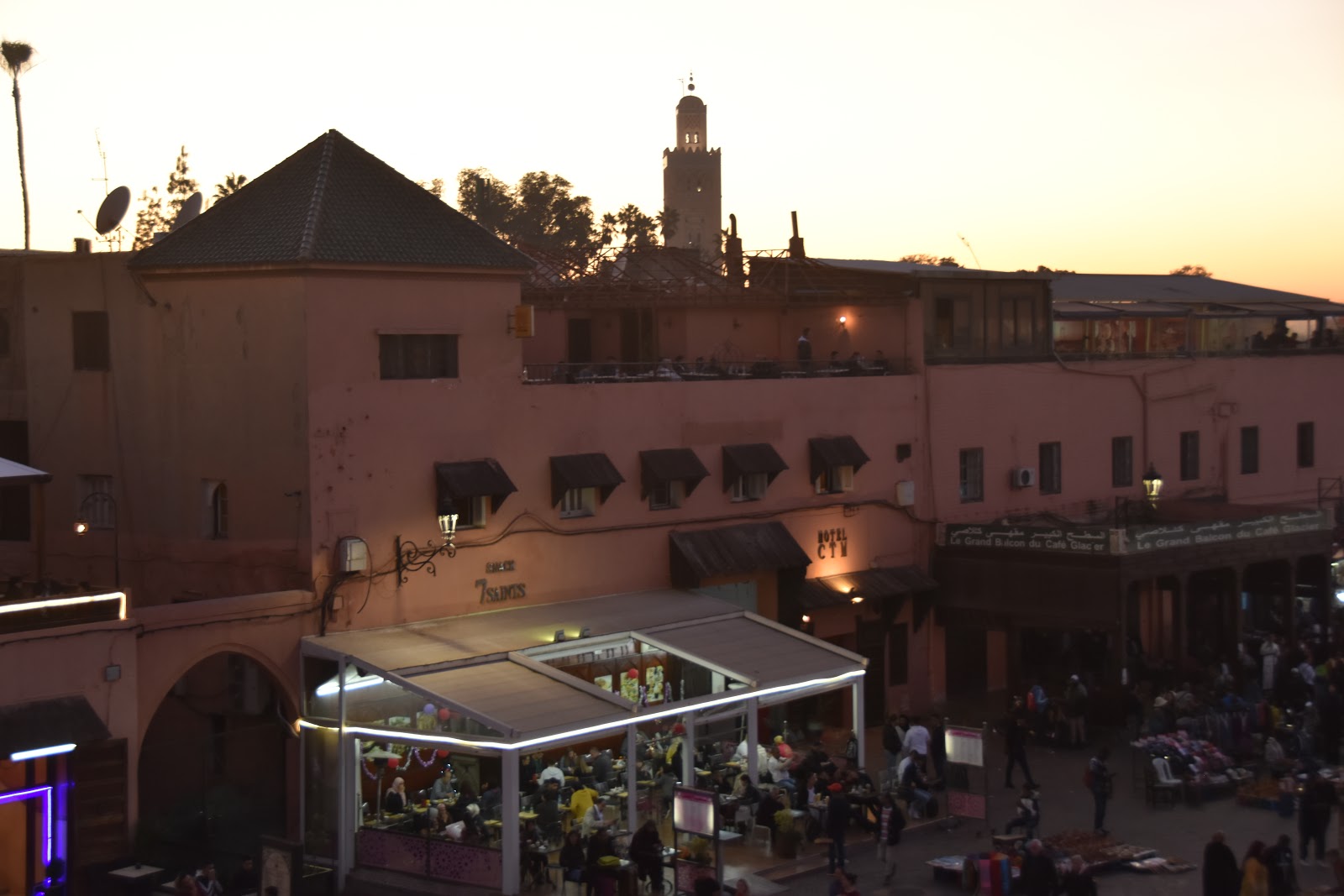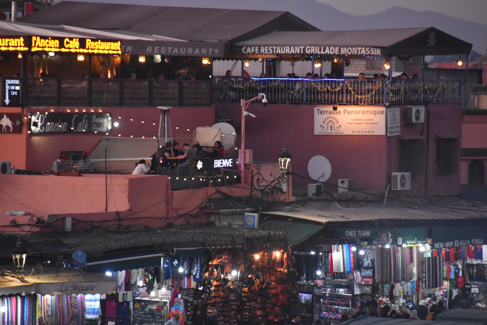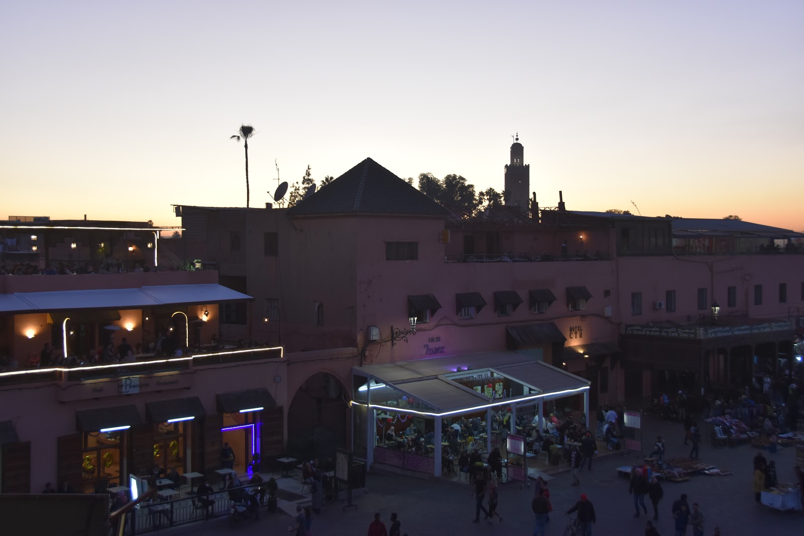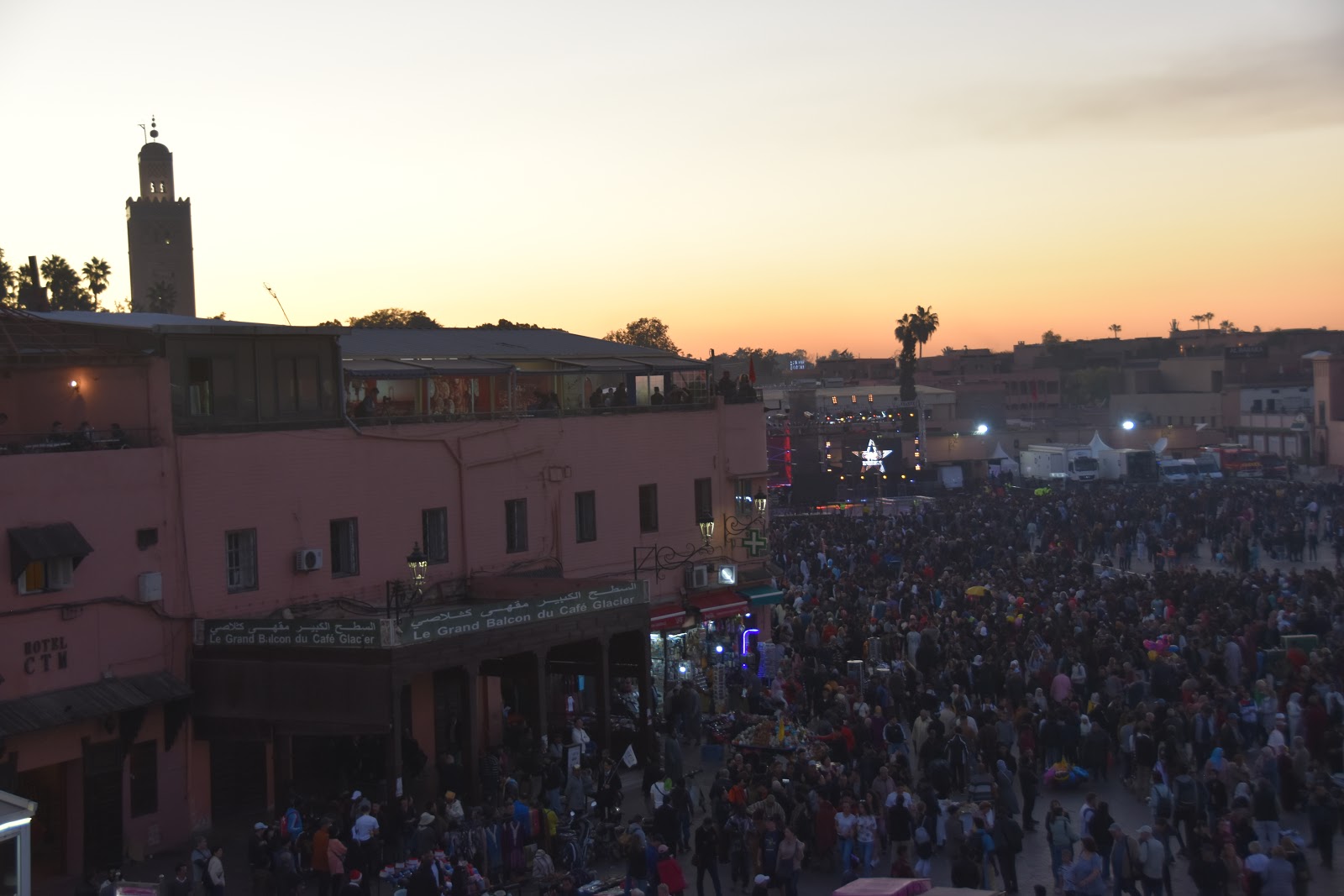 Dès 17 h, l’animation commence et Jemaa-el-Fna devient noire de monde. Charmeurs de serpents, diseuses de bonne aventure, groupes de musique et le soir, des dizaines de restaurants ambulants assurent le spectacle sous le regard médusé des badauds. Les terrasses des cafés situés autour offrent des superbes points de vue sur la place Jemaa-el-Fna, particulièrement au coucher du soleil.