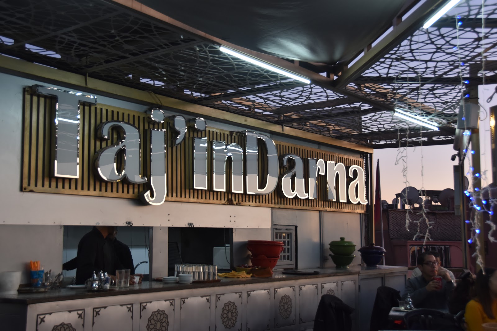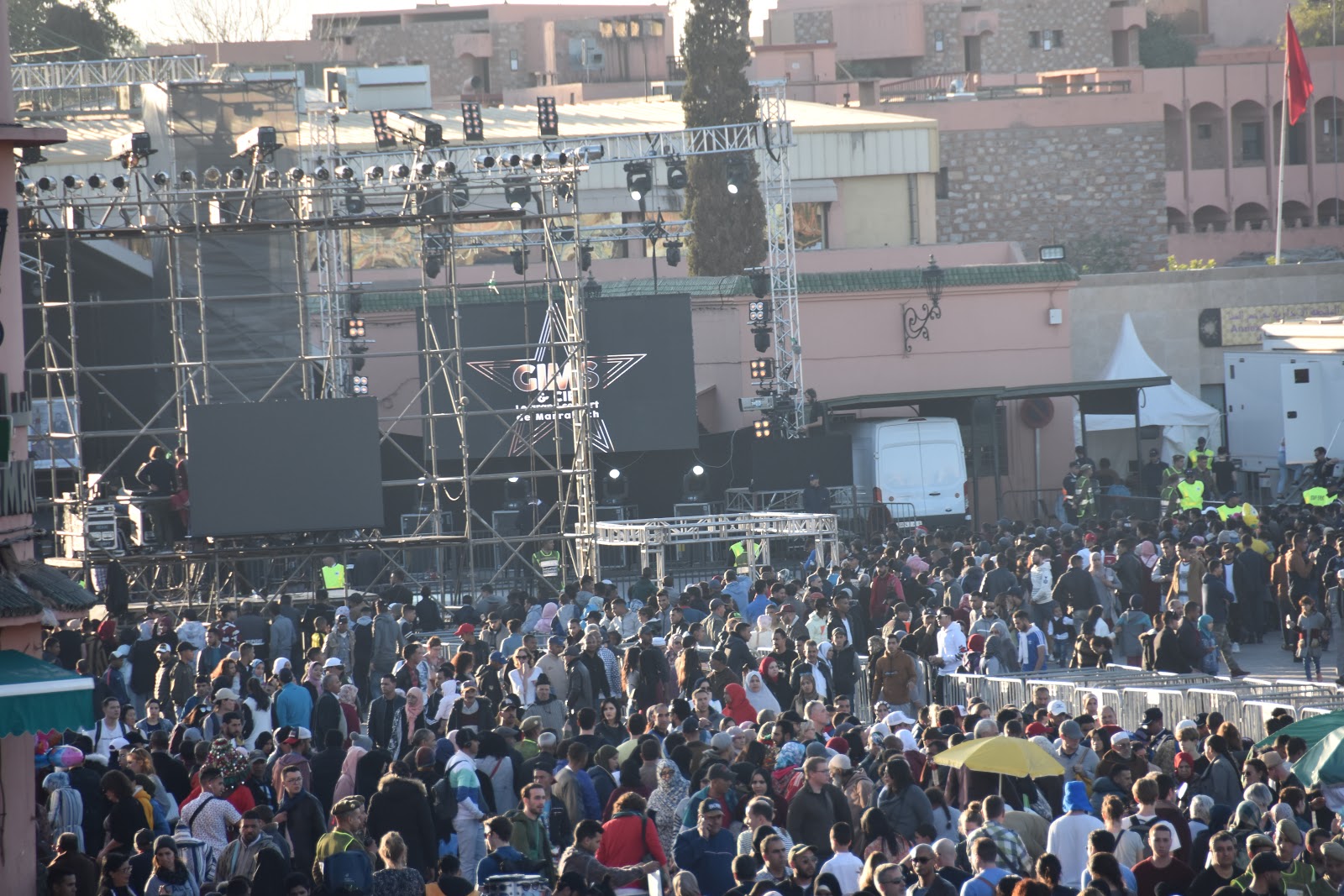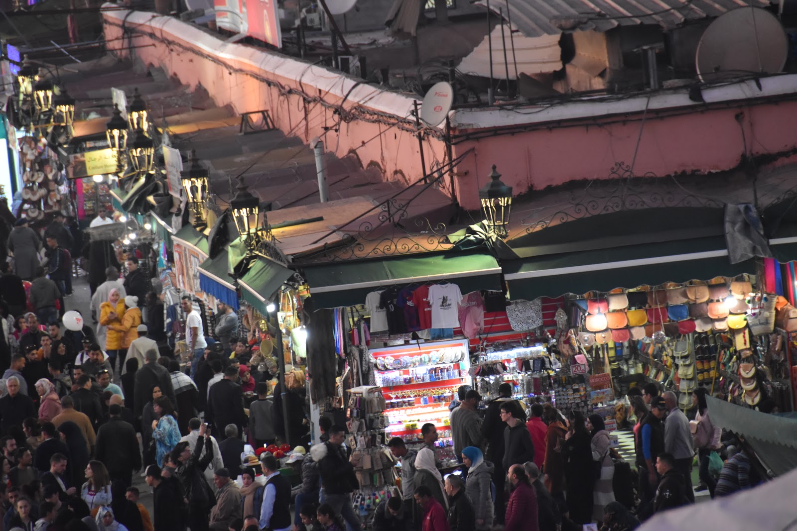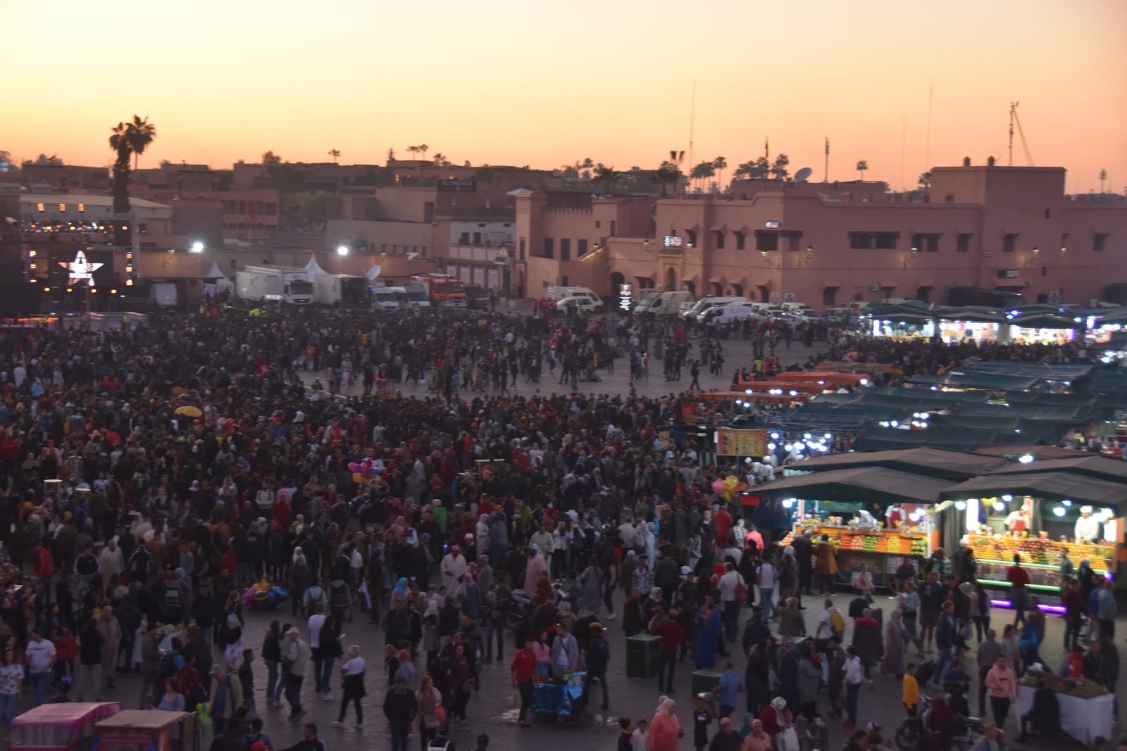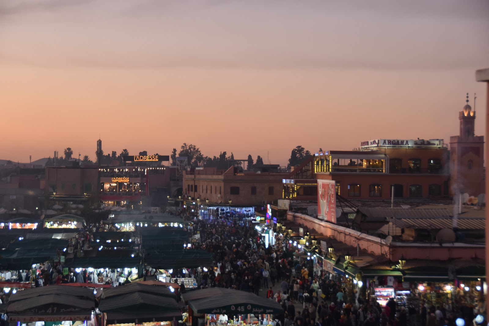 Dès 17 h, l’animation commence et Jemaa-el-Fna devient noire de monde. Charmeurs de serpents, diseuses de bonne aventure, groupes de musique et le soir, des dizaines de restaurants ambulants assurent le spectacle sous le regard médusé des badauds. Les terrasses des cafés situés autour offrent des superbes points de vue sur la place Jemaa-el-Fna, particulièrement au coucher du soleil.