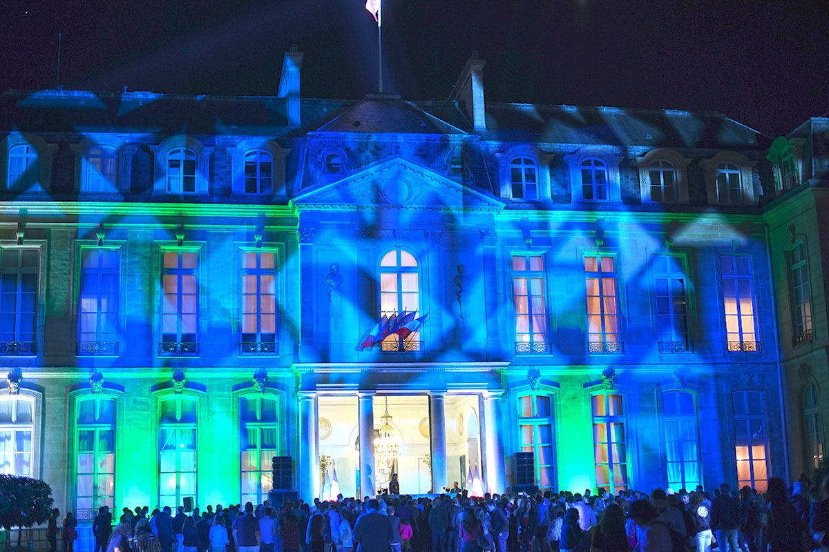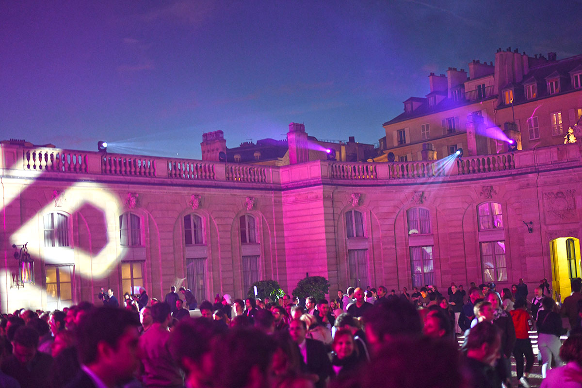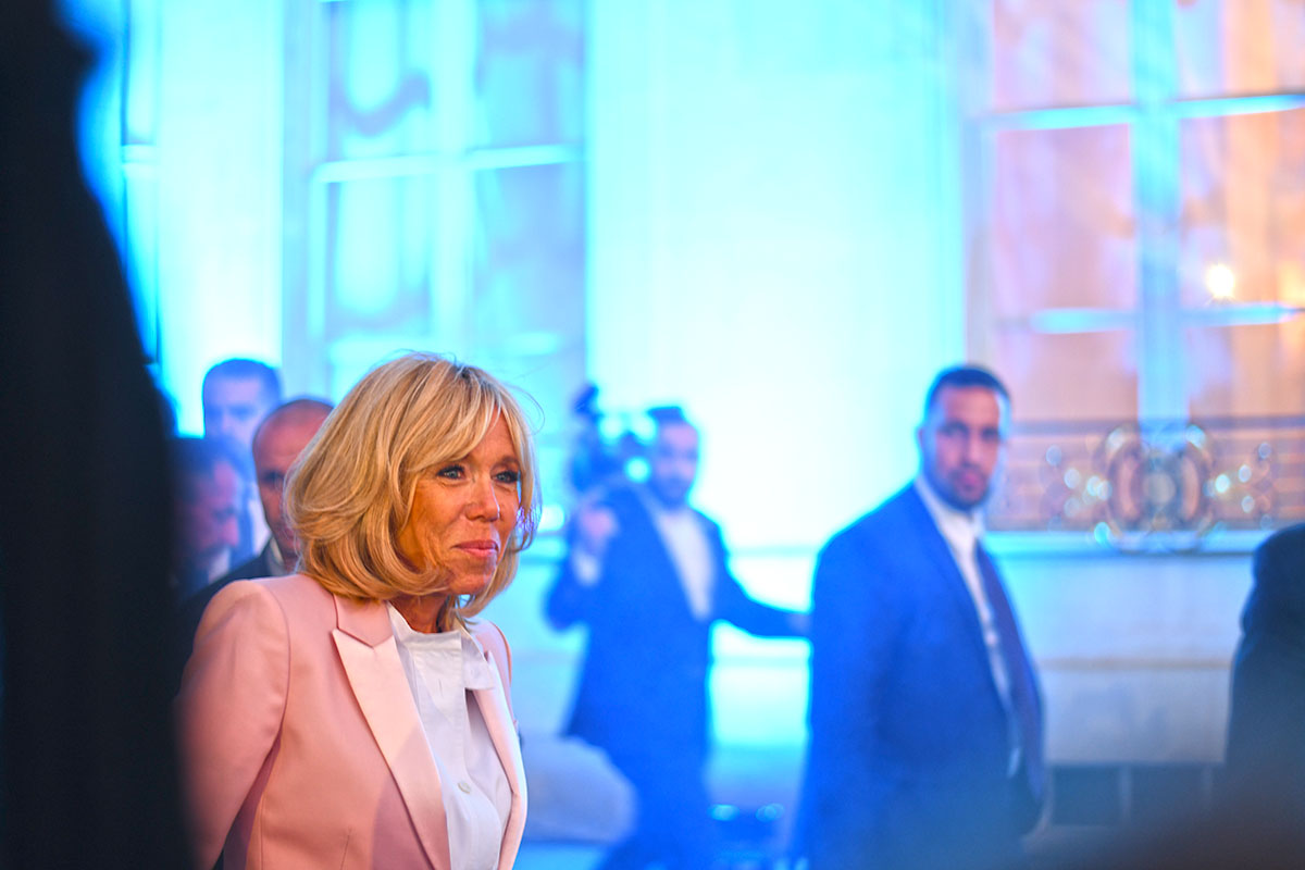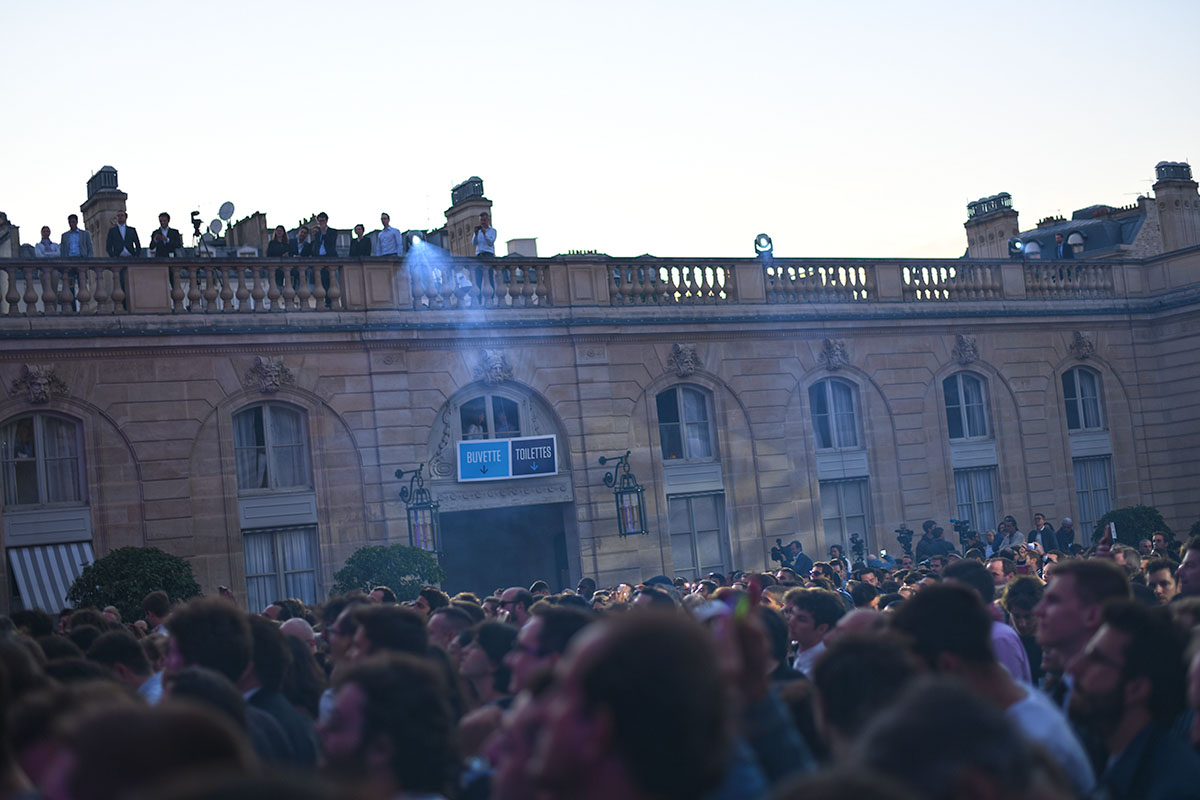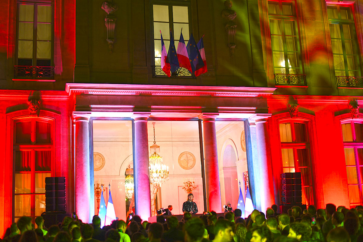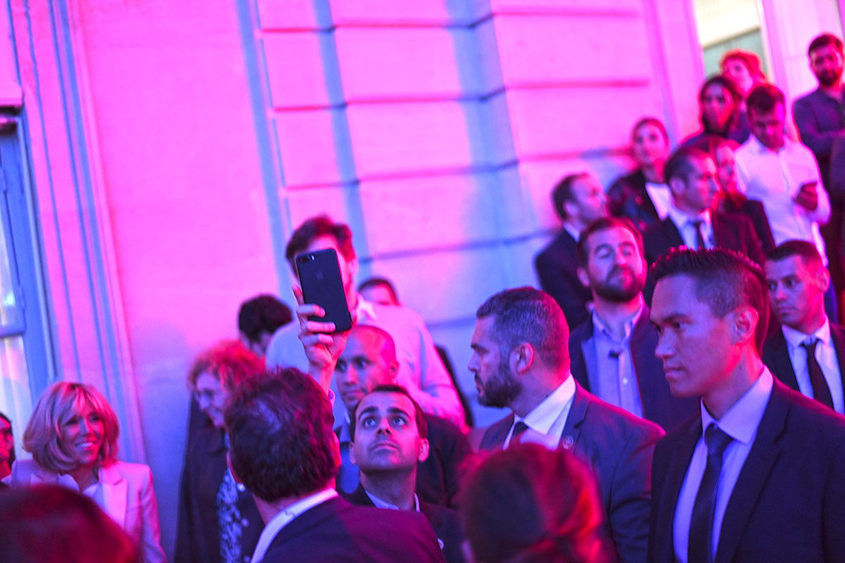 Les spots multicolores clignotent, le son est au maximum, la grande dame Brigitte Macron passe brièvement en début de soirée le long de la cour, aussitôt photographiée par des centaines de smartphones.