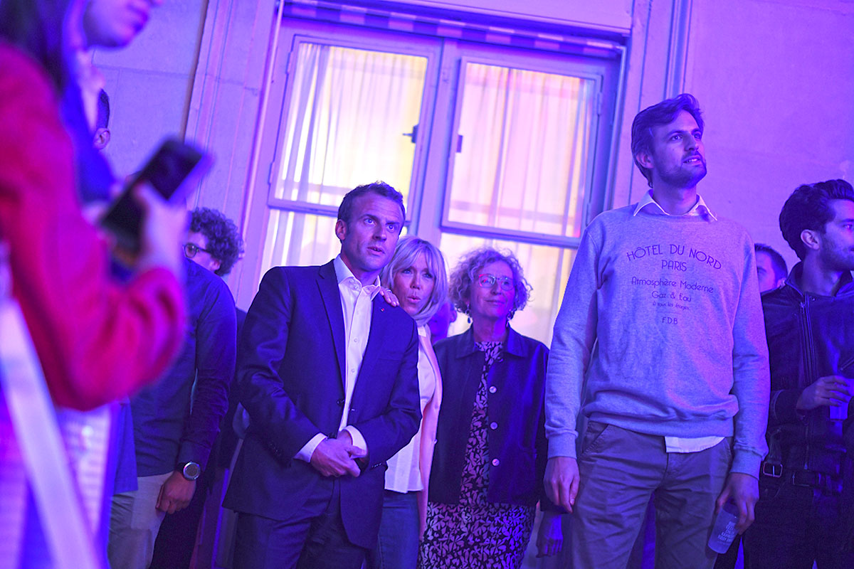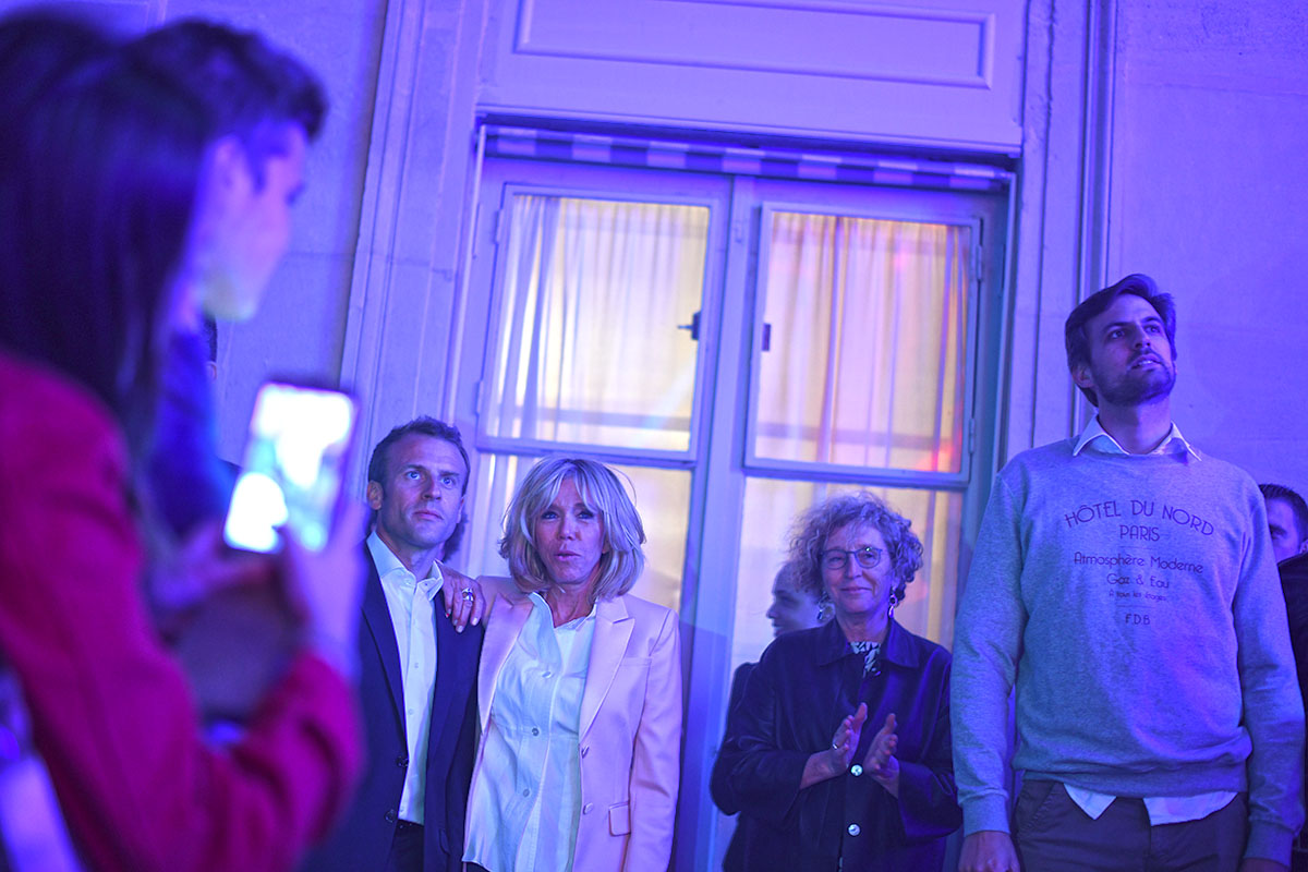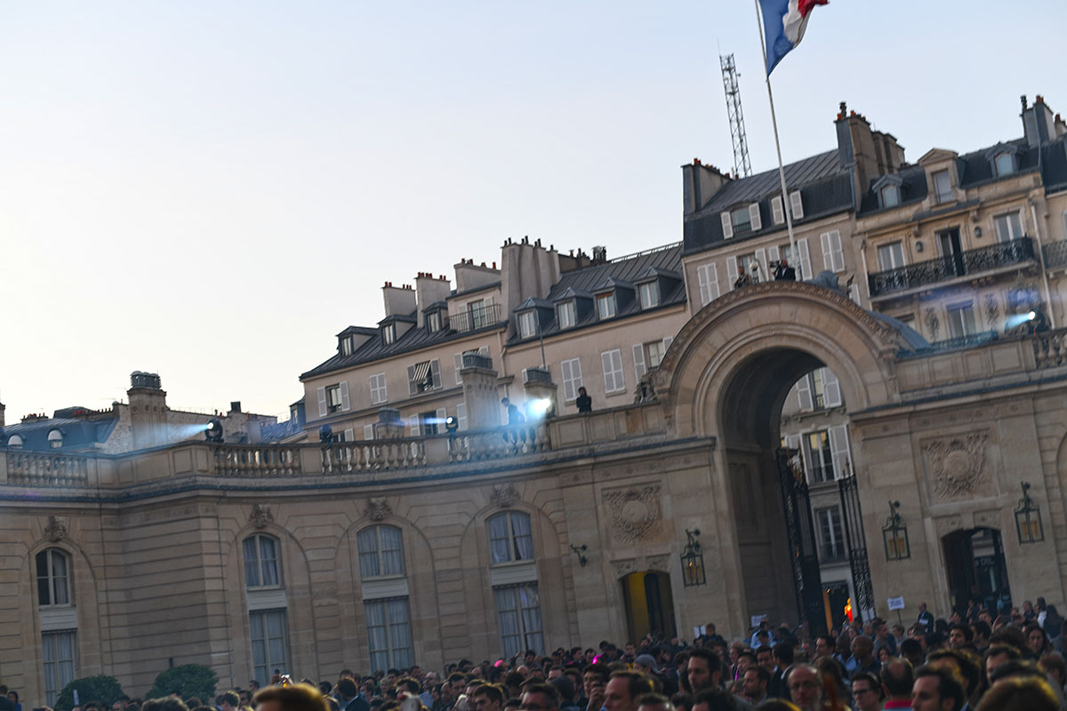 Devant la scène, il serre longuement les mains des enthousiastes du premier rang massés derrière des barrières, aux côtés de son épouse et – invitée surprise – de la ministre du Travail Muriel Pénicaud. Entouré de sa famille, le président est resté un moment dans la cour avec sa femme et ses enfants, esquissant quelques pas de danse. Il avait invité le pionnier de la musique électro Jean-Michel Jarre à passer le saluer.