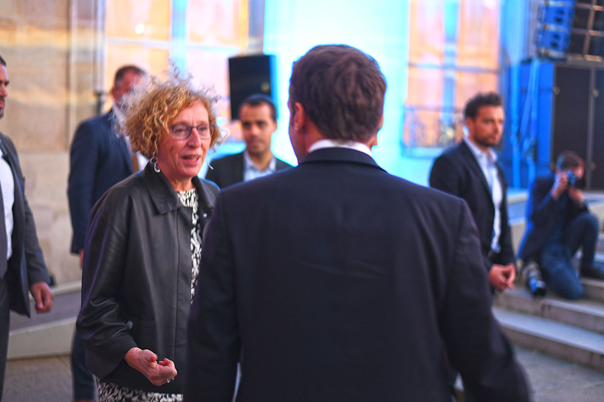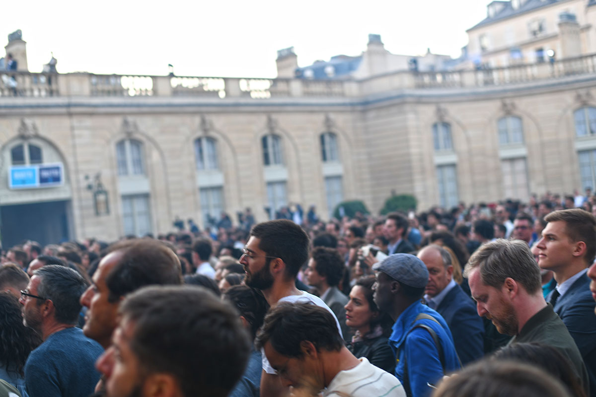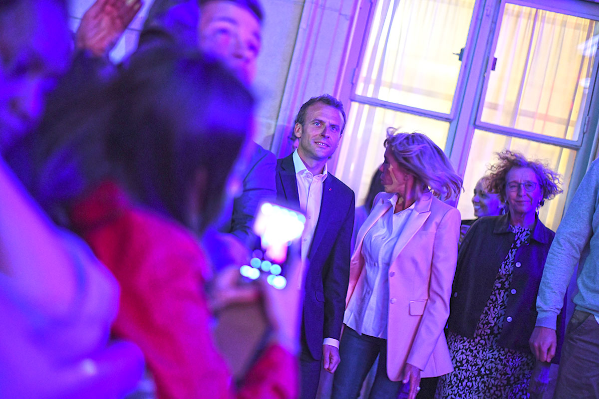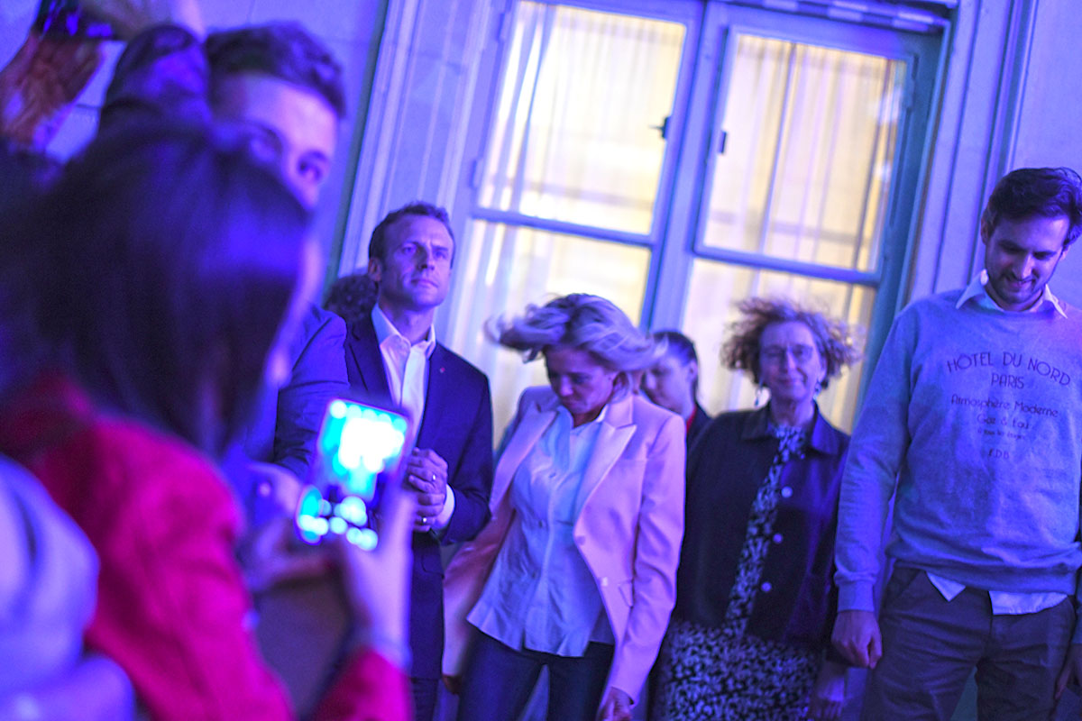 Devant la scène, il serre longuement les mains des enthousiastes du premier rang massés derrière des barrières, aux côtés de son épouse et – invitée surprise – de la ministre du Travail Muriel Pénicaud. Entouré de sa famille, le président est resté un moment dans la cour avec sa femme et ses enfants, esquissant quelques pas de danse. Il avait invité le pionnier de la musique électro Jean-Michel Jarre à passer le saluer.