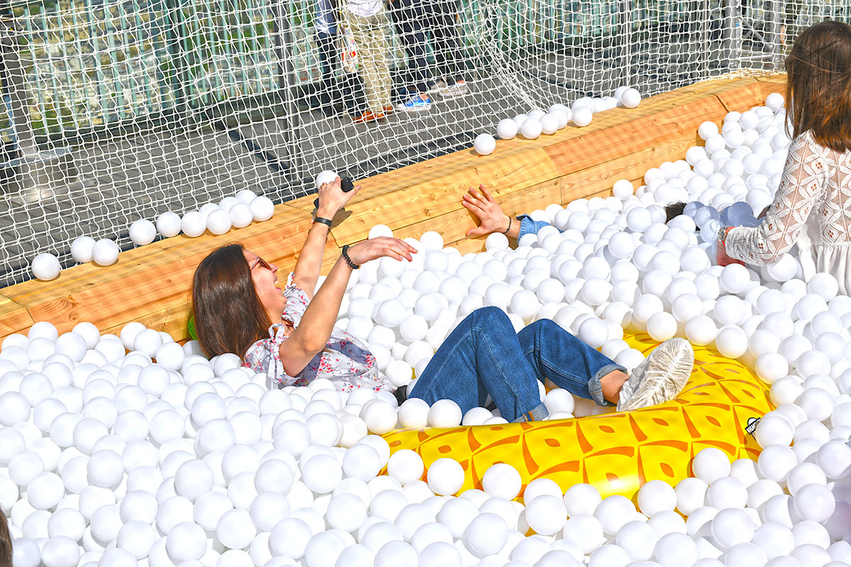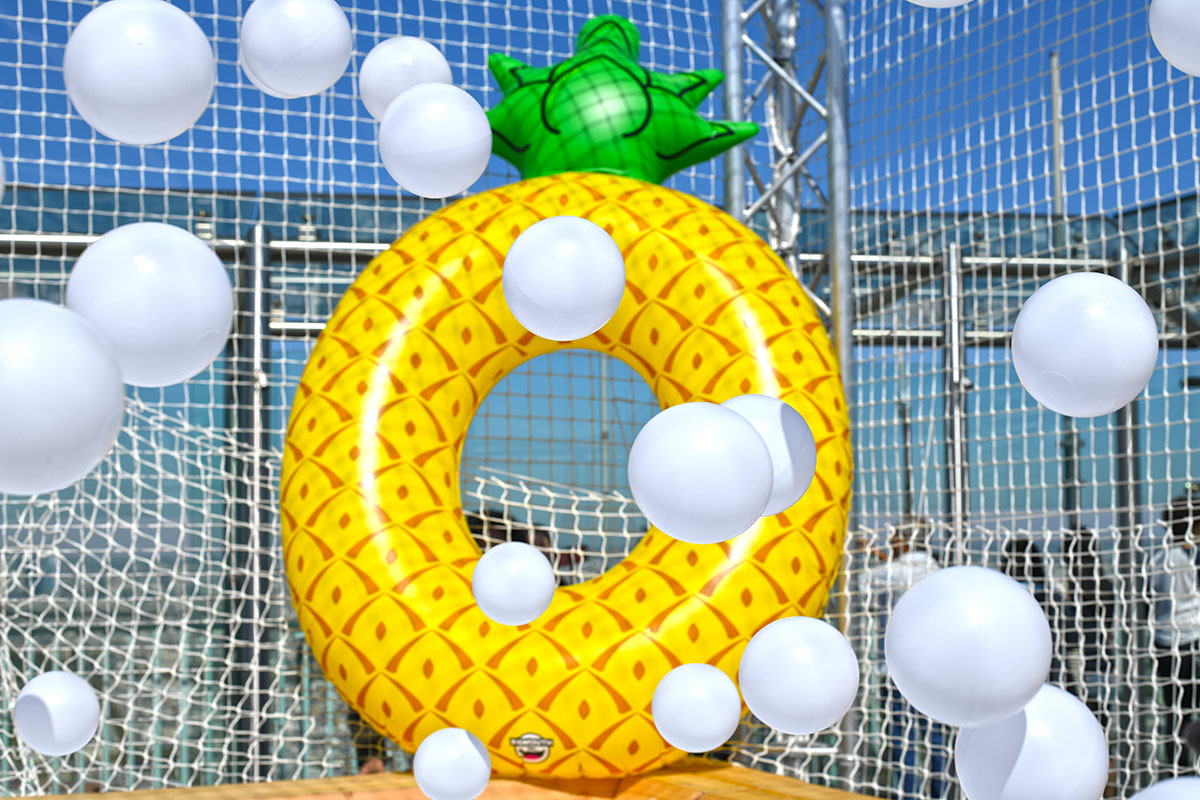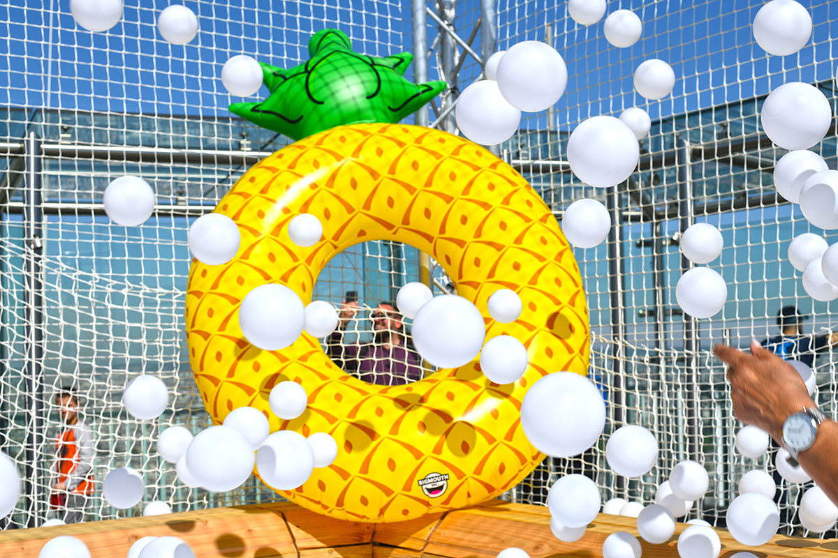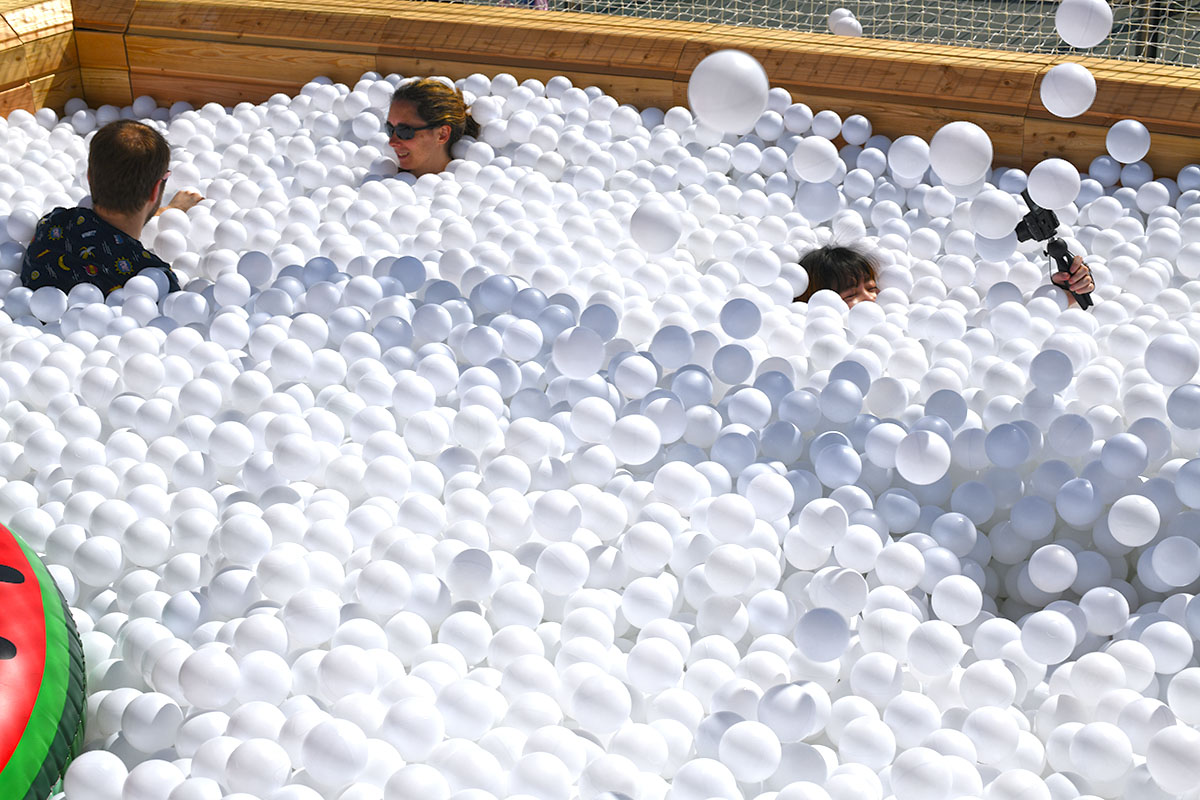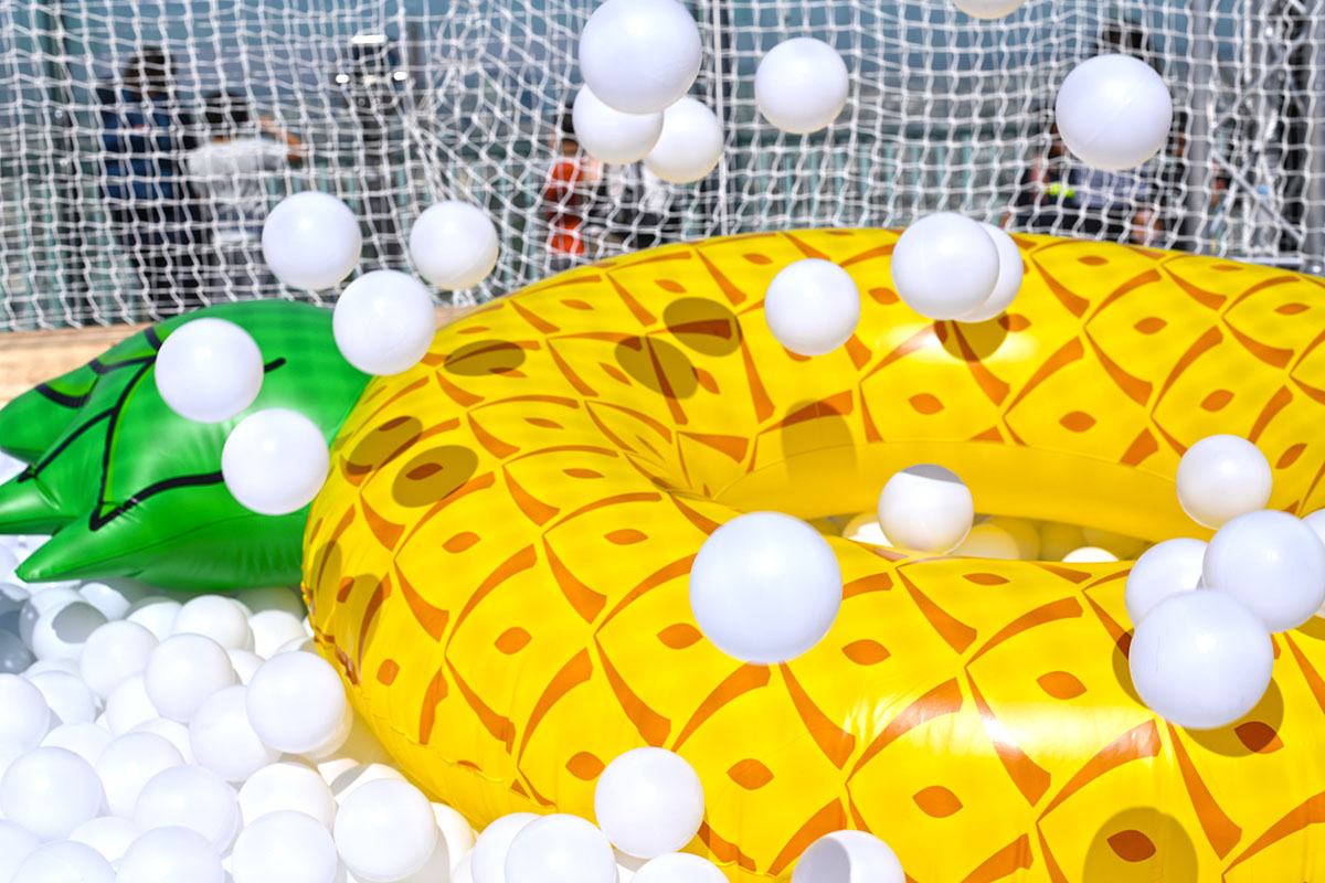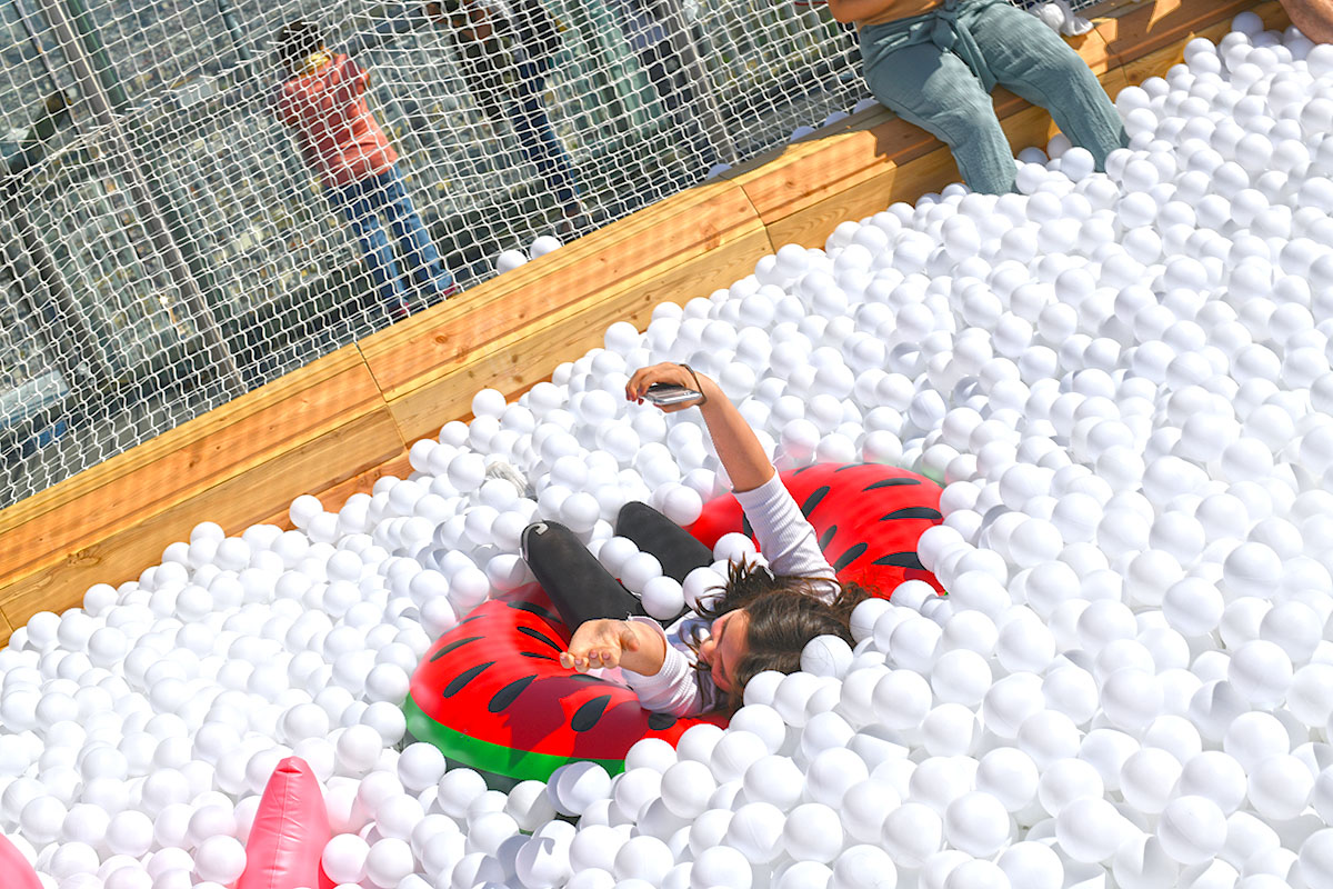 Pour cette installation éphémère, pas moins de 100 000 balles pour composer cette piscine insolite. D’une taille de 40m² elle est recouverte entièrement d’un filet de sécurité. Avec de magnifiques bouées flamant rose et ananas en prime !