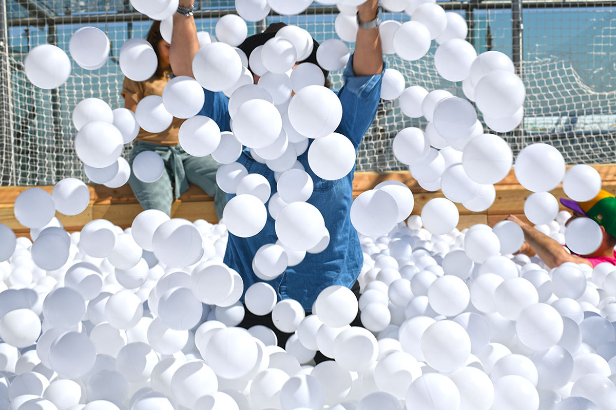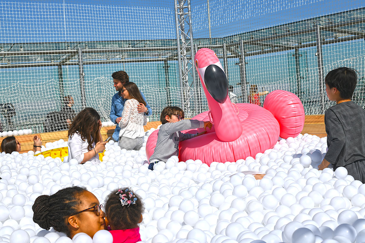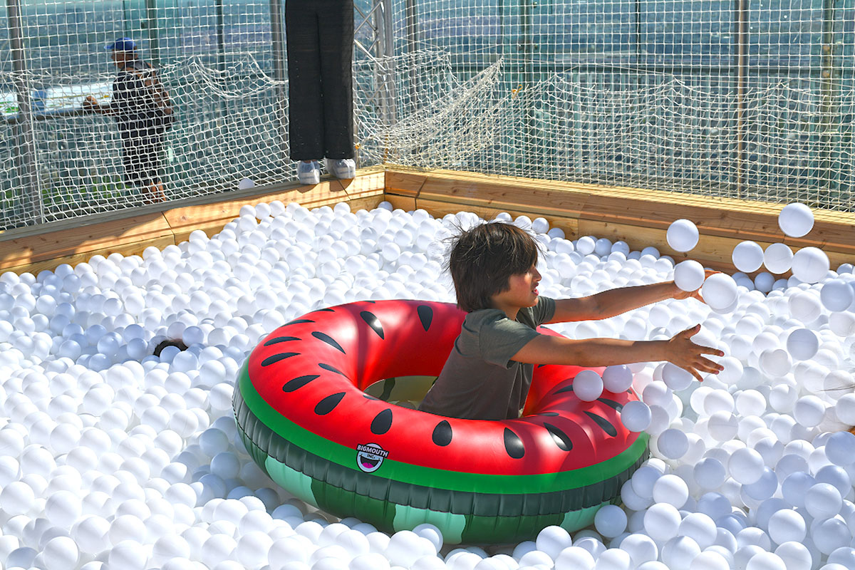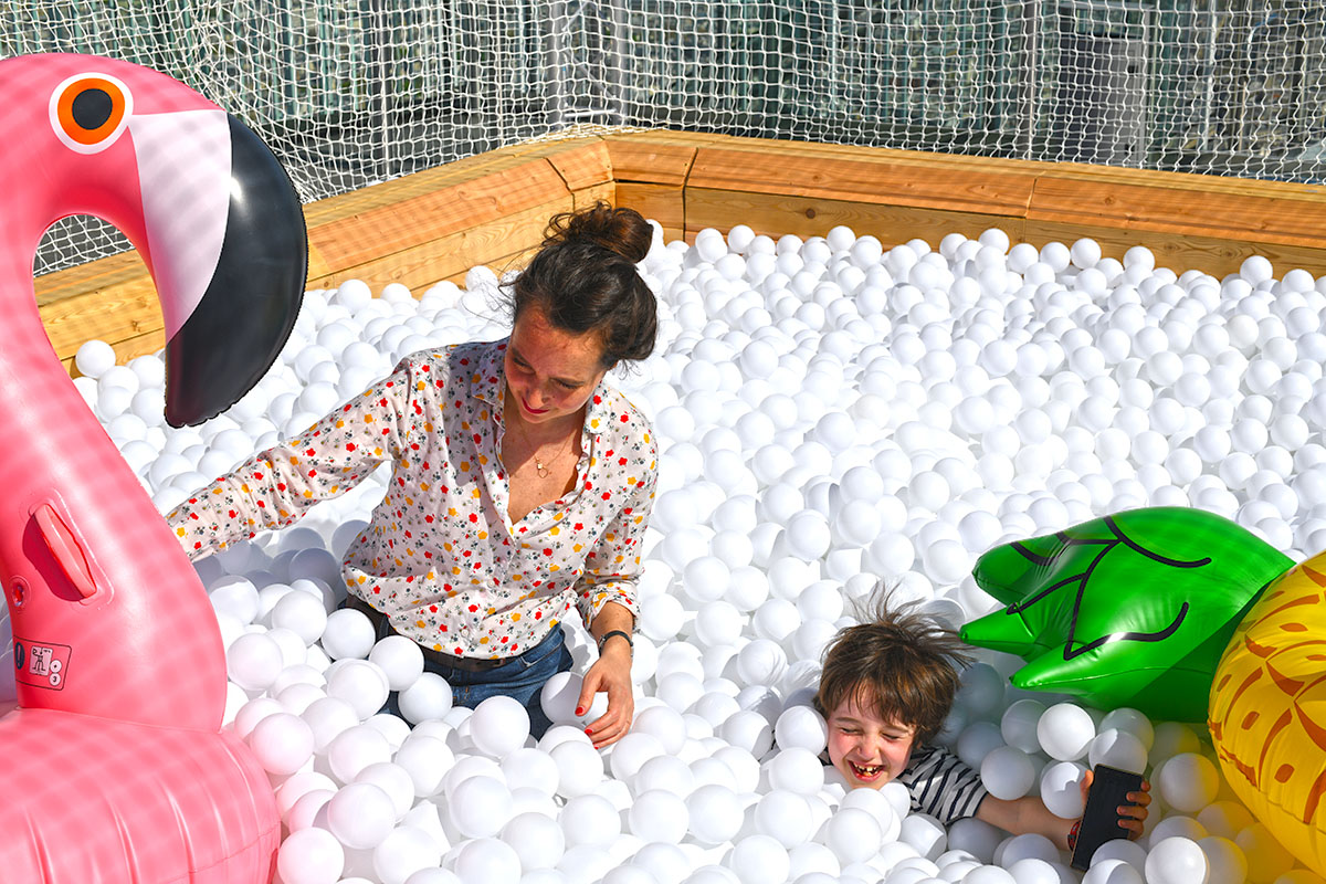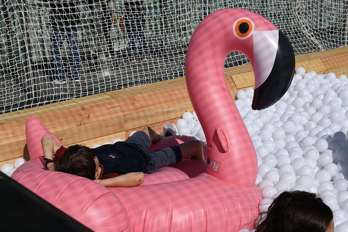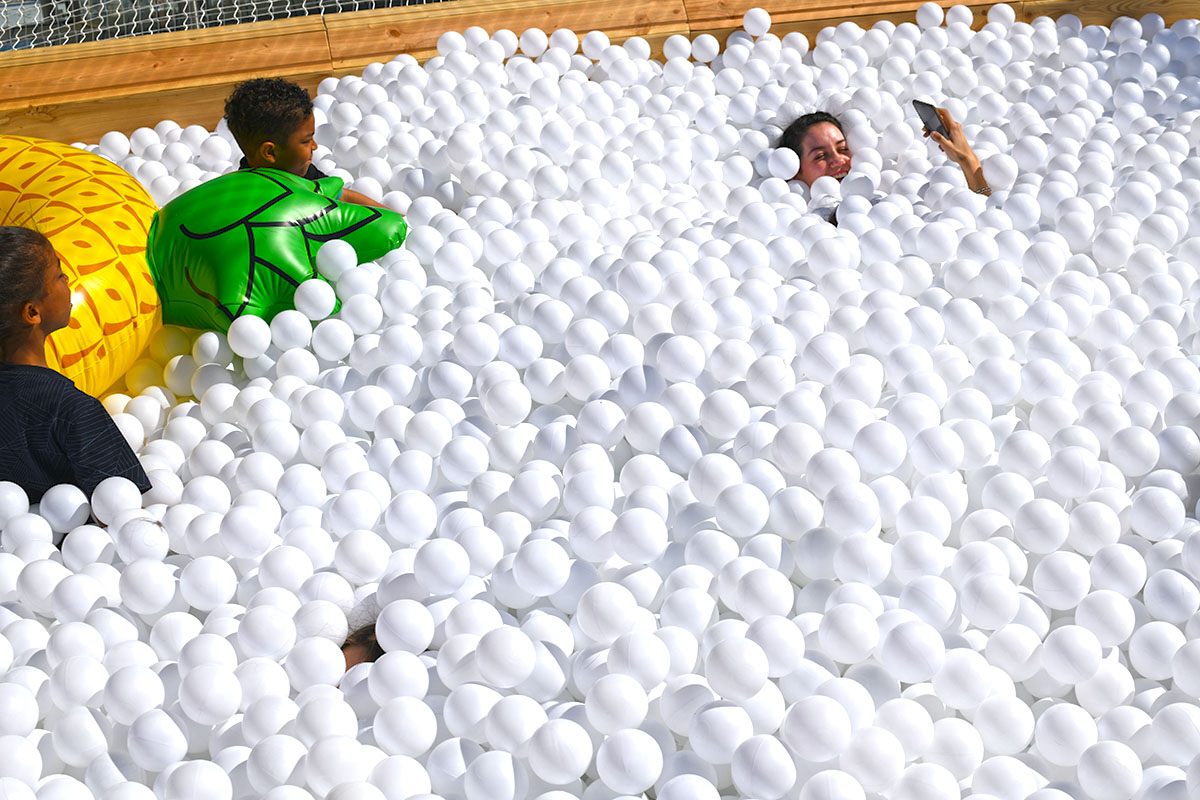 Pour cette installation éphémère, pas moins de 100 000 balles pour composer cette piscine insolite. D’une taille de 40m² elle est recouverte entièrement d’un filet de sécurité. Avec de magnifiques bouées flamant rose et ananas en prime !