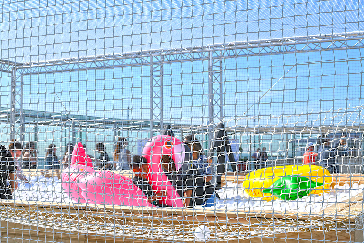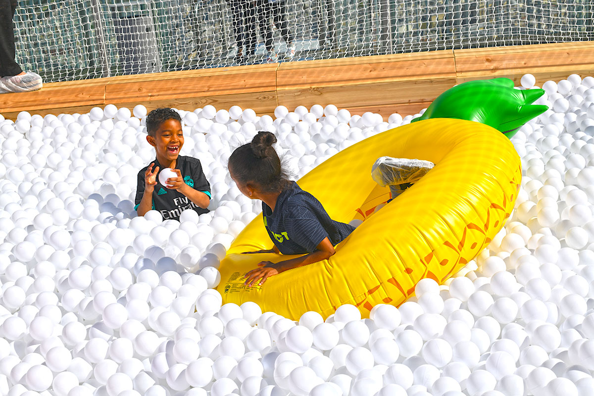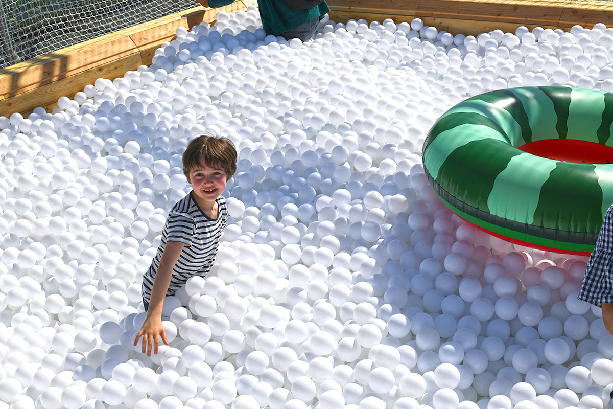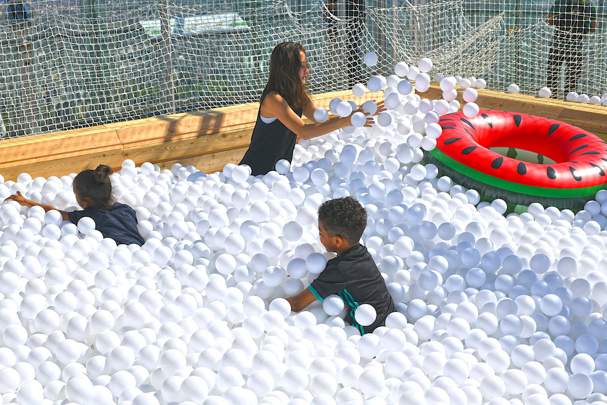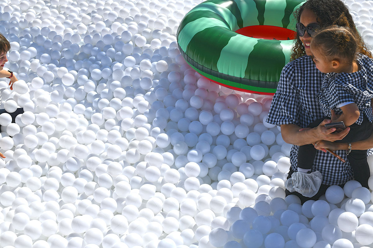 Pour cette installation éphémère, pas moins de 100 000 balles pour composer cette piscine insolite. D’une taille de 40m² elle est recouverte entièrement d’un filet de sécurité. Avec de magnifiques bouées flamant rose et ananas en prime !