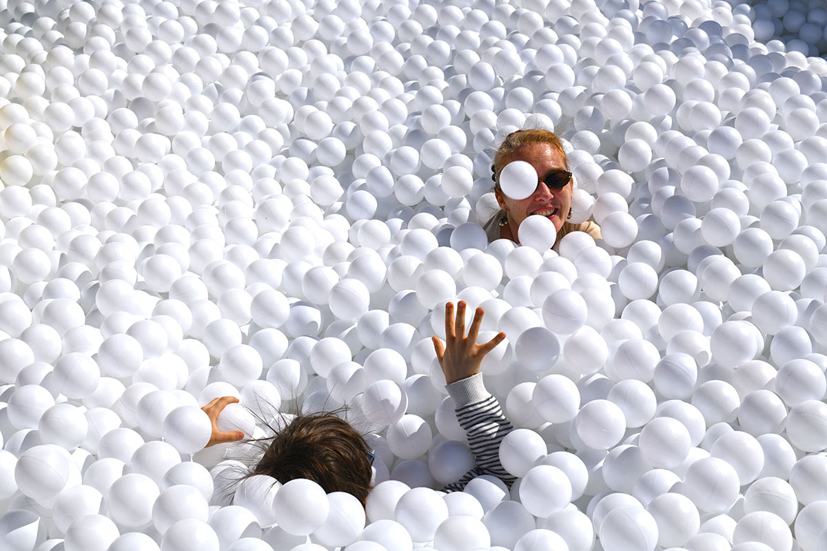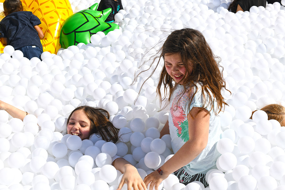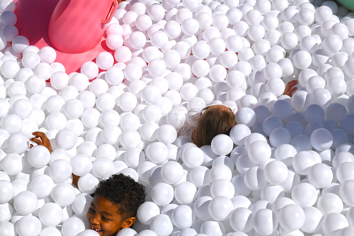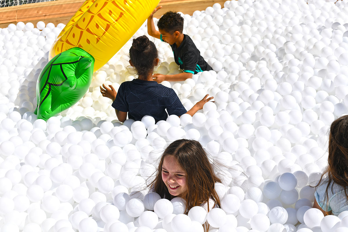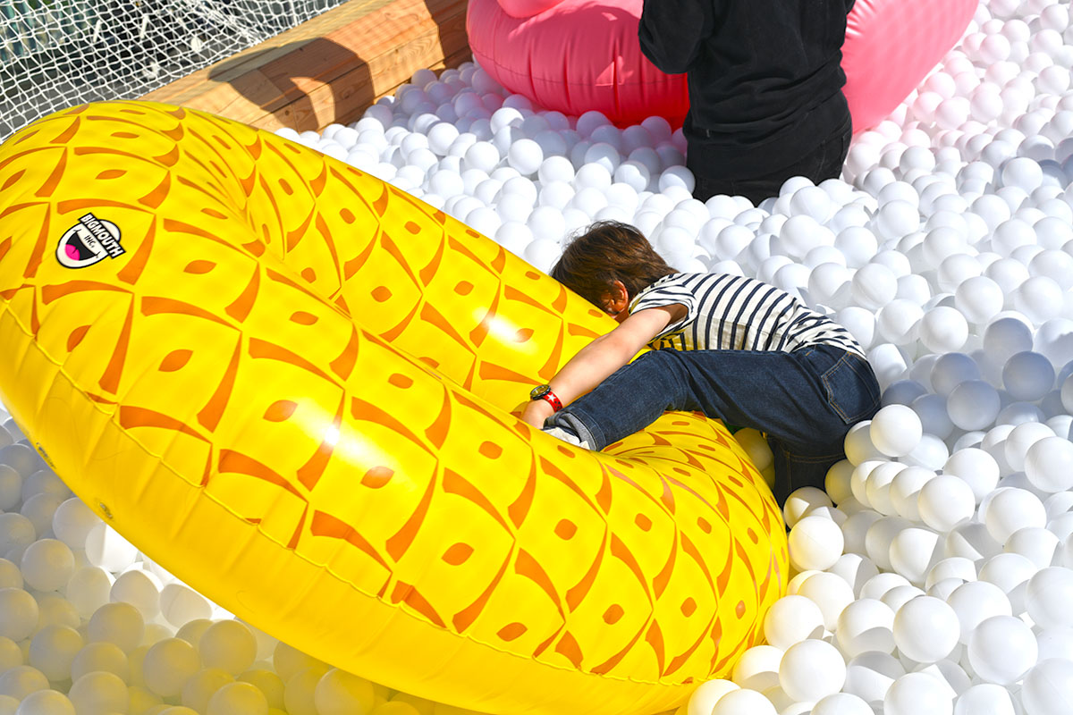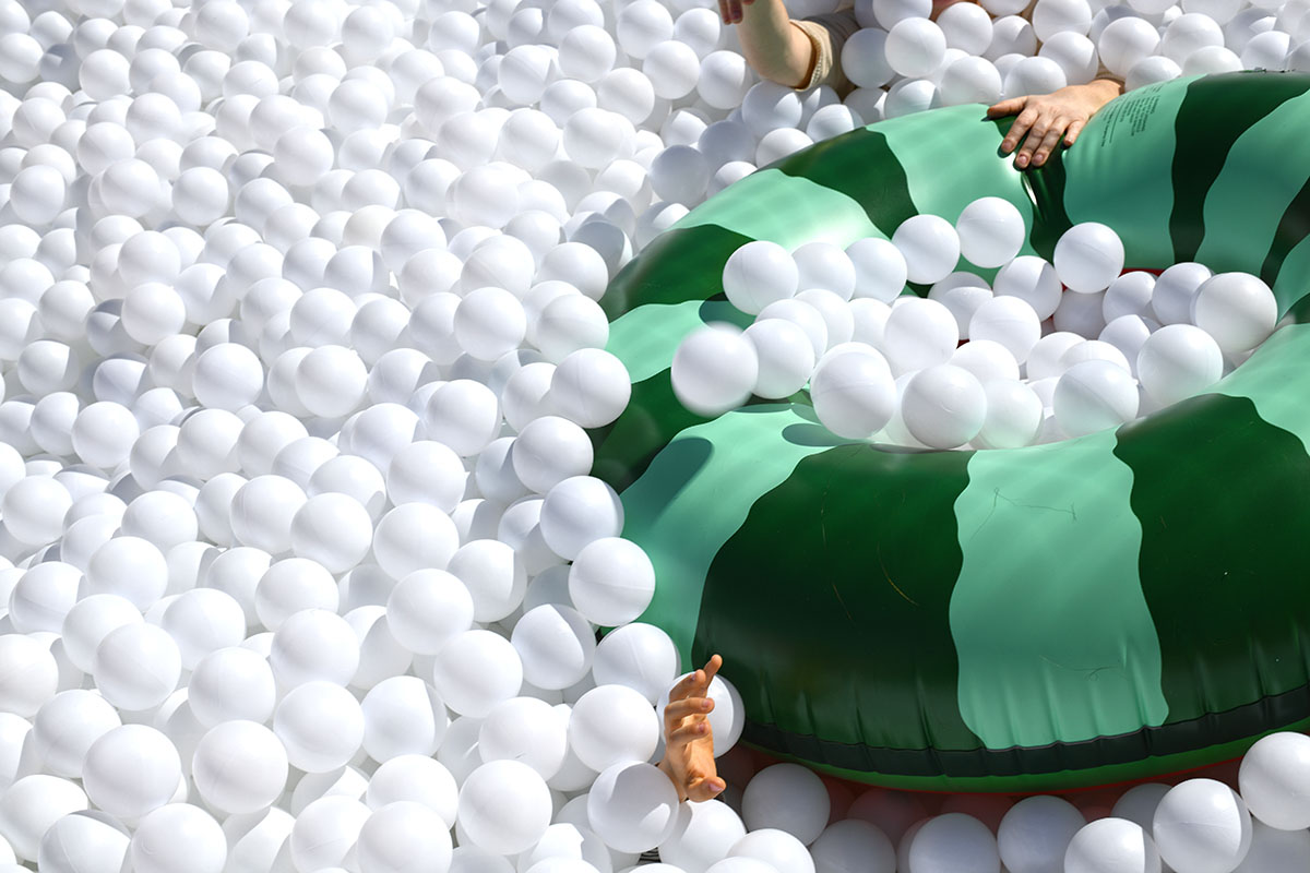 Pour cette installation éphémère, pas moins de 100 000 balles pour composer cette piscine insolite. D’une taille de 40m² elle est recouverte entièrement d’un filet de sécurité. Avec de magnifiques bouées flamant rose et ananas en prime !