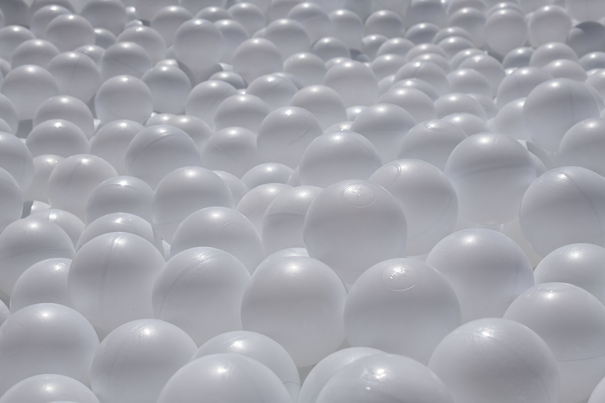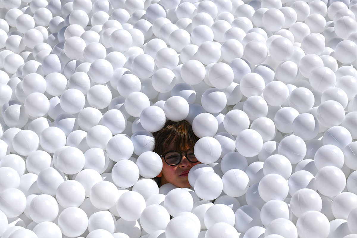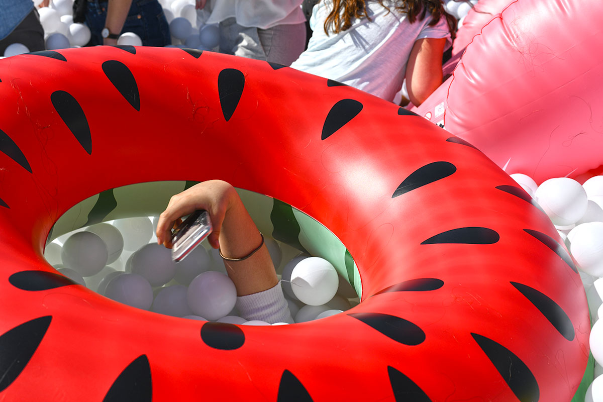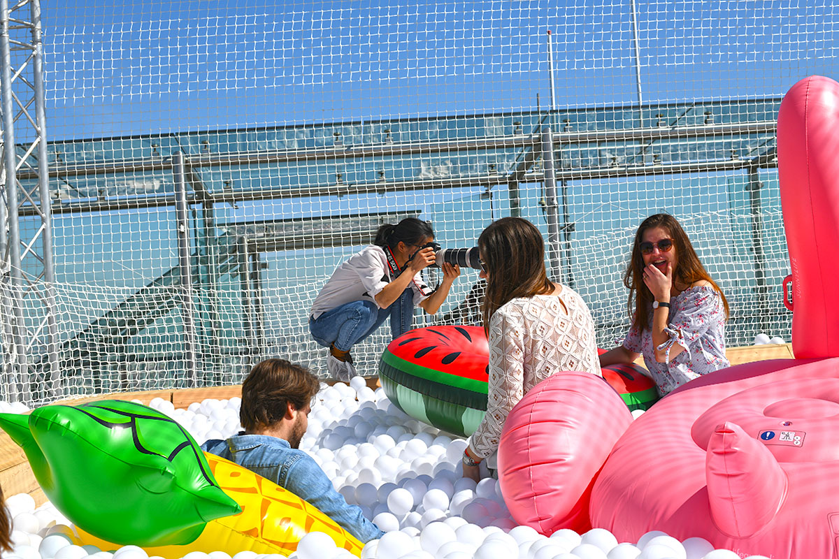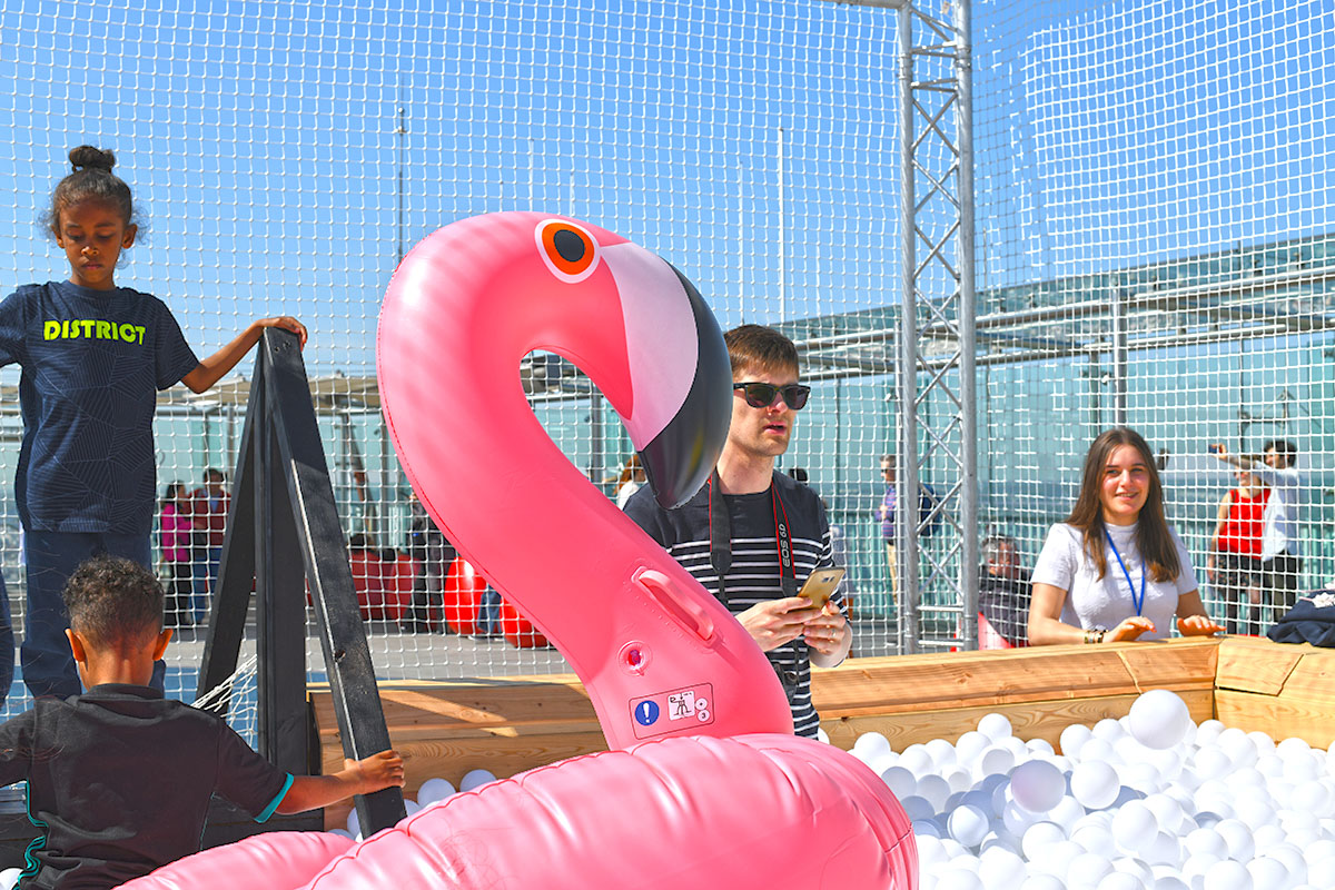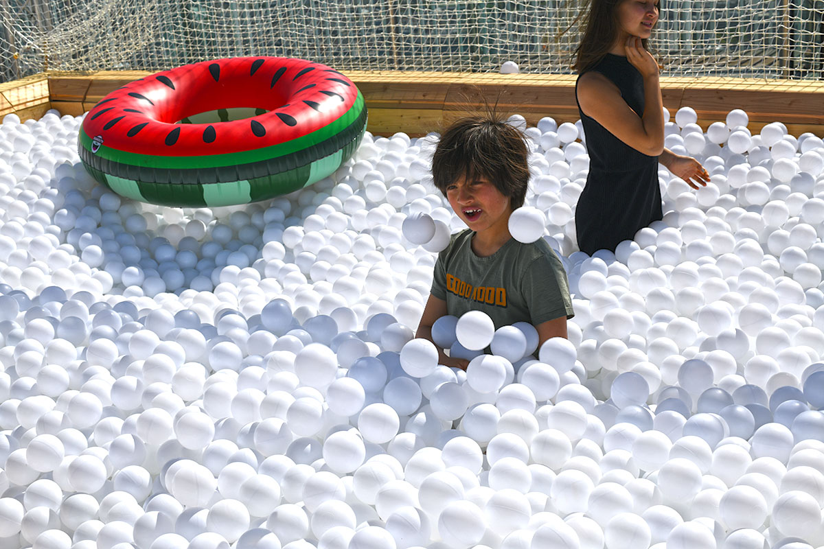 Pour cette installation éphémère, pas moins de 100 000 balles pour composer cette piscine insolite. D’une taille de 40m² elle est recouverte entièrement d’un filet de sécurité. Avec de magnifiques bouées flamant rose et ananas en prime !