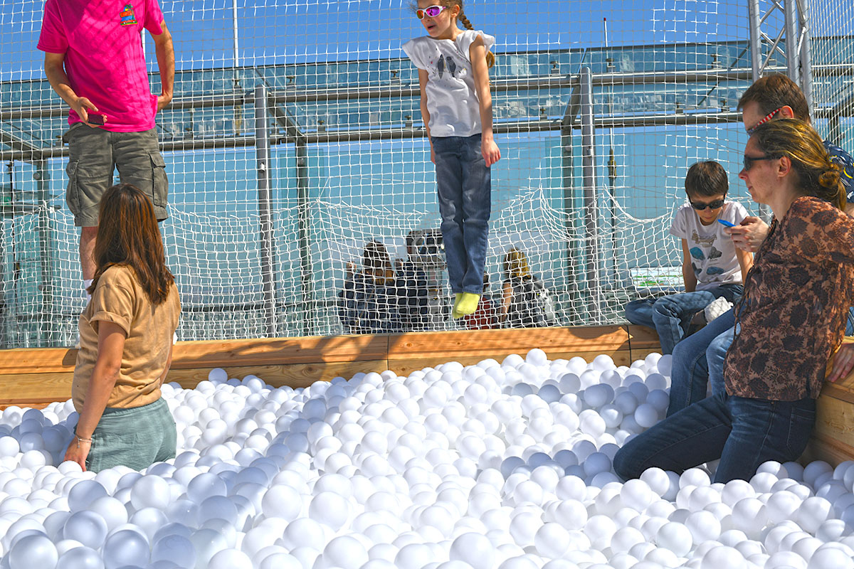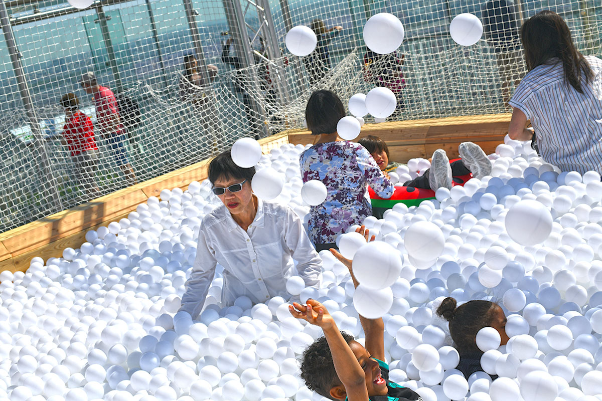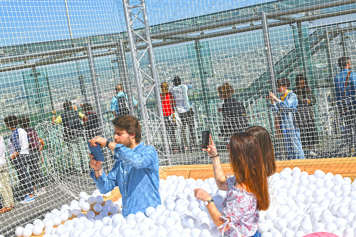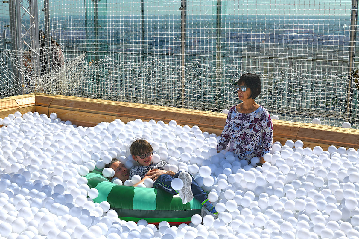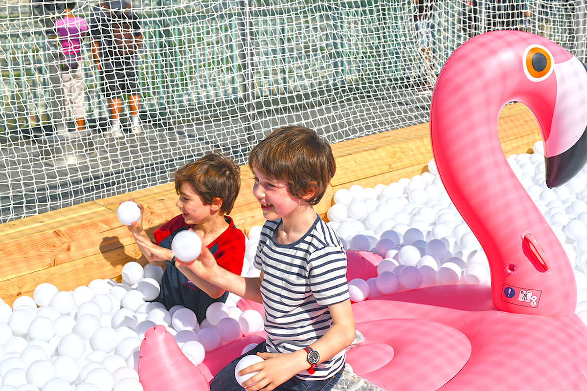 À côté quelques transats confortables seront installés pour tous ceux qui préfèrent se reposer. La Piscine à balles est gratuite, pour tous les détenteurs d’un billet d’accès à l’Observatoire Panoramique.