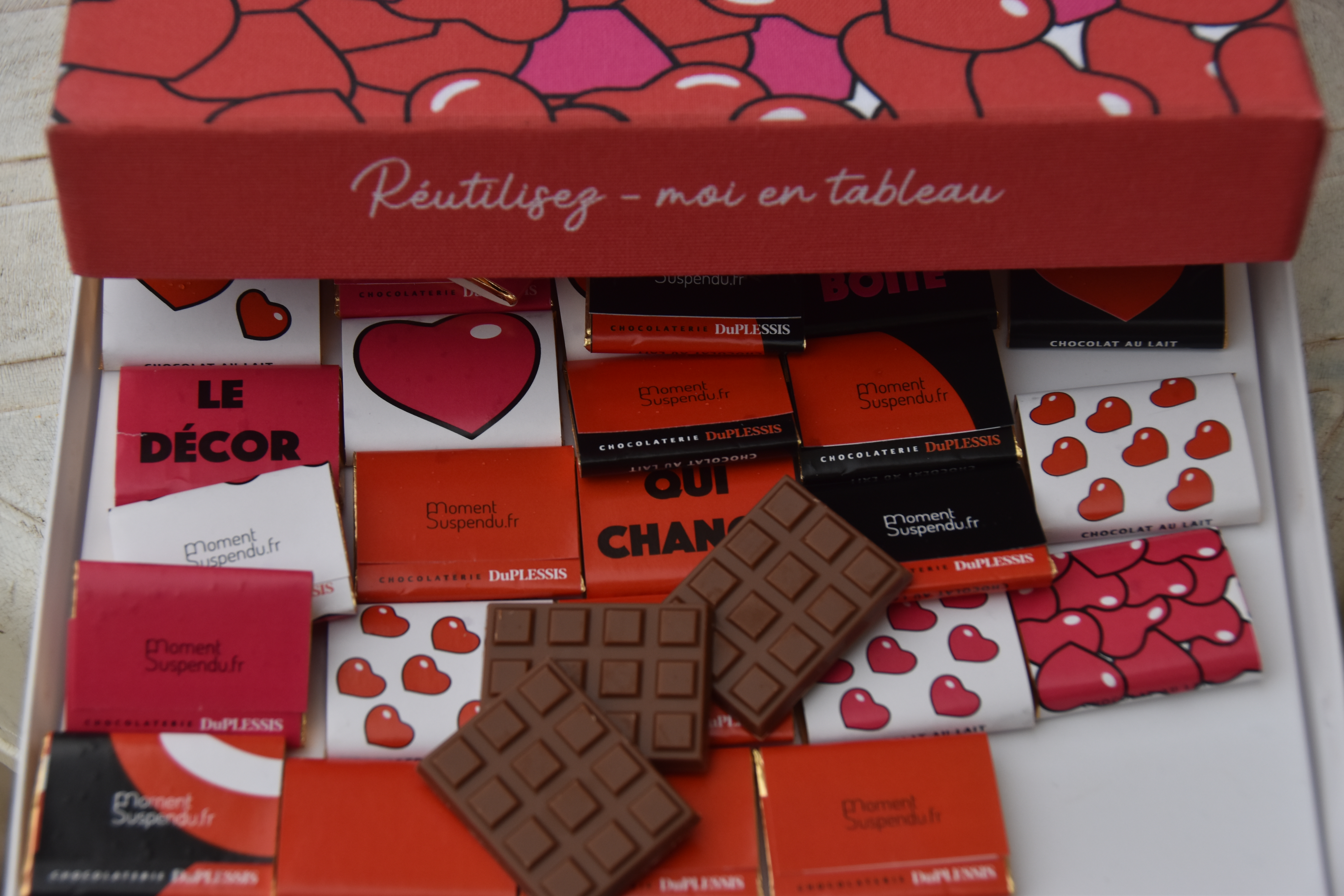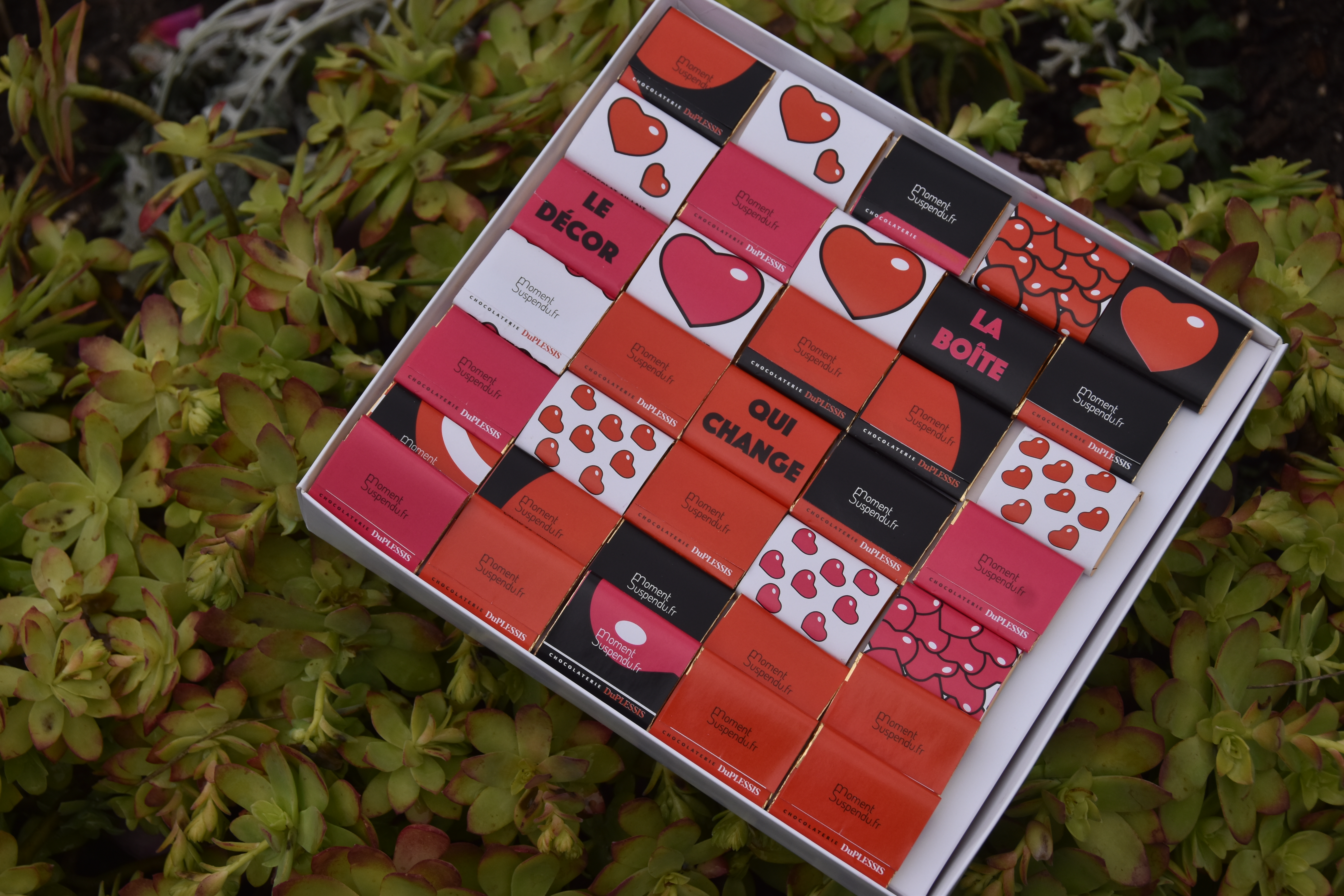 À la recherche d’une idée cadeau originale pour la Saint-Valentin ? Les Moments Suspendus redonnent du souffle et du sens à la boite cadeau en lui apportant une nouvelle fonction d’objet d’art. Les Moments Suspendus, c’est une sélection de coffrets chic pour emballer vos cadeaux, des boîtes de chocolats revisitées et des coffrets prêt à offrir qui laisseront un souvenir mémorable. Leur devise : ne jetons plus les emballages cadeaux, offrons leur une seconde vie ! La boite de chocolats réutilisable en tableau Saint-Valentin fera craquer l’élu de votre cœur ! Que ce soit pour votre Roméo ou pour votre Juliette, optez pour un cadeau de Saint-Valentin romantique, unique et insolite le 14 février 2021 ! Craquez pour cette collection gourmande aux couleurs de l’amour, offrez un cadeau gourmand, original et responsable !