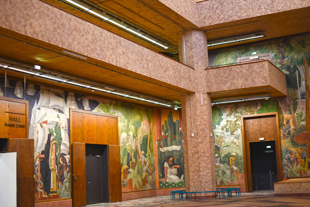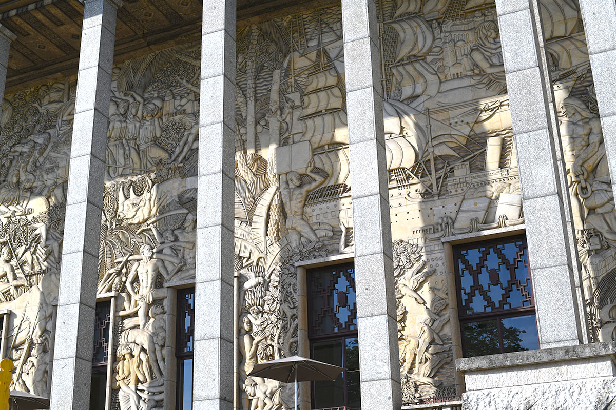 La façade est ornée d’un bas-relief dû à Alfred Janniot qui veut illustrer la richesse des colonies. À l’intérieur, dans la salle des fêtes, on découvre une grande fresque de Pierre-Henri Ducos de La Haille. L’édifice comporte de multiples éléments décoratifs d’inspiration exotique.