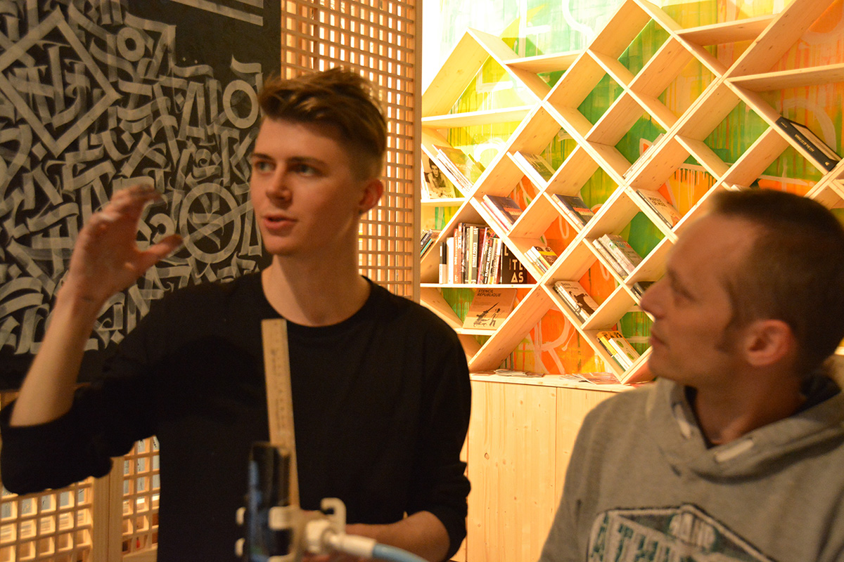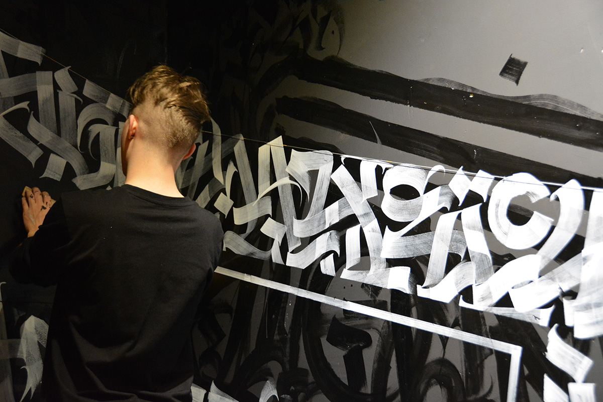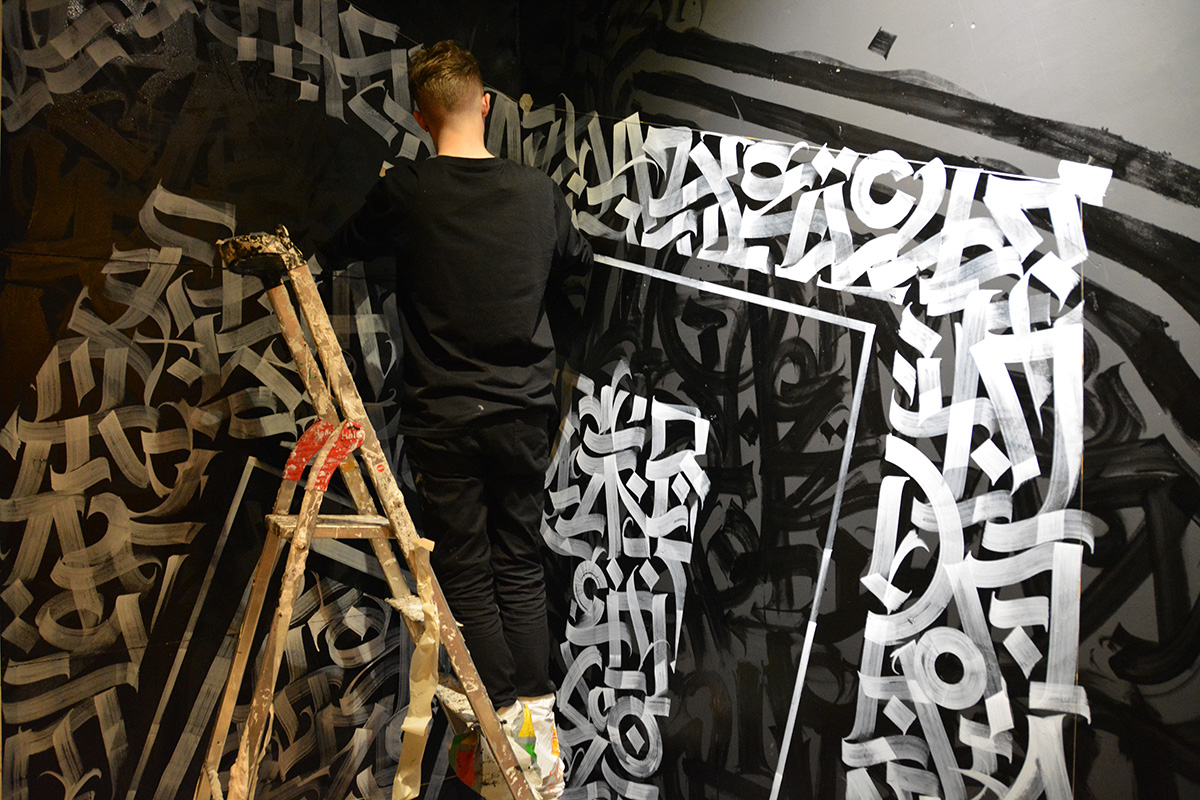 Amoureux de calligraphie moderne, l’artiste a dessiné sur un mur des calligraphies modernes… Etre aux premières loges d’une création, c’est vraiment magique… Un travail à la fois beau, inspirant et mystérieux…