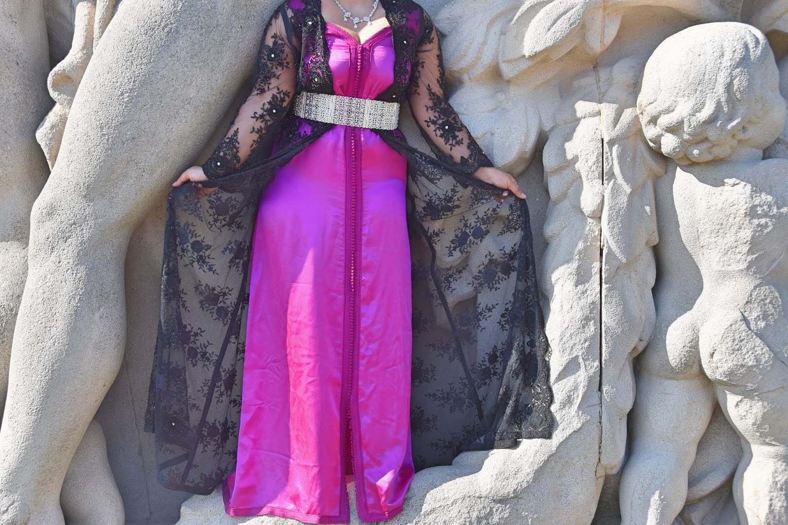 Raihnas_caftan a pour objectif de satisfaire sa clientèle avec élégance et raffinement. Elle propose un large choix de caftans et de tenues. Elle vous écoute, vous conseille, vous guide. Ce magnifique caftan rose fushia accompagnée d’une belle ceinture argenté typique du caftan marocain vous mettra en valeur pour toutes les occasions. La broderie du gilet est tout simplement sublime, le travail fait main est délicat et raffiné. Les motifs brodés sont magnifiques accompagnés de strass argentée. Ce caftan fait de vous une princesse des temps modernes.