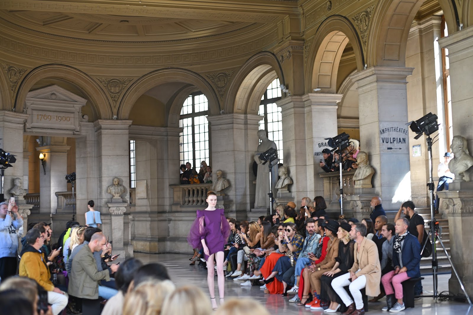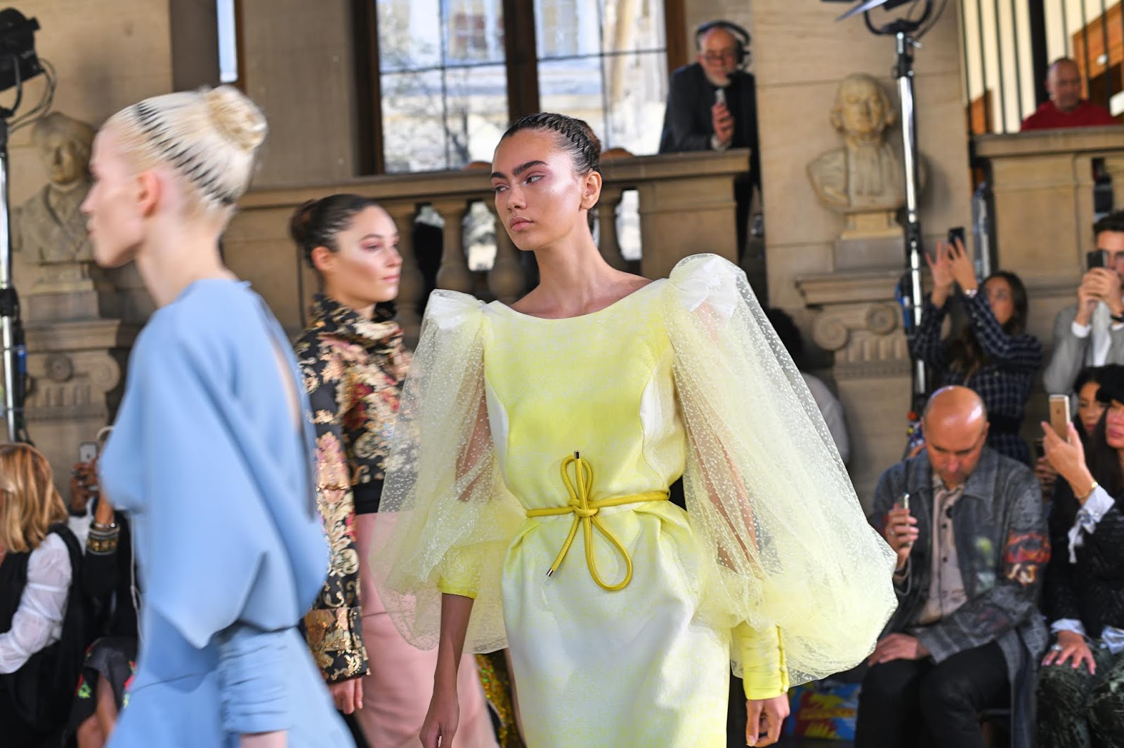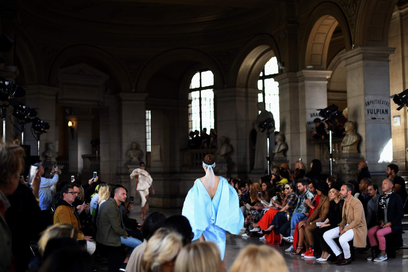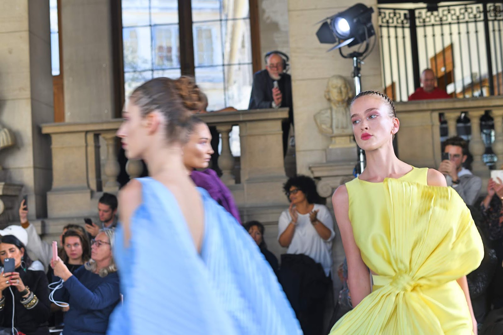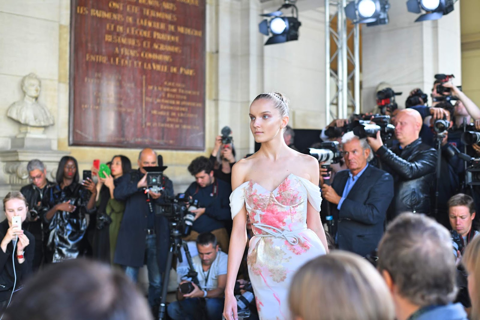 Lors du défilé, les lignes sont féminines avec de belles coupes. J’ai beaucoup apprécie les drapés, le taffetas de soie et les brocarts ainsi que les volumes 3D. C’était magnifique, il y avait une réelle fluidité dans les créations, un énorme travail du plissé. De plus, la coupe de certaines robes sont de véritable œuvres d’art. Les couleurs nude et pastel ont étaient mis à l’honneur pendant le défilé comme le jaune, le rose, le bleue contrastant avec le violet, c’était tout simplement sublime.