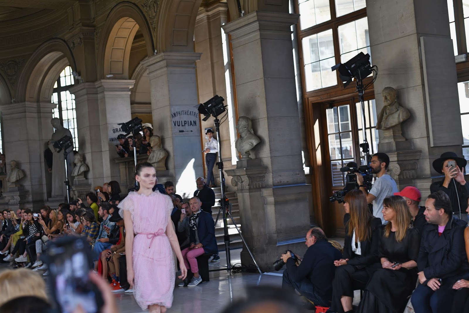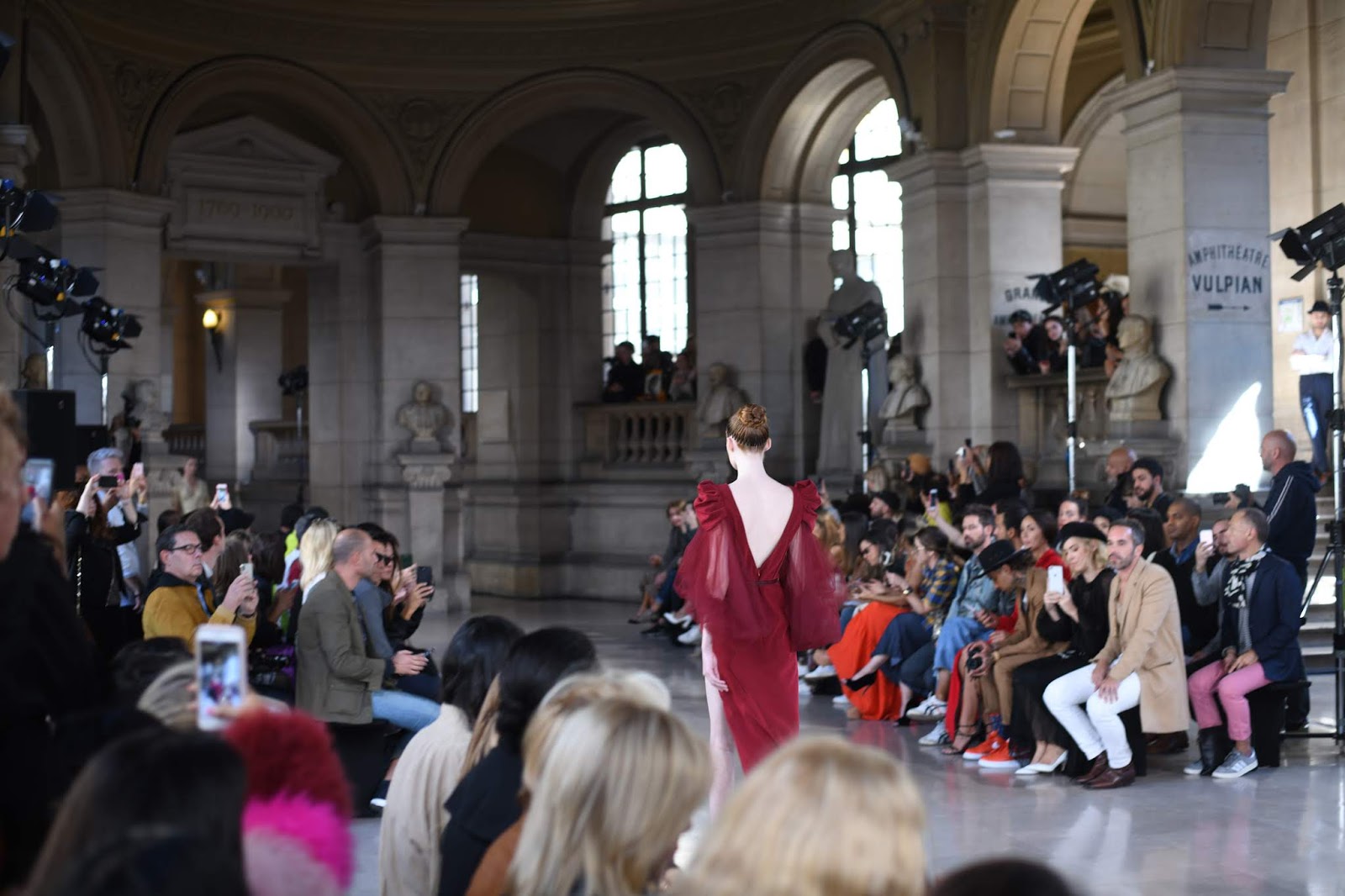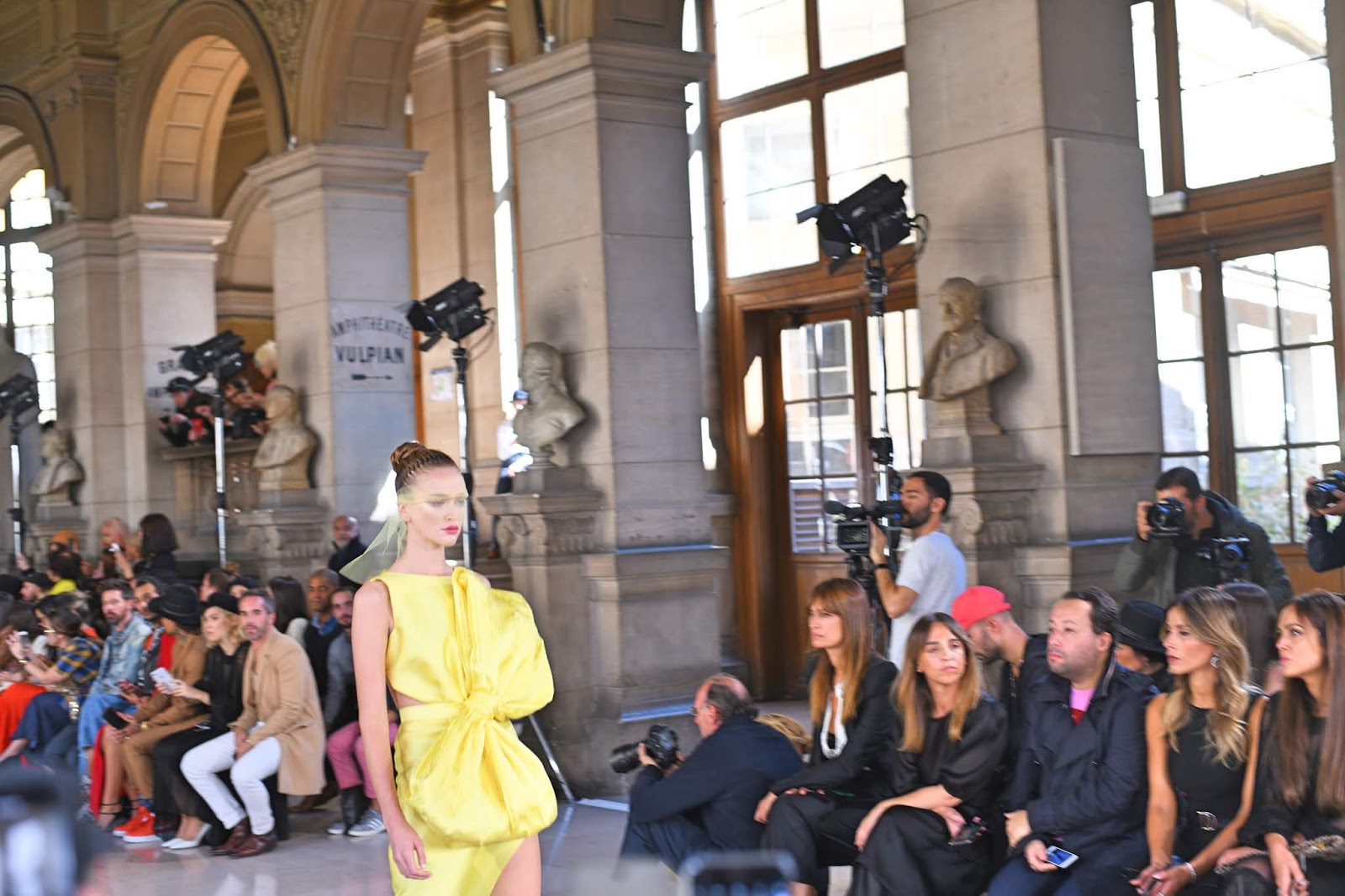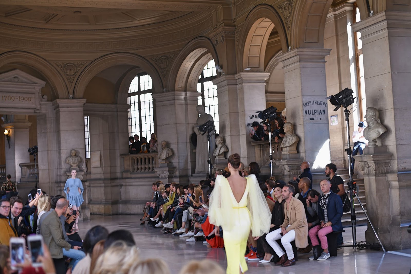 Lors du défilé, les lignes sont féminines avec de belles coupes. J’ai beaucoup apprécie les drapés, le taffetas de soie et les brocarts ainsi que les volumes 3D. C’était magnifique, il y avait une réelle fluidité dans les créations, un énorme travail du plissé. De plus, la coupe de certaines robes sont de véritable œuvres d’art. Les couleurs nude et pastel ont étaient mis à l’honneur pendant le défilé comme le jaune, le rose, le bleue contrastant avec le violet, c’était tout simplement sublime.