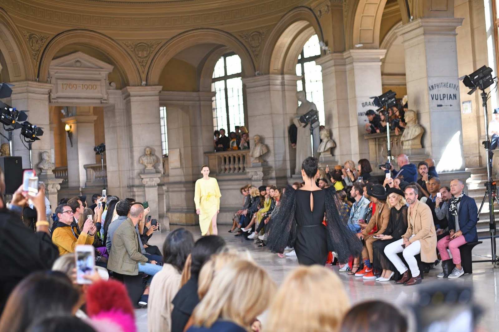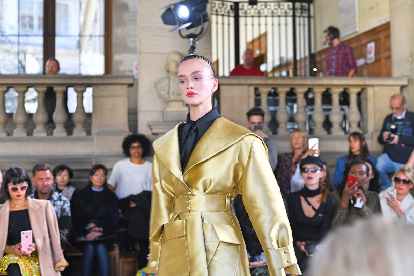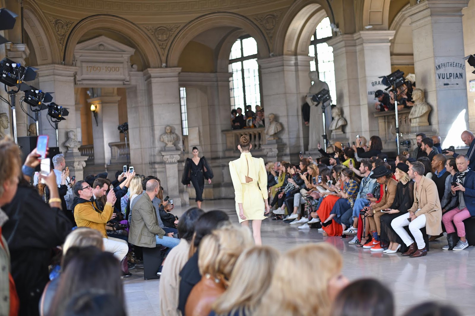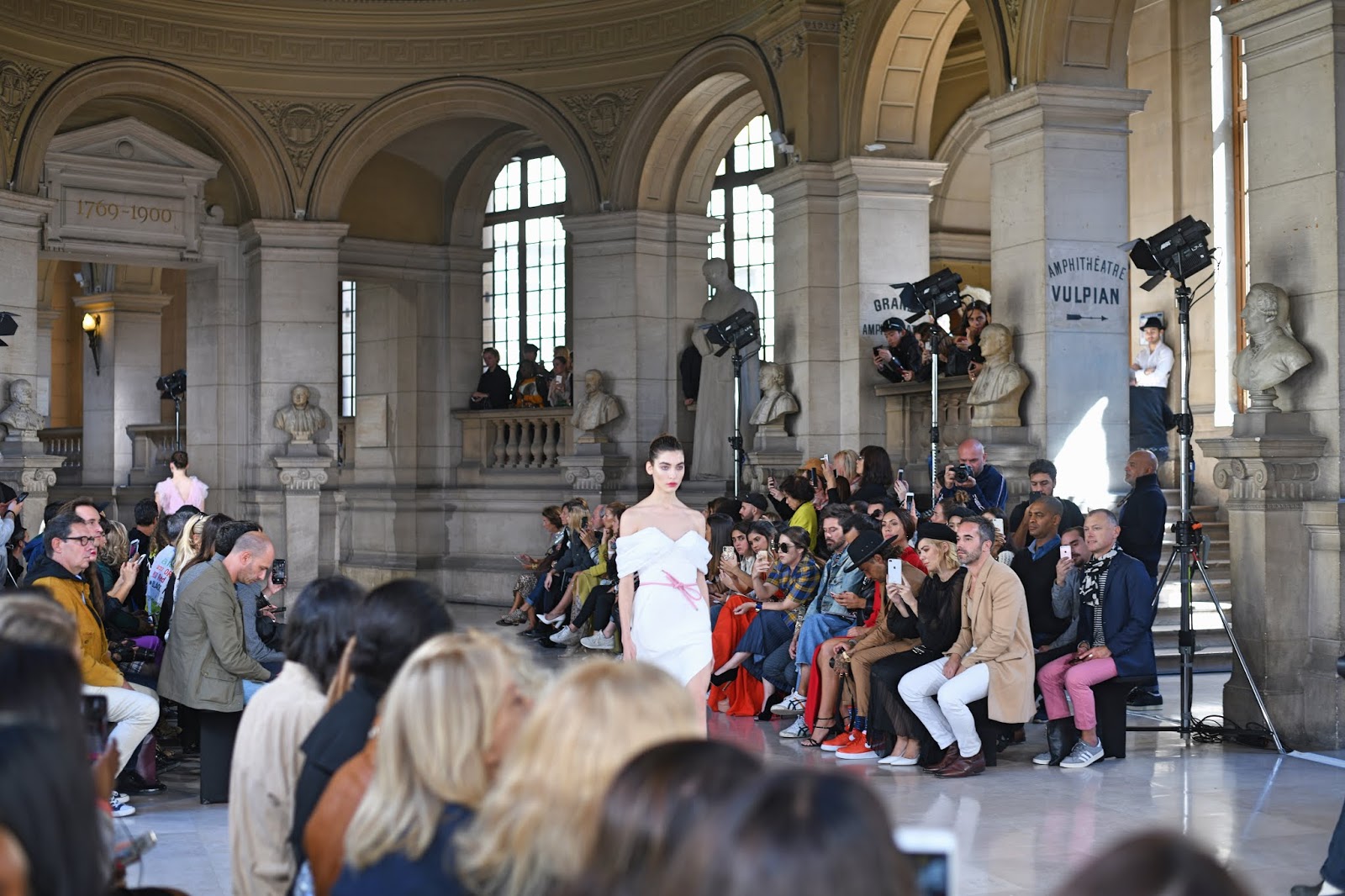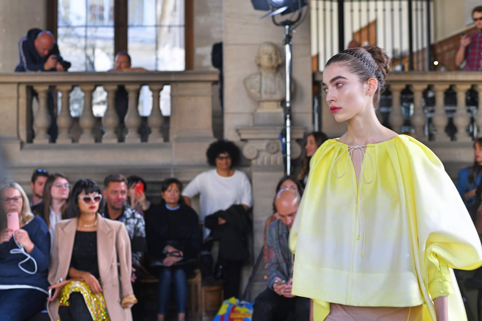 Lors du défilé, les lignes sont féminines avec de belles coupes. J’ai beaucoup apprécie les drapés, le taffetas de soie et les brocarts ainsi que les volumes 3D. C’était magnifique, il y avait une réelle fluidité dans les créations, un énorme travail du plissé. De plus, la coupe de certaines robes sont de véritable œuvres d’art. Les couleurs nude et pastel ont étaient mis à l’honneur pendant le défilé comme le jaune, le rose, le bleue contrastant avec le violet, c’était tout simplement sublime.