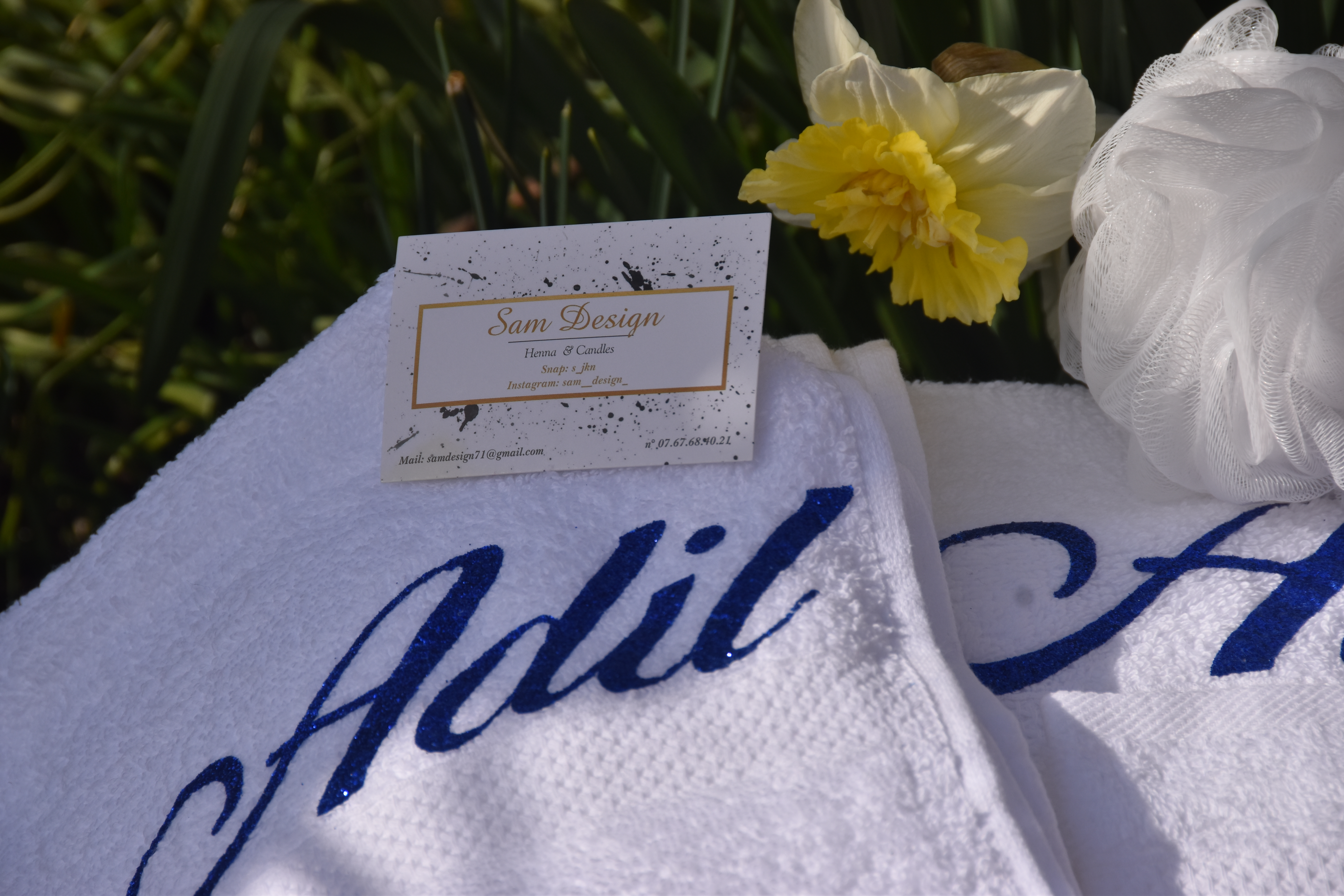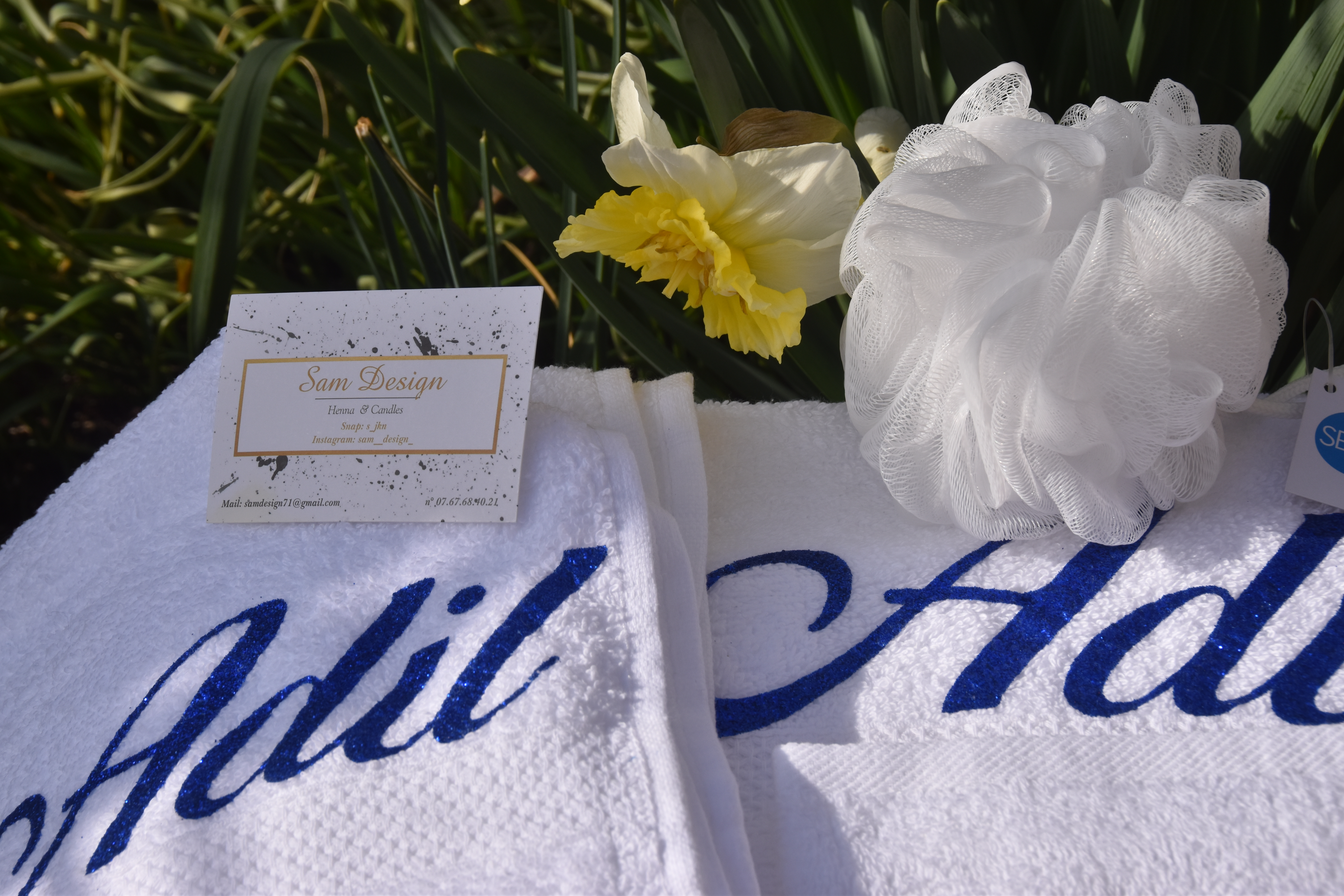 Sam Design propose un flocage qui permet de personnaliser le textile mais pas seulement. Elle propose plusieurs coffrets, la Baby box, c’est un coffret complet composé de plusieurs pièces, la Bride Box, avec un peignoir, une nuisette offerte, un cintre, des pantoufles jetables ou pas et pour finir la Bath Box, composée de 3 serviettes (grande, moyenne, petite, gant, fleur de bain). Elle réalise également du henné et de la location. Mention spéciale pour la Bath Box qui est un cadeau totalement original et qui fera forcément plaisir ! Je suis complètement fan de l’effet pailleté, le résultat est tout simplement sublime. L’effet « wow » est immédiat ! De plus, pour chaque commande de coffret, un cadeau est offert et pour chaque commande de peignoir, la nuisette est offerte !