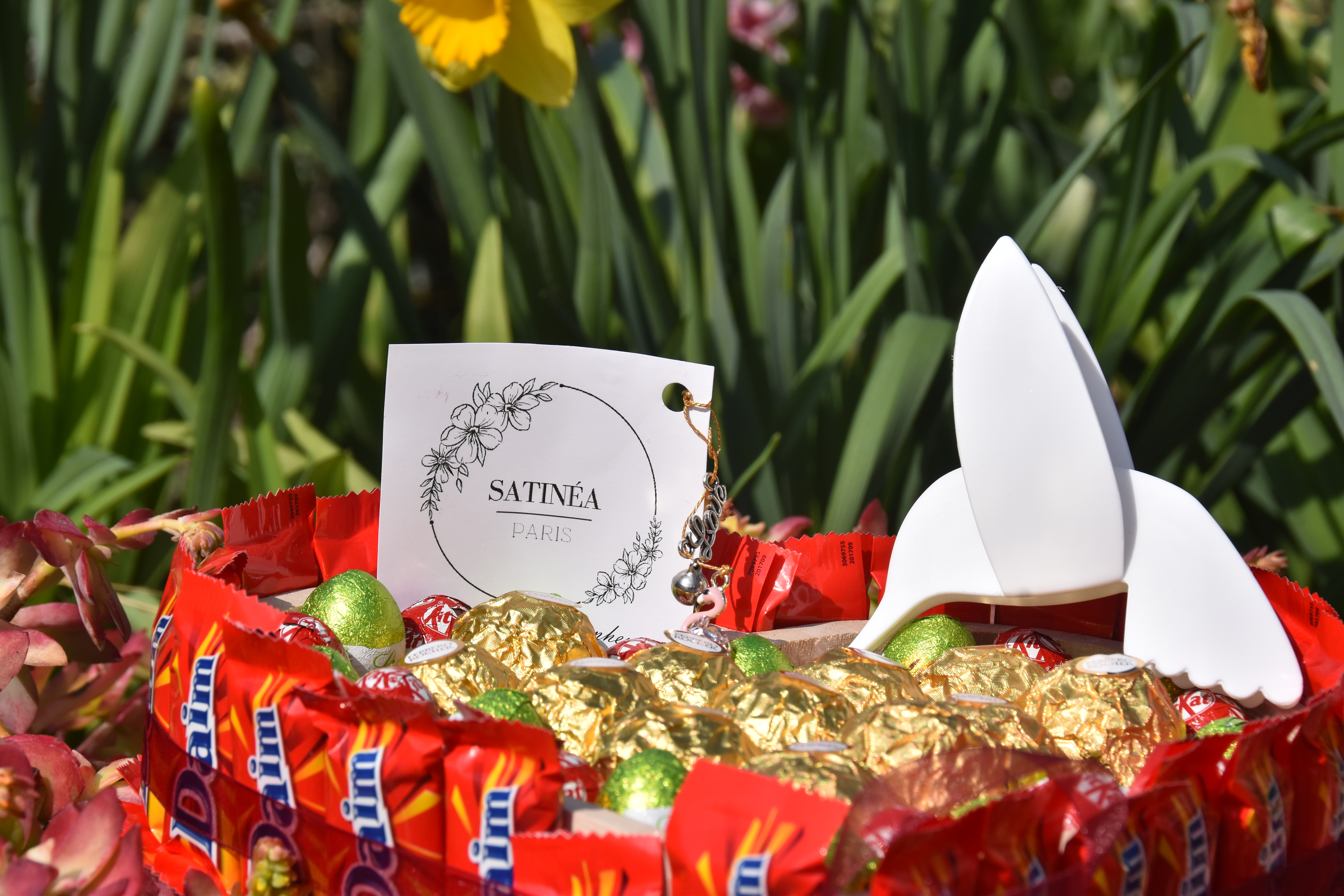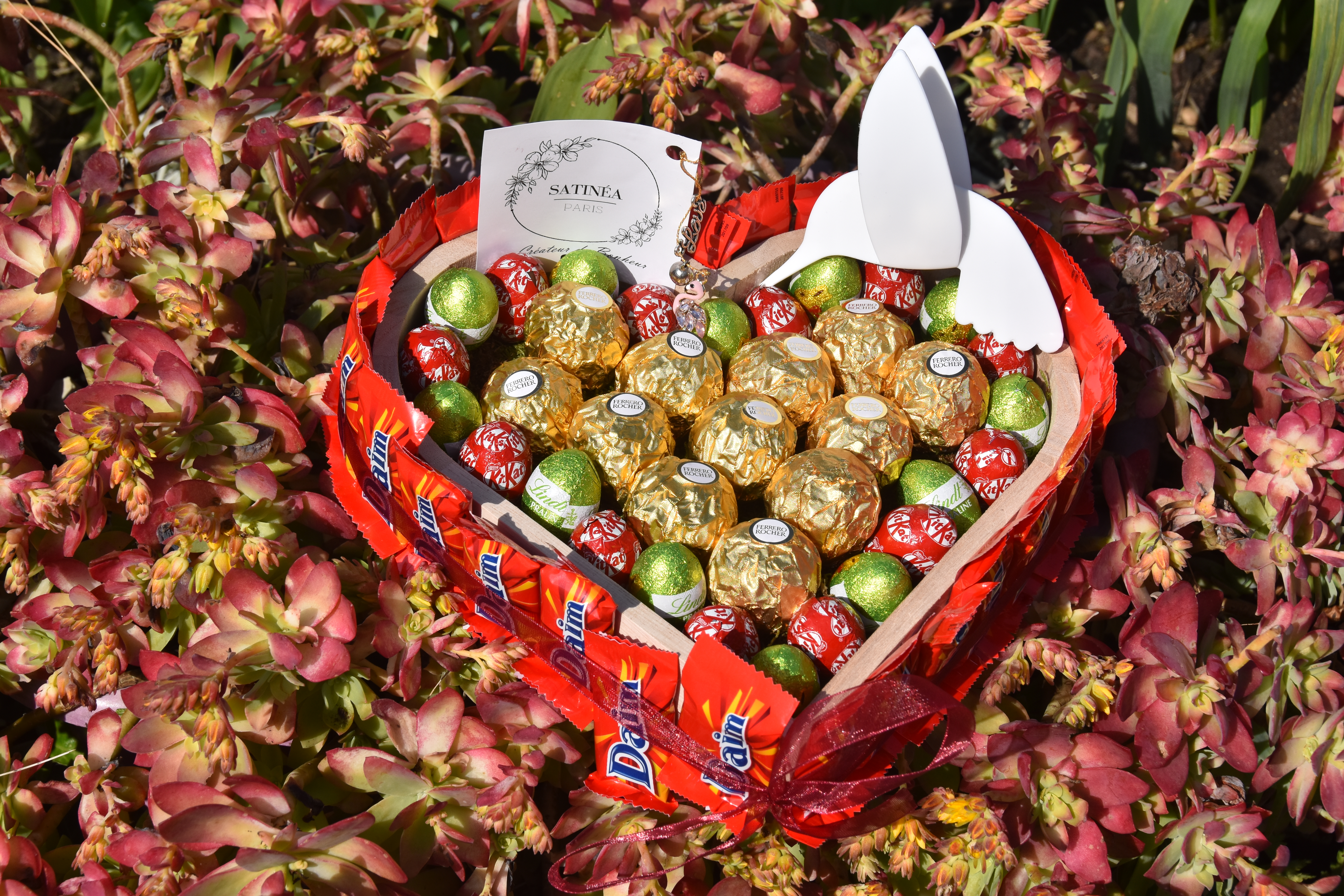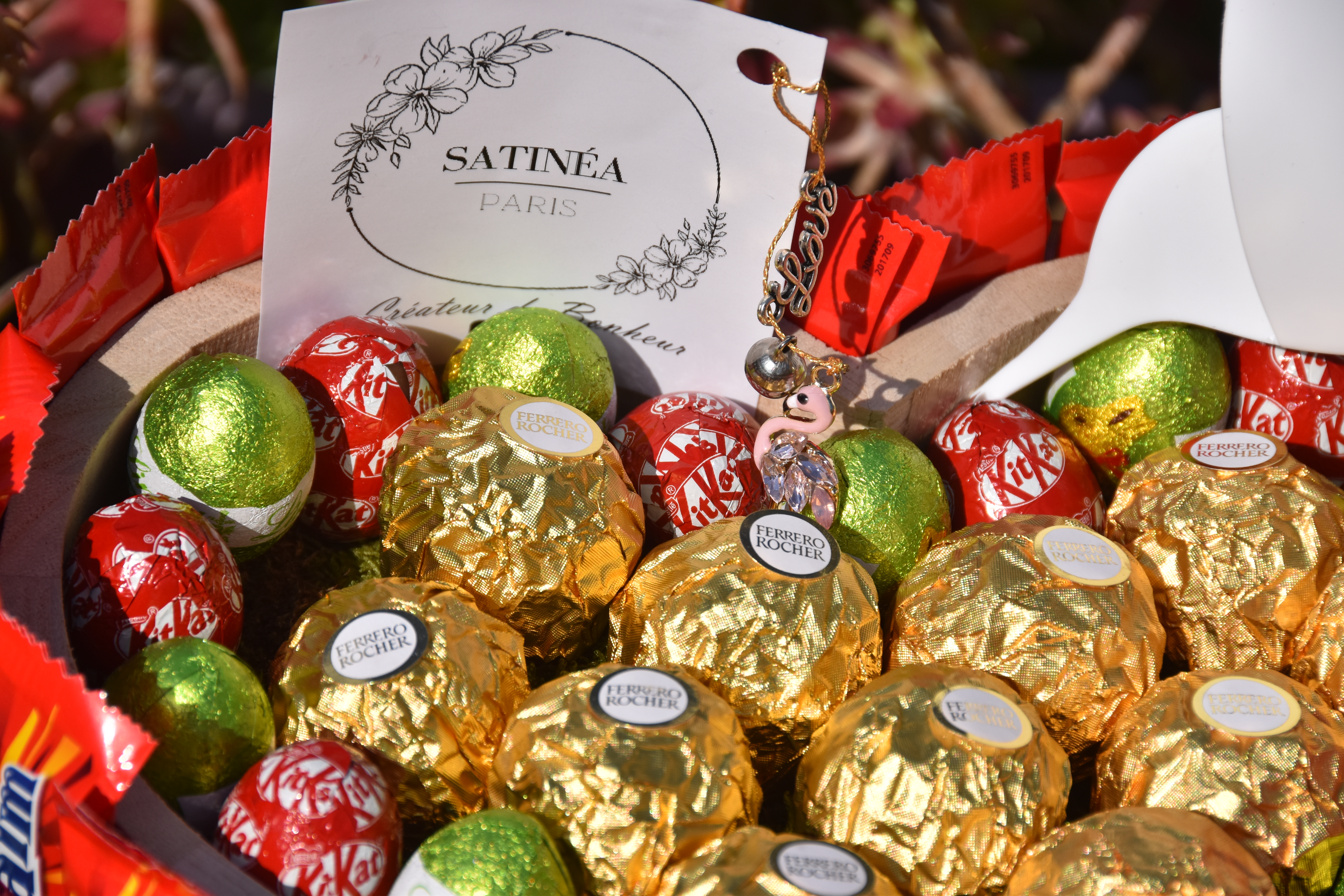 VĂ©ritable trĂ©sor gourmand qui regroupe une panoplie de dĂ©licieuses gourmandises, j’ai eu un vĂ©ritable coup de cĆur pour la crĂ©ation intitulĂ© « l’amour Ă©ternel« , ce magnifique cĆur en bois garnit de confiseries dans un joli Ă©crin de verdure garni de Fererro, Lindt egg, Kit kat egg. SatinĂ©a Paris propose divers Ă©crins personnalisĂ©s accompagnĂ©s de confiseries. Cela vous permettra de faire plaisir Ă votre entourage visuellement et Ă travers leurs papilles. De plus, aprĂšs avoir dĂ©gustĂ© l’ensemble des confiseries, le/la chanceu(se) pourra conserver l’Ă©crin comme un Ă©lĂ©ment de dĂ©coration. Tout est dit dans son nom, »l’amour Ă©ternel », ce coffret propose de goĂ»ter aux saveurs les plus gourmandes, des petits bijoux de gourmandises Ă offrir ou sâoffrir. Avec des saveurs variĂ©es et des associations raffinĂ©es, vous ĂȘtes aussi sĂ»r de faire le bonheur de vos heureux destinataires avec SatinĂ©a Paris !