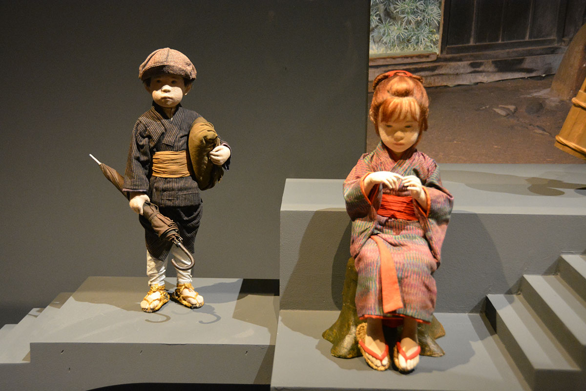 Les costumes en tissus japonais anciens (principalement du coton) évoquent la silhouette des Japonais de la fin du XIXe et du début du XXe siècle. Mais il y a une particularité qu’il faut signaler c’est la couleur des cheveux des figurines qui diffère des cheveux des japonais qui est noir une nuance singulière à l’univers unique de l’artiste ATAE Yûki.